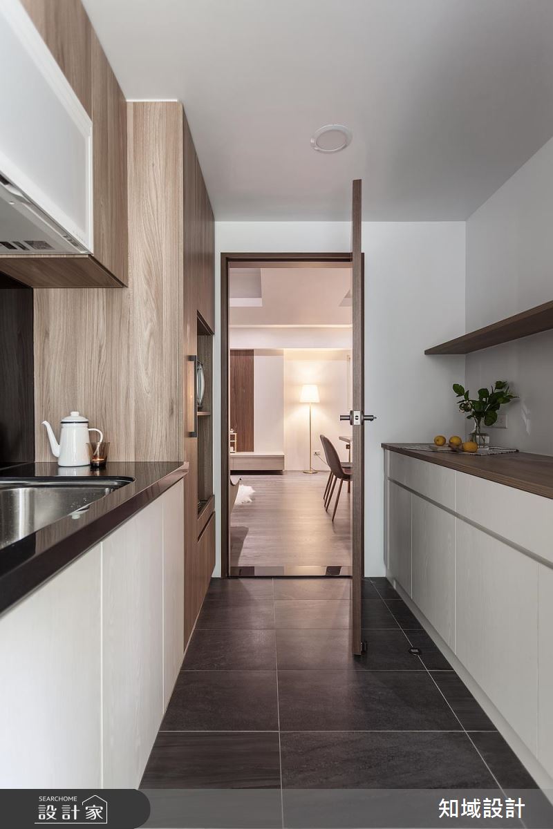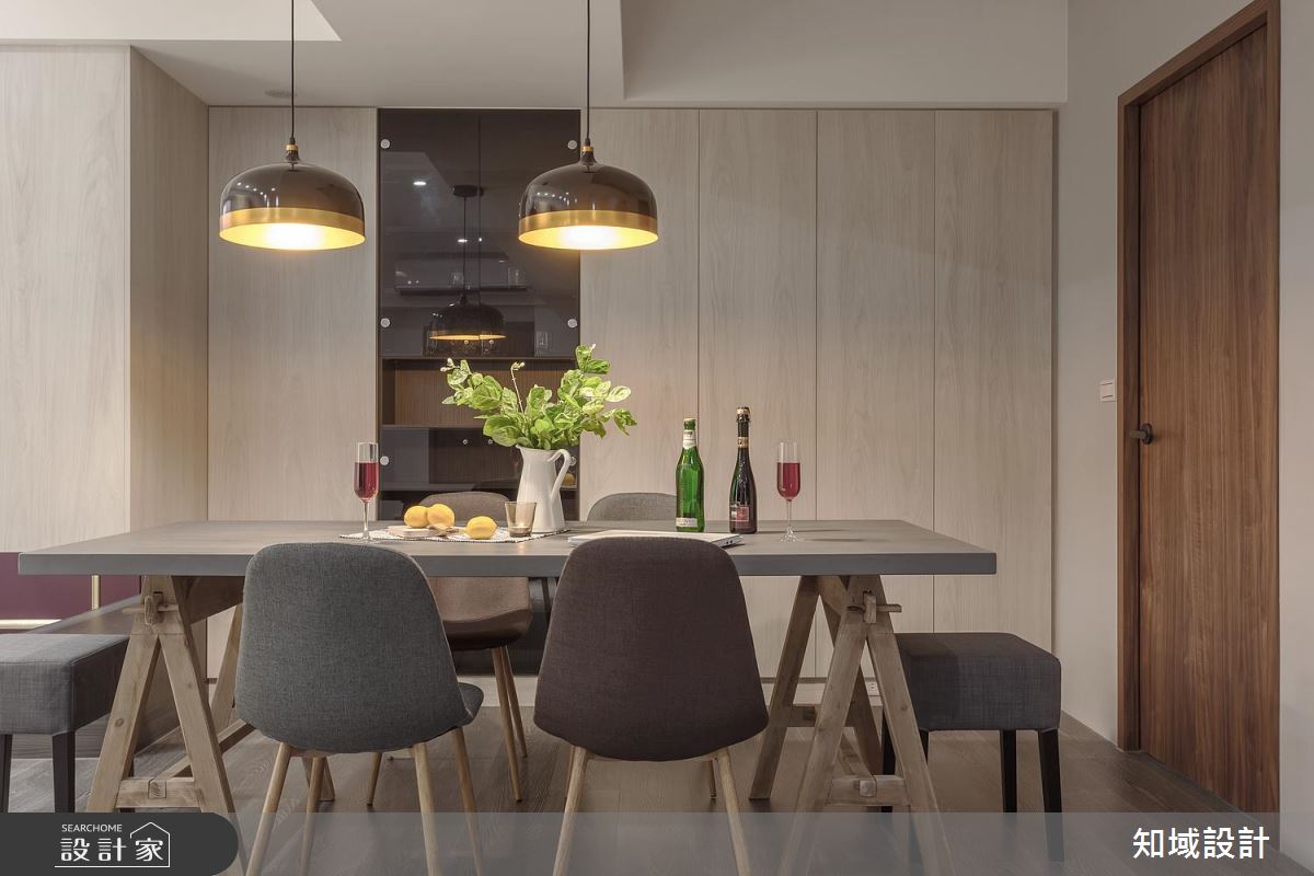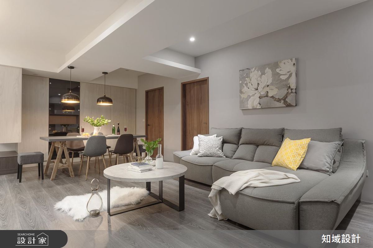 公領域不刻意隔出玄關,並以全開放設計串連客、餐廳,並採用色調輕淺的木元素及冷色調;另外耐磨地板採順應長邊軸線的技巧鋪設,更考慮到老屋常有樓板過低問題,因此保留原始屋高,成功放大視覺感受。利用木皮櫃門與黃光中和了灰階油漆與沙發的冷調性質,搭配木質長桌與大地色調單椅,讓用餐時光更添食慾,並巧妙利用 T 字大樑成為空間分野。因應烹飪習慣維持獨立廚房,並以雙排設計增加烹飪流暢度。