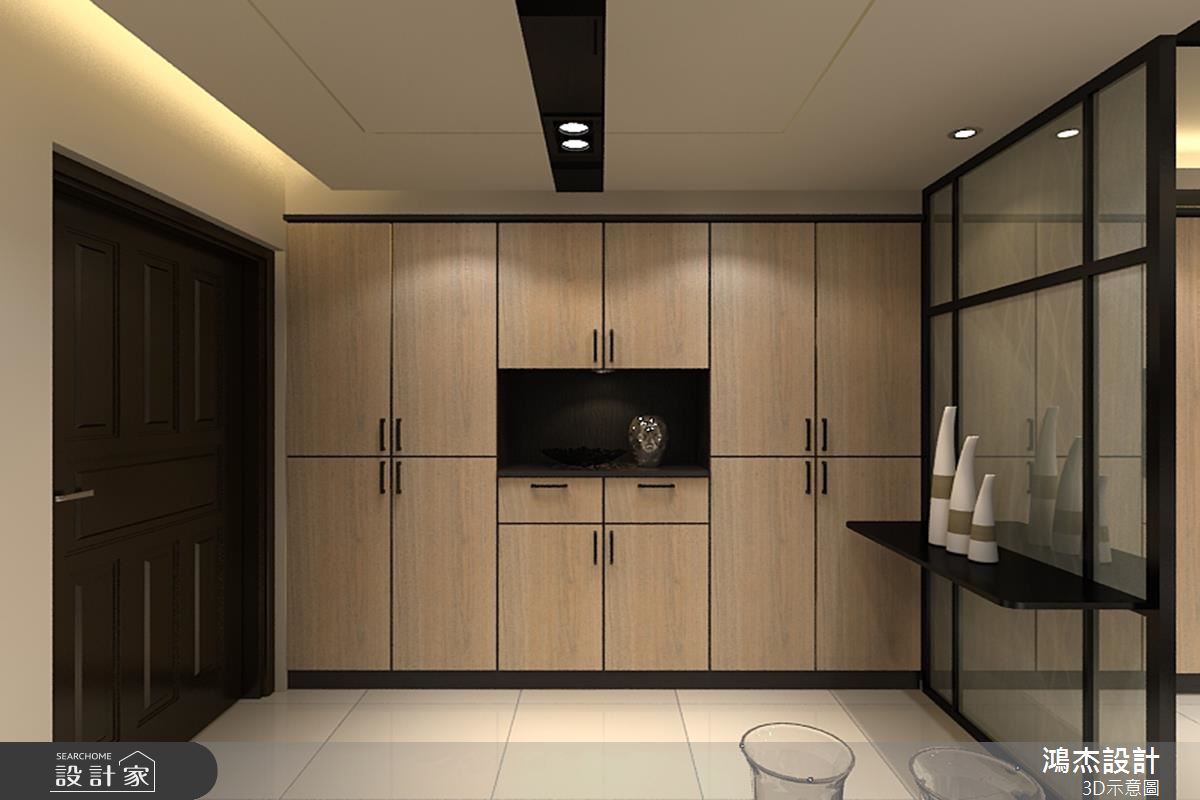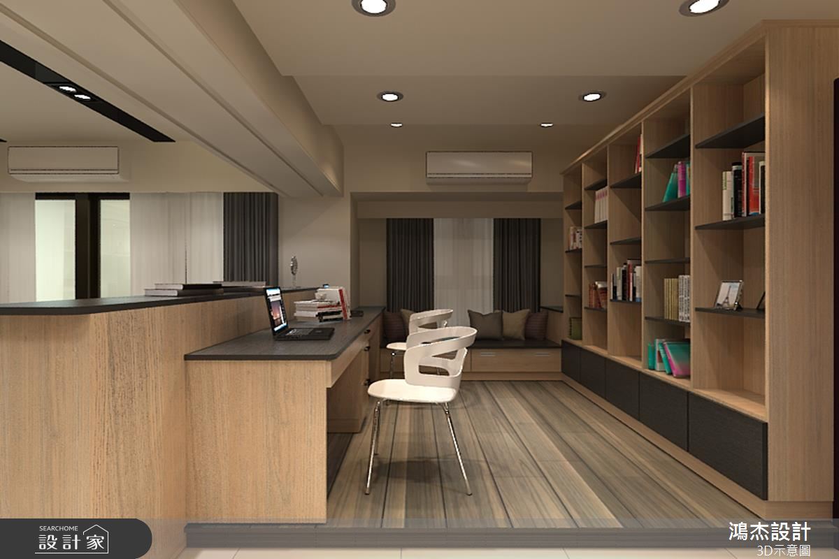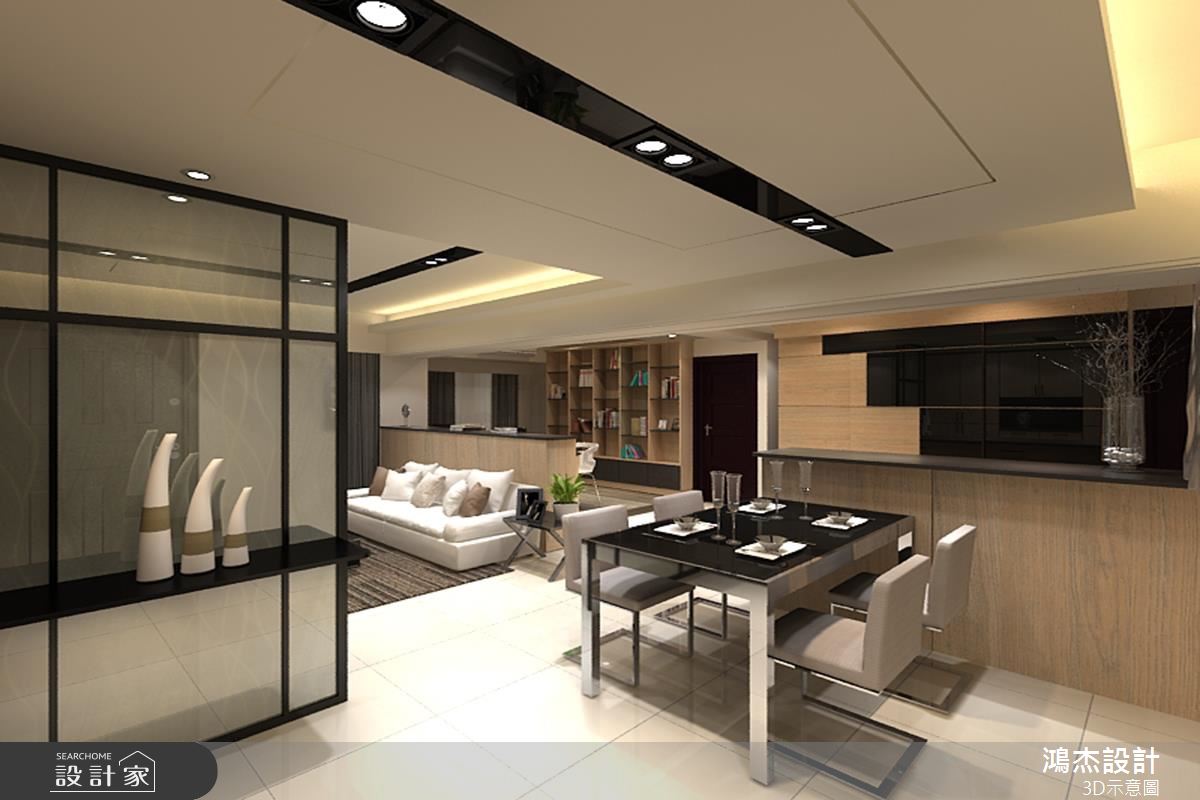 簡約感的現代風遊走在空間裡,以黑白色系為基底,並藉由原木質感的元素予以妝點,展現動人的溫馨情誼。旋開大門步入玄關,系統櫃打造整面鞋櫃造型,中央飾以開放的展示機能,打造美感與實用兼具的設計;玄關處藉由玻璃與鐵件創造隔屏,巧妙劃分內外領域,透視的材質特色,讓空間得以更加延伸、寬敞;開放的公領域裡,客、餐廳相容一室,電視牆結合收納、展示機能,增添活潑的設計美感;客廳後方則以架高木底板創造書房領域,大面積書櫃可容納豐富藏書,臨窗臥榻區滿足悠閒的美好時光;餐廳的壁面結合藝術質感的畫作妝點,挹注美學色彩,後方設以一座中島,讓好友相聚時可盡情暢飲,在通往私領域的轉角壁面,則利用墨鏡與木作堆疊,呈現階梯式漸層造型之美。