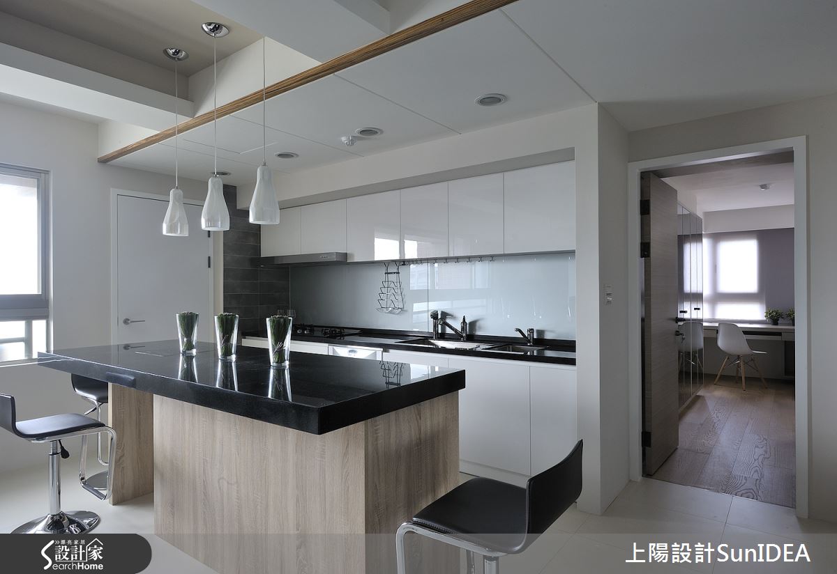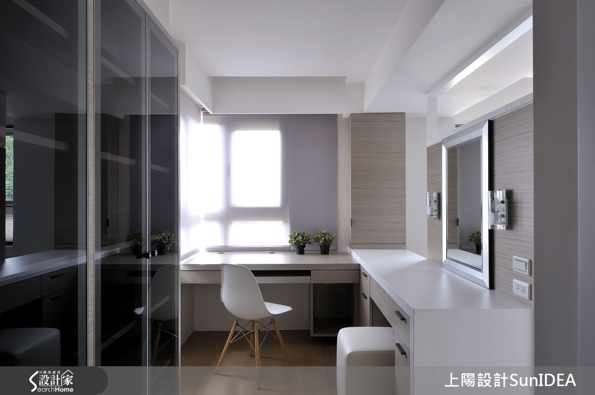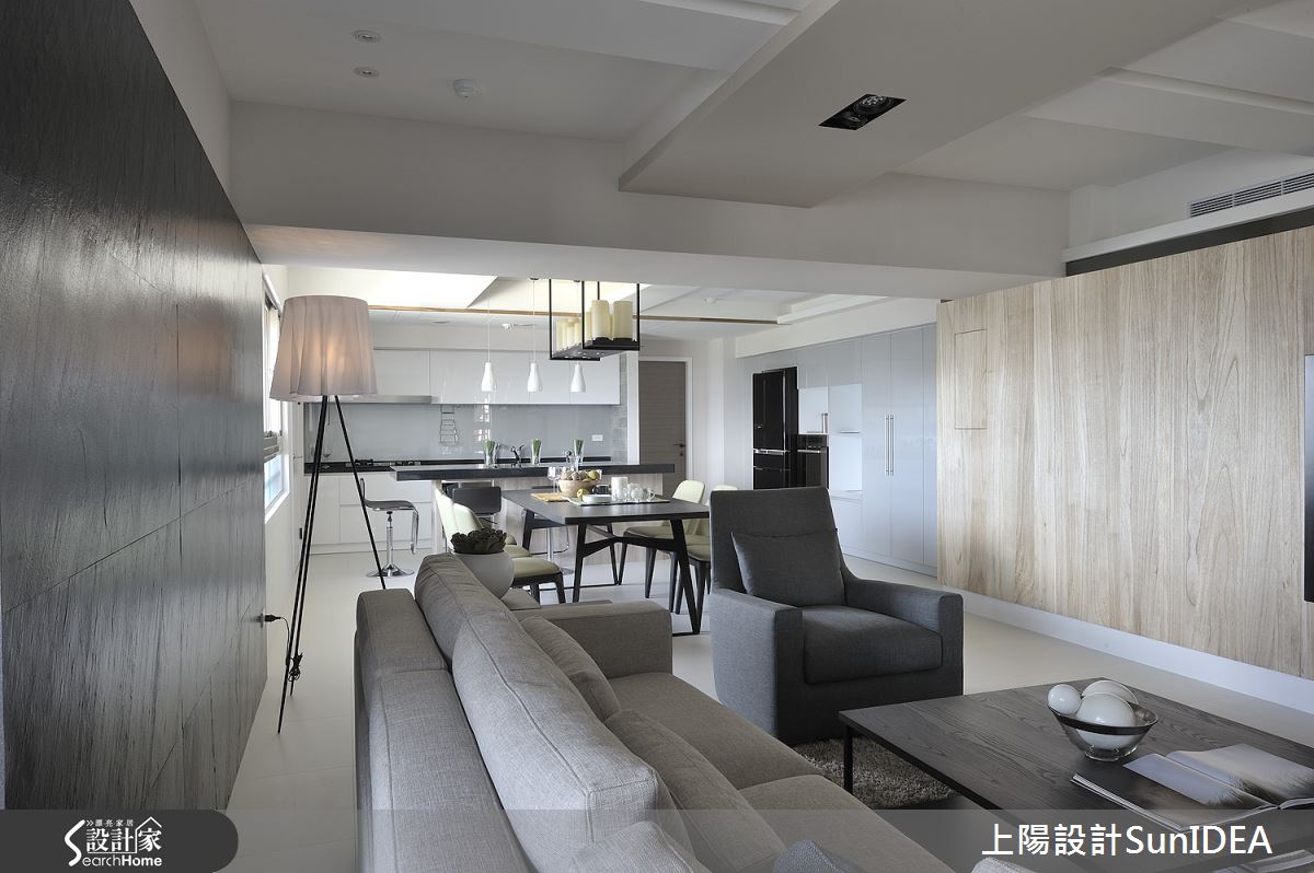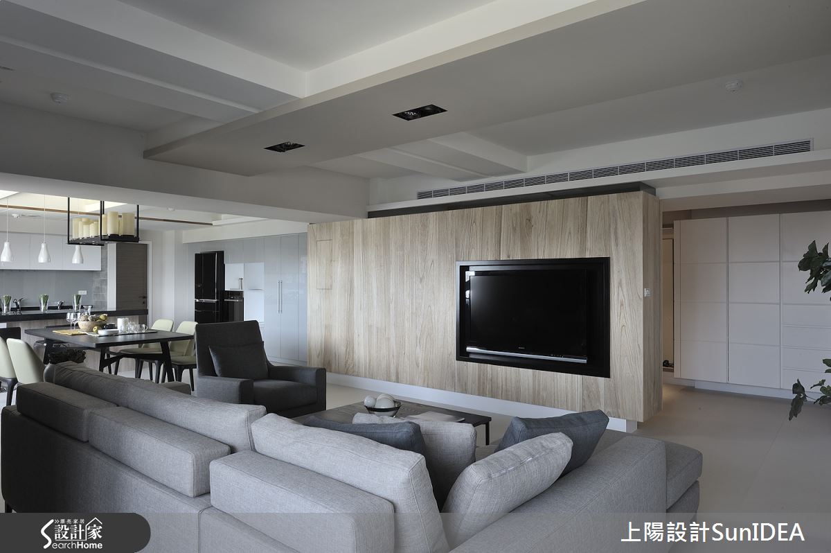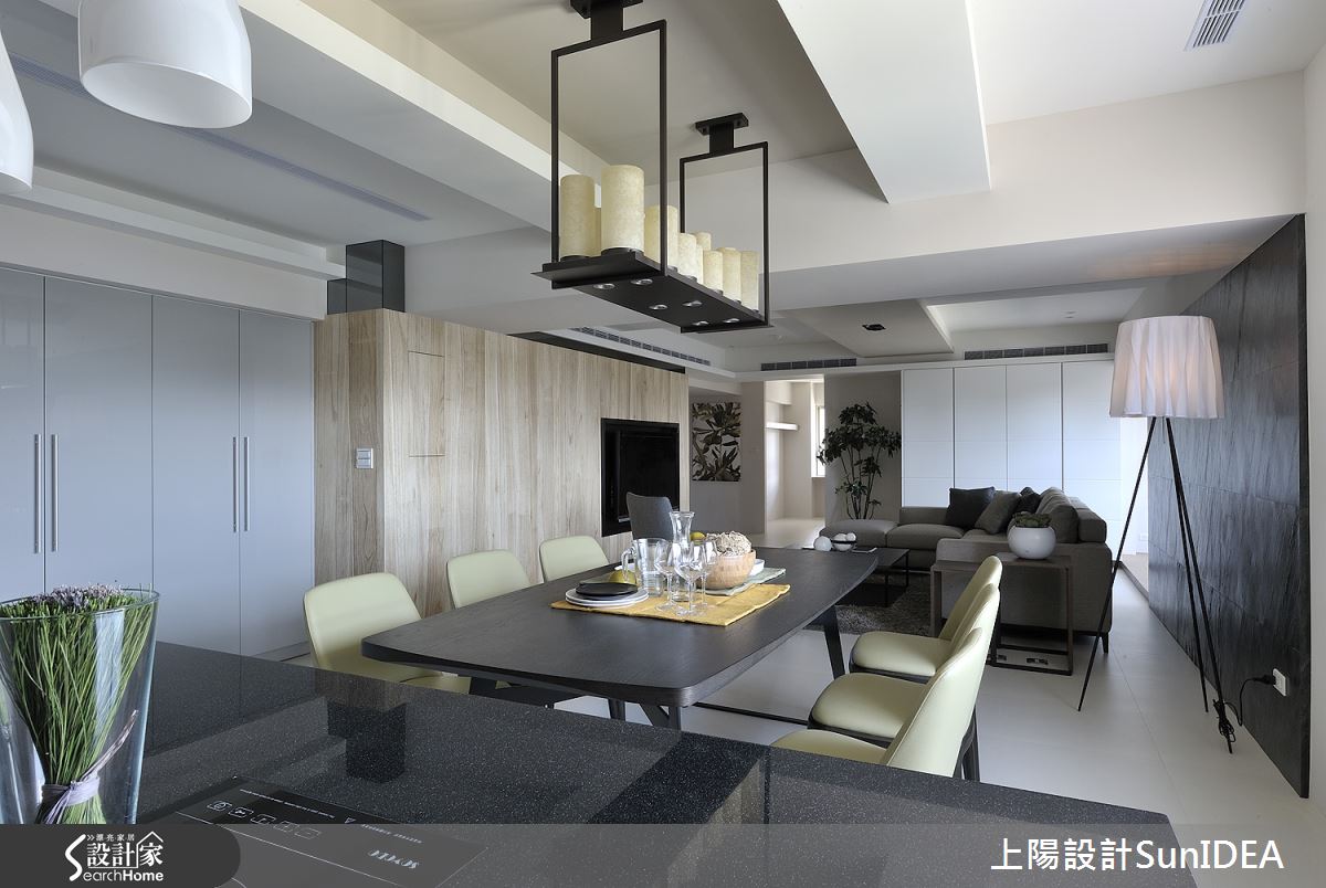 居宅整體運用塊體分佈,串起居家場域及廊道,且同步導引生活脈絡,從入口的鋼刷梧桐木皮電視牆起始,即構成廳區的動線開端,與之對應的則是深色板岩沙發牆,搭配採光與灰階家具調和,顯現舒適自在的居家質調;同時透過開放式公領域規劃,打造簡潔無阻隔的餐廚領域,帶來互動交流的生活場景;主臥床頭採以深色繃皮結合間接光源,融入幾何塊體的創意拼接,質樸中帶有休閒質感,床尾則規劃通往梳妝室路徑,給予大量的櫃體機能與收納空間,並讓更衣、梳妝與個人書房同步整合於一室,滿足起居的多元需求!
