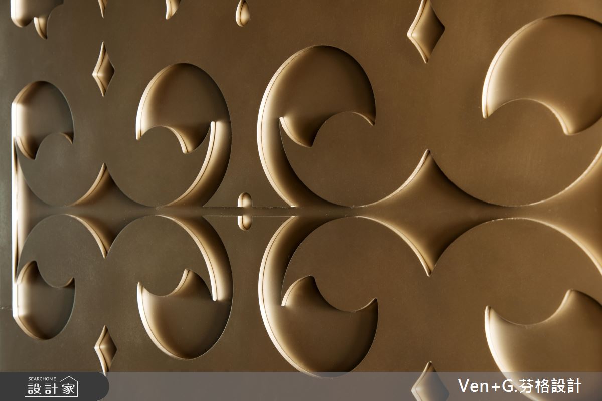 入門後的玄關領域,以菱形大理石鋪陳地坪,右側鏡面以垂墜的水晶吊燈擺設,左側藉由金色系的立體鏤空雕花作為裝飾,交織出微奢的美學序曲。客廳臨窗以鏤空的蕾絲窗簾擺設,篩灑戶外自然光源,轉為柔美的室內光意,映照在大地色系石材鋪敘的電視牆上,輕撫淡雅的紋路肌理,調和滿室優雅氣韻,而大面積的鋪陳讓公領域的視覺聚焦,且更添壯闊氣度;沙發背牆藉由錯落的條狀茶鏡鋪陳,長度不一的輕透質感拼貼,彷彿譜寫一首輕快旋律;餐廳壁面以鏤空雕花屏風,延續玄關的華美風格,另一側搭佐菱格紋切割的茶玻質感,一路向上延伸至天花板的大樑結構,不斷延伸室內情境的效果,替空間帶來放大之效,再搭配晶瑩剔透的水晶燈飾,交織一幅高貴的藝術饗宴。