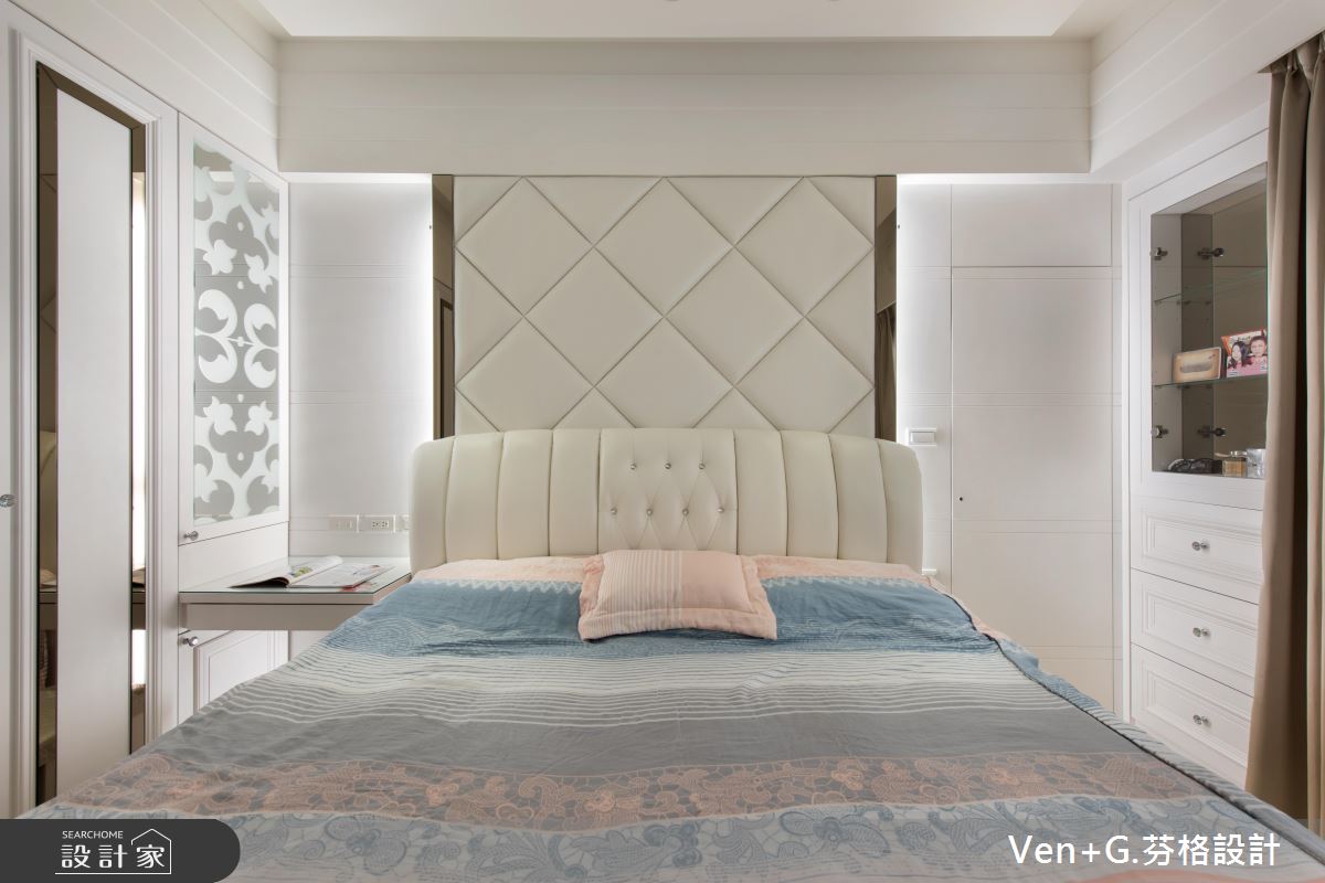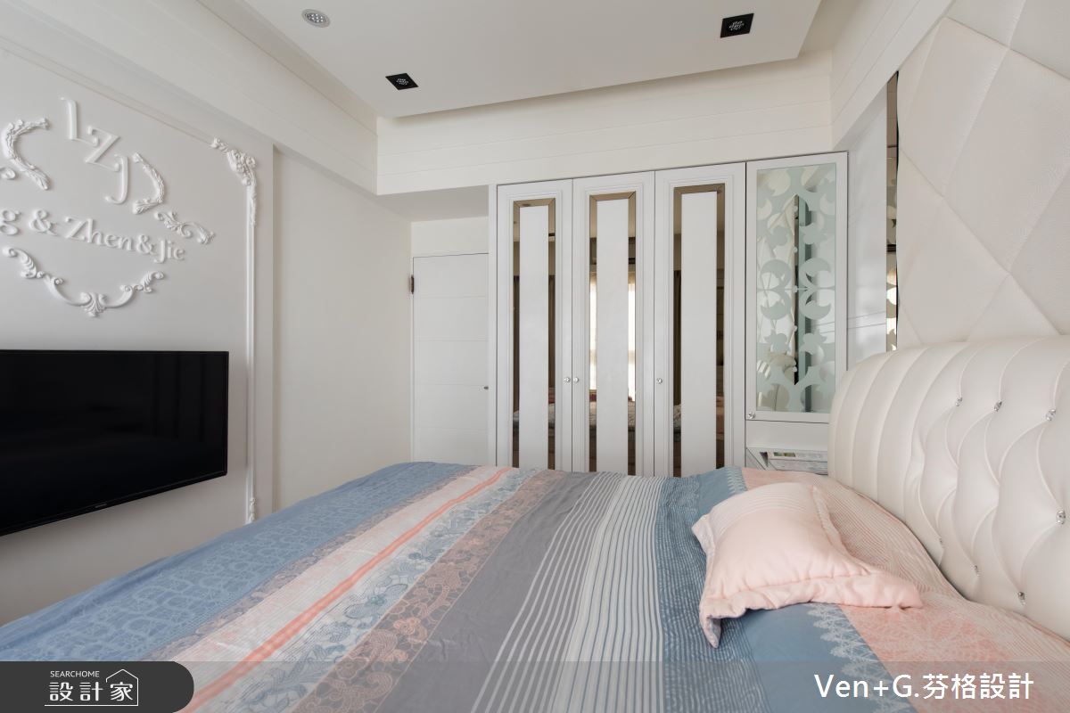 床頭牆以繃布為基底,兩側透過茶鏡勾勒出層次美感,對面白色的電視牆體,則以一家三口的英文字母為代表,描繪出風格獨具的立體雕刻造型牆,營造出典雅氣息。