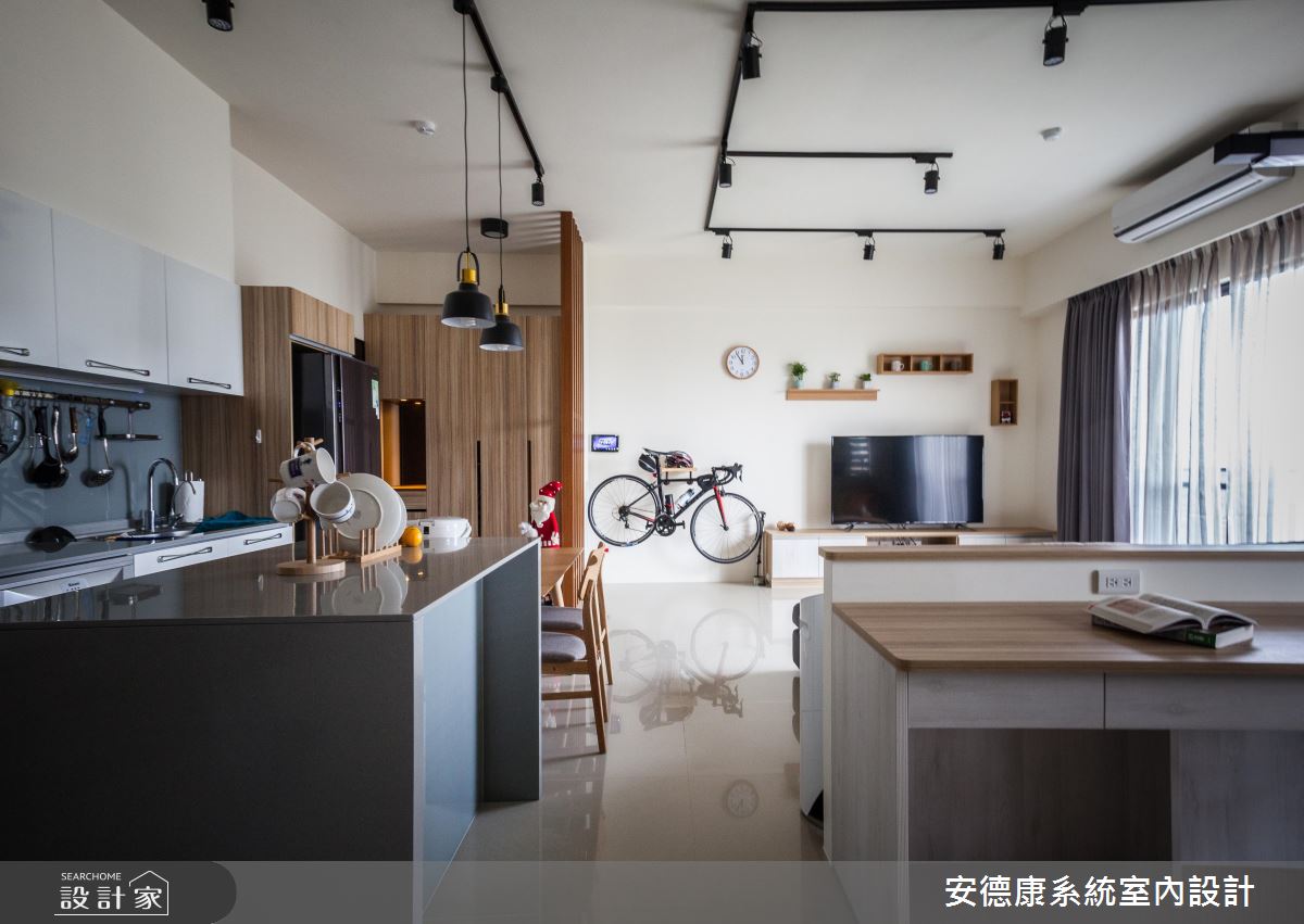 住宅突破封閉的收納型式,讓腳踏車懸吊於牆面,呈開放展示之姿,瞬間讓客廳有了視覺亮點,顯露活潑氣氛!