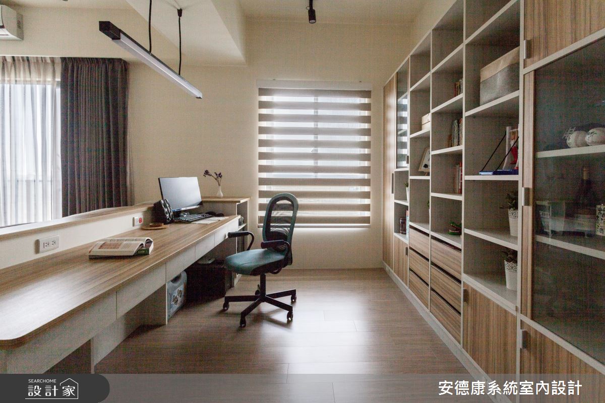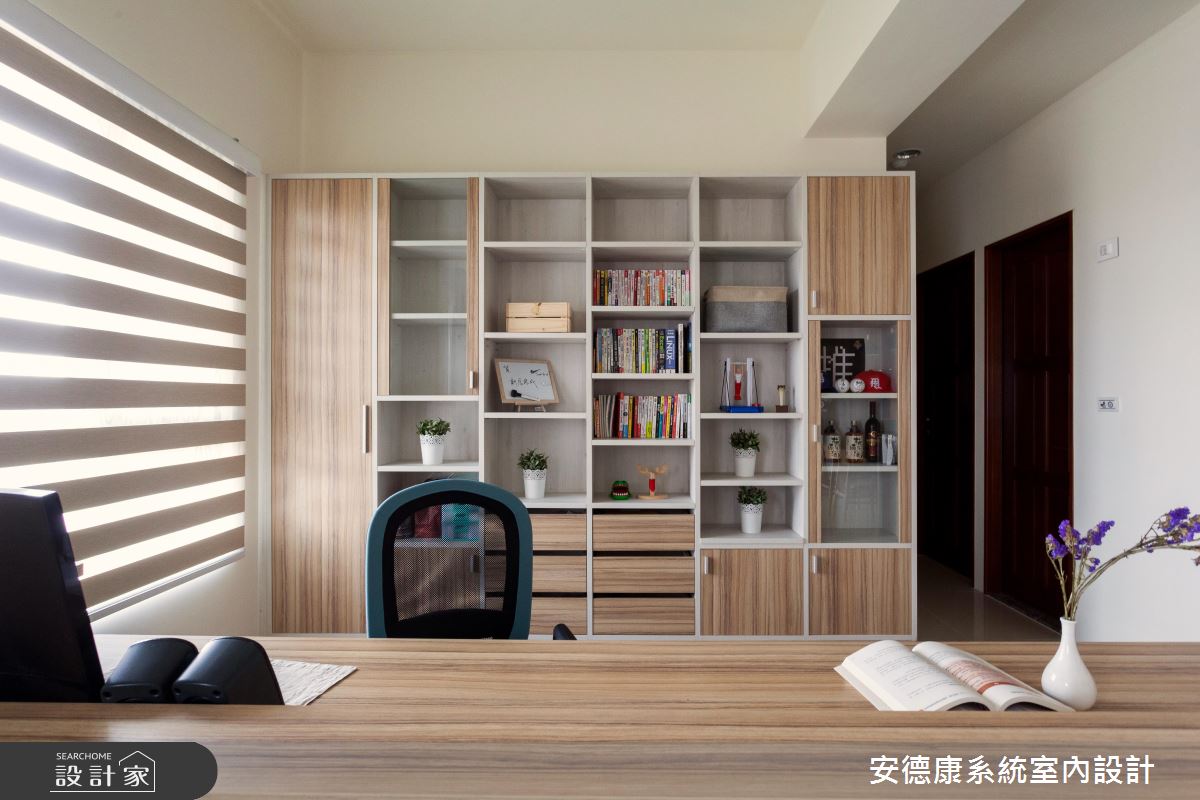 設計師規劃獨立小玄關,並使用木格柵設計,不僅讓入門視覺增加穿透性,也促使陽台光線可引渡至玄關;同時拆解一間房,使客廳、開放書房通透相連,讓原本不大的廳區更形擴大,且因著預算有限的關係,刻意於天花採用軌道燈,不只節省成本,更讓照明光源均勻分散,開啟明亮氣場;書房那整面的系統書櫃,除了挹注充裕機能性,更呈現木紋肌理的自然簡約,替空間型塑出一幅美好端景:寢臥內,則以窗面引進戶外景致,搭配著系統櫃的完善規劃,在素雅別致的氛圍中,貼近居住者的生活需求!