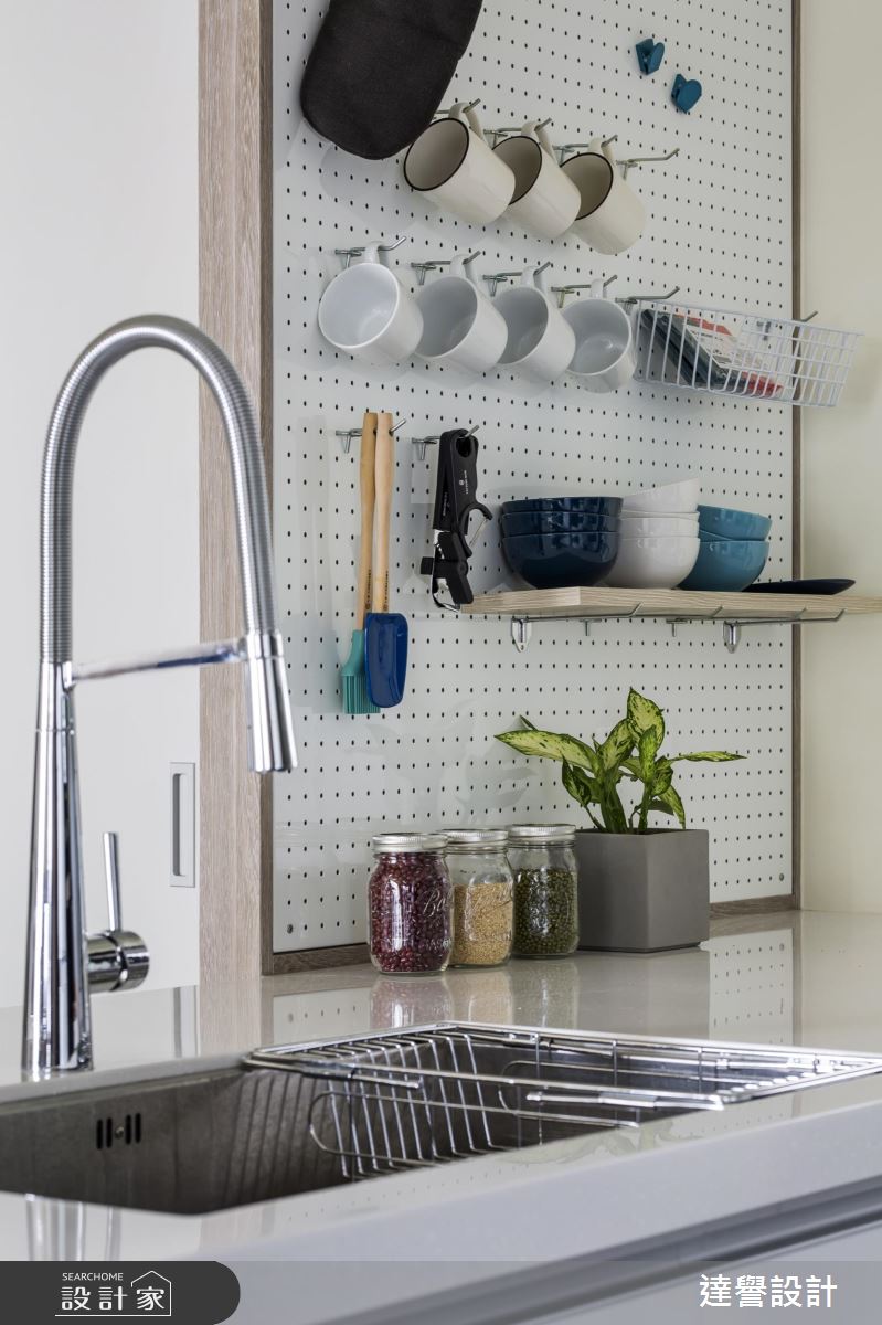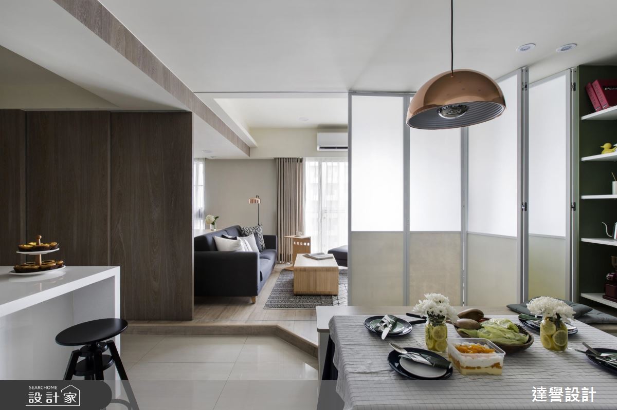 整體呈現開敞的界限,使場域各自獨立又有所連貫,規劃一面噴砂玻璃拼接木質拉門,做出公領域的一線之隔,兼具透光性與隱私度,並透過燈具、桌椅、家飾組構客廳場景,搭佐溫暖陽光,型塑淡雅的清新氣質;而從客廳、餐廚、玄關到書房,皆以稻香木鋼刷木皮作為主要裝飾材質,型塑一致的視覺效果;餐廚、走道則保有原拋光石英地磚,便利整理與清潔,並在敞亮的餐廚區內配置吧檯式備餐檯,打造與親友之間分享生活的自在領域,牆面更加入沖孔板,給予吊掛性機能,使杯子、湯杓等可隨手取得!