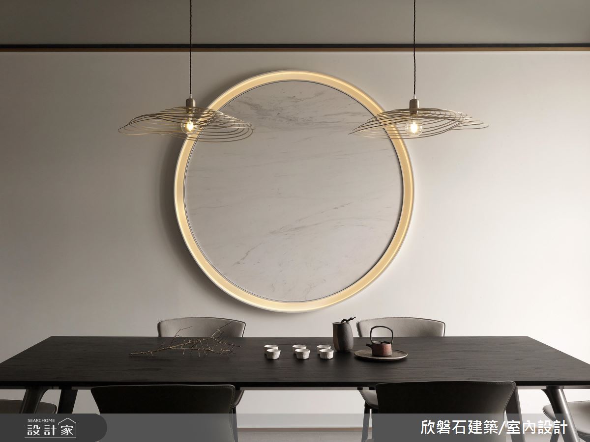 格局規劃上以開放、明亮為主,構畫流暢的生活動線,入口處安置了線條俐落的櫃體,減去把手設計,輔以局部鏤空設計,賦予簡約美感,也滿足了小家庭生活中必備的收納機能。整面的大理石牆面,以及進口磚所鋪敘的地坪,利用不同的材質,讓留白有了更加豐富的層次。軟件陳設則選擇靛色沙發、深木色的餐桌,形成沉靜的對比,並加入金屬質感的元素和細節處的金屬漆面收邊,點出了精緻的內涵,也帶來視覺上的亮點。用餐區利用燈光和銀狐大理石材質,讓餐廳主牆面彷彿掛上一幅圓融的藝術品般,為生活挹注優雅人文氣質。