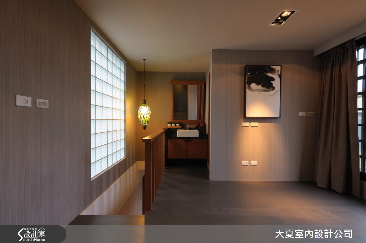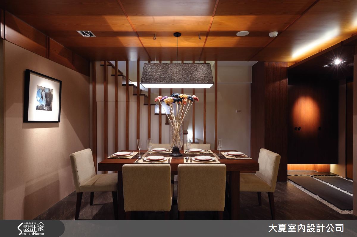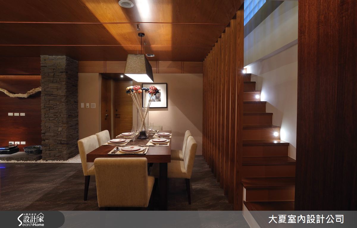 長方形的玄黑石板鋪陳地坪,周圍襯以白色卵石,傳遞枯山水的自然意象,右側則以懸空的柚木鞋櫃擺設,下方搭配嵌燈,伴隨光源映照在櫃體上,替玄關營造出內斂且詩意般的風格景致。公領域裡藉由深灰霧面拋光磚的鋪陳,搭配木紋肌理的天花板,營造出安定人心的氛圍;電視牆以深色木質為基底,兩側搭以對稱的板岩造型柱,中央的石板基座結合白卵石的滾邊點綴,加上懸浮枯木的神來一筆,傾注原始的山林之美;沙發與坐椅以素雅質感展現,背牆上飾以紅色立體畫作,與赭紅色抱枕相互呼應,綻放東方藝文神采;餐廳領域以簡約現代感的餐桌椅擺設,花藝與畫作增添人文精神,一旁則以格柵界定出階梯領域,隔間牆面嵌入玻璃磚替室內引入光意,醞釀優雅的東方文化之境。