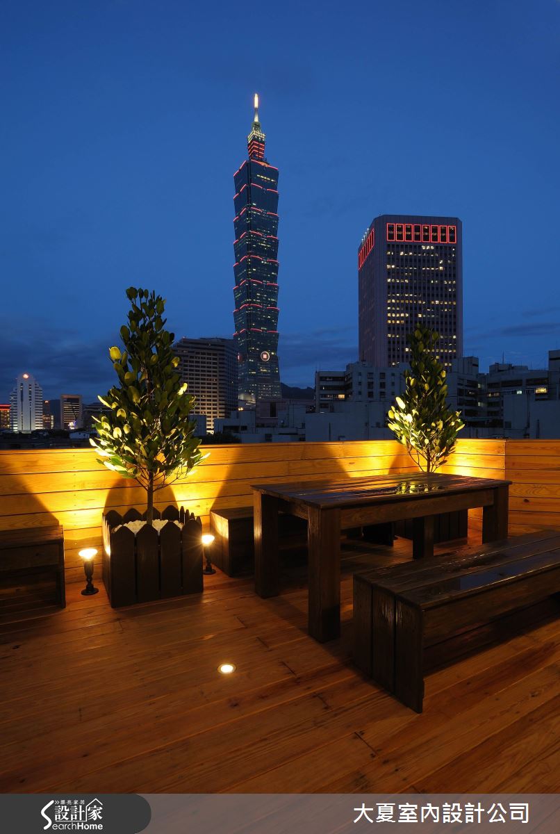 樓上還有頂樓露台花園的設計,原木桌椅的擺設加上綠意植栽,展現愜意閒適之感,還可挑望遠方的101大樓,到了夜晚更是沉浸在光影交織的情境裡。