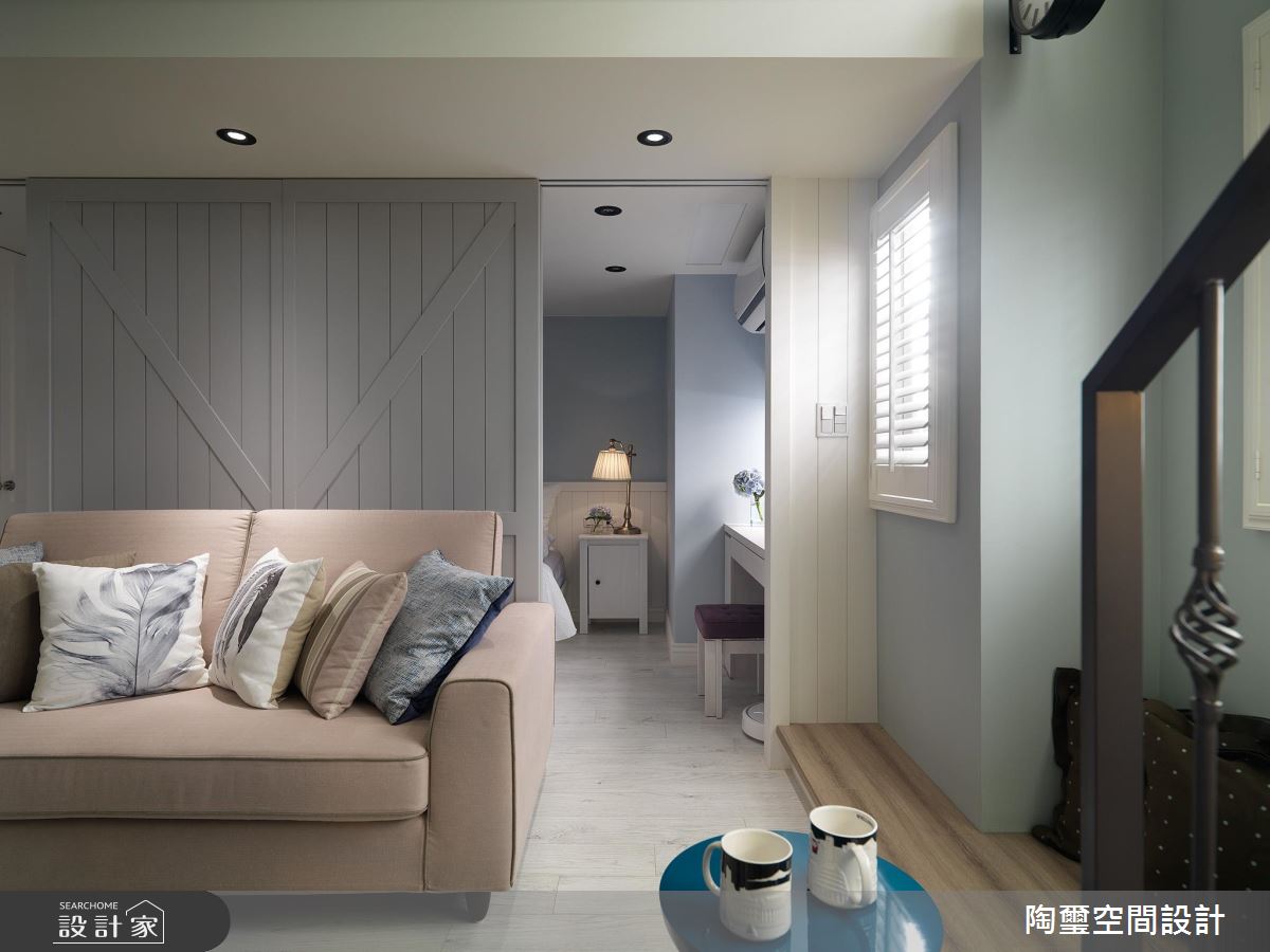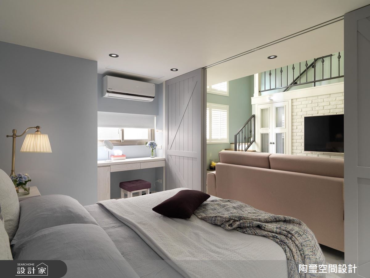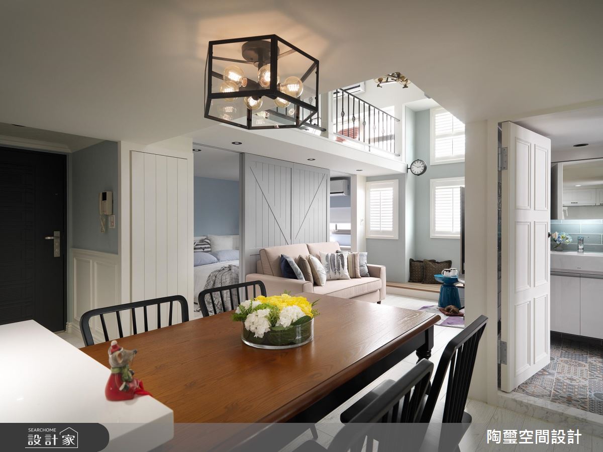 居宅除了挪動樓梯位置,也對調客廳、主臥區塊,把最好的採光留給公領域,讓主要活動盡量集中在一樓,且加入灰色穀倉彈性拉門,保有公私領域的互動串聯,使寢臥、廳區可同享電視牆功能,同時於牆面鋪陳輕盈的湖水綠,挹注清新質韻,主臥內則揮灑優雅淺藍,呈現安穩的休寢氣氛;餐廚區,將機能予以整合,讓吧檯與餐桌一體成型,促使空間更可被有效利用;二樓則留給收納儲藏室與起居客房,運用樓板的重作更新,讓一樓寢臥可獲得較高天花,二樓也圍塑出一小塊開放的起居地帶,凝聚新生活的美好軌跡!