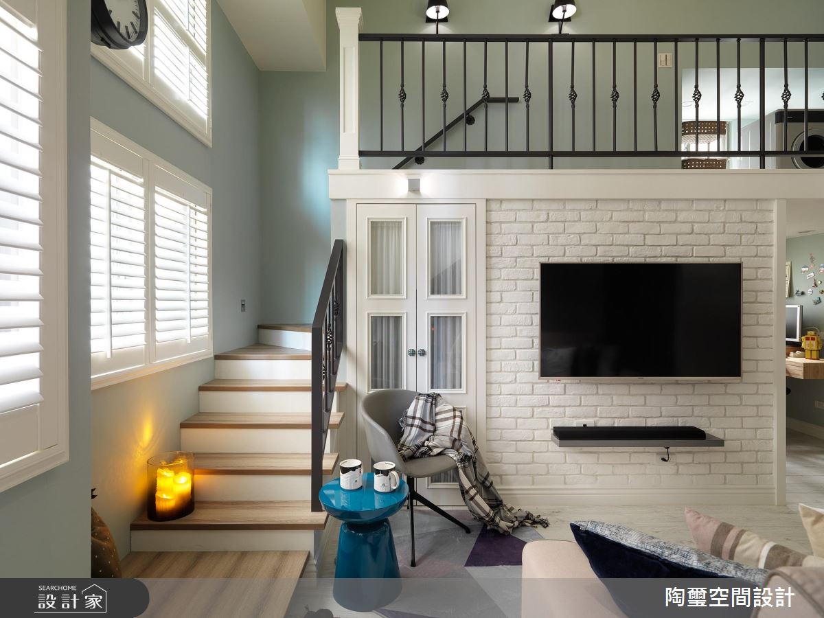 客廳,在文化石電視牆旁規劃造型收納櫃,透過可愛的櫥窗造型,製造內部還暗藏一間房的趣味錯覺,且善用樓梯下的窗邊地帶,規劃成休憩臥榻,充分發揮每吋坪效的價值!
