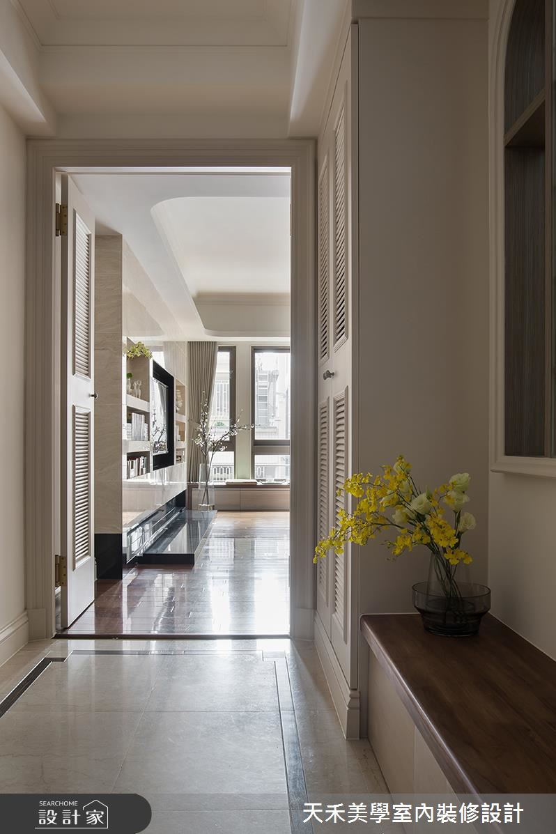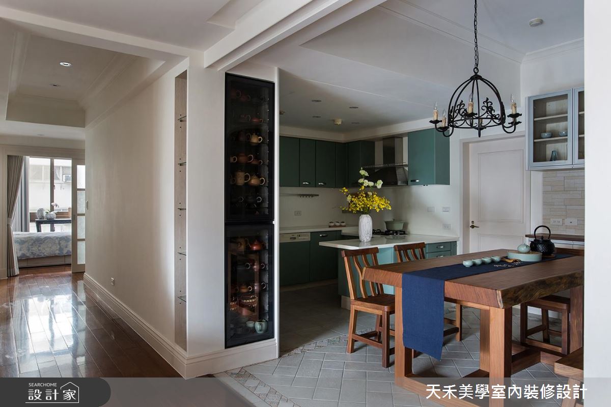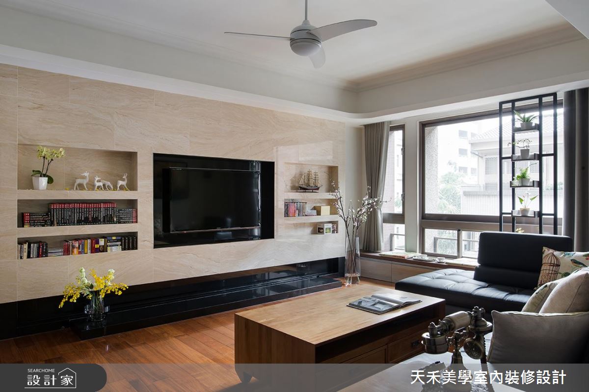 夫妻倆喜愛帶著沉穩底蘊的東方風,且希望設計師透過局部翻新,達到豐富、大器的收納展示設計,並規劃父母及孩子來訪時可留宿的房間格局。設計師丈量現場時,即發現舊屋有著噪音甚鉅、高耗能的中央水冷空調,廚具也有受潮朽壞、木作烤漆剝落的情況。因此透過細拆工法分段拆解藏於天花板的空調主機,依據各區域格局尺寸全面更新為節能變頻冷暖空調,讓整體空間寧靜優雅。為滿足屋主養生與美感之需求,設計師特別選用無甲醛炭化木為室內木作主要結構建材,公共空間以溫潤的仿石電視牆與低調奢華的大理石材檯面,來搭配前任屋主留下氣勢萬千的藝術畫作,再加上屋主精挑細選的各式原木訂製家具,更是營造了品味不凡的精緻感、樸實中不顯老氣的東方感受。餐廚空間增設展示收納櫃體,為男女主人的茶具與餐具收藏打造宛如藝廊的展示效果。原有主臥重劃出入口位置,並大幅增加更衣室收納機能,並結合書房功能,滿足夫妻的期待。