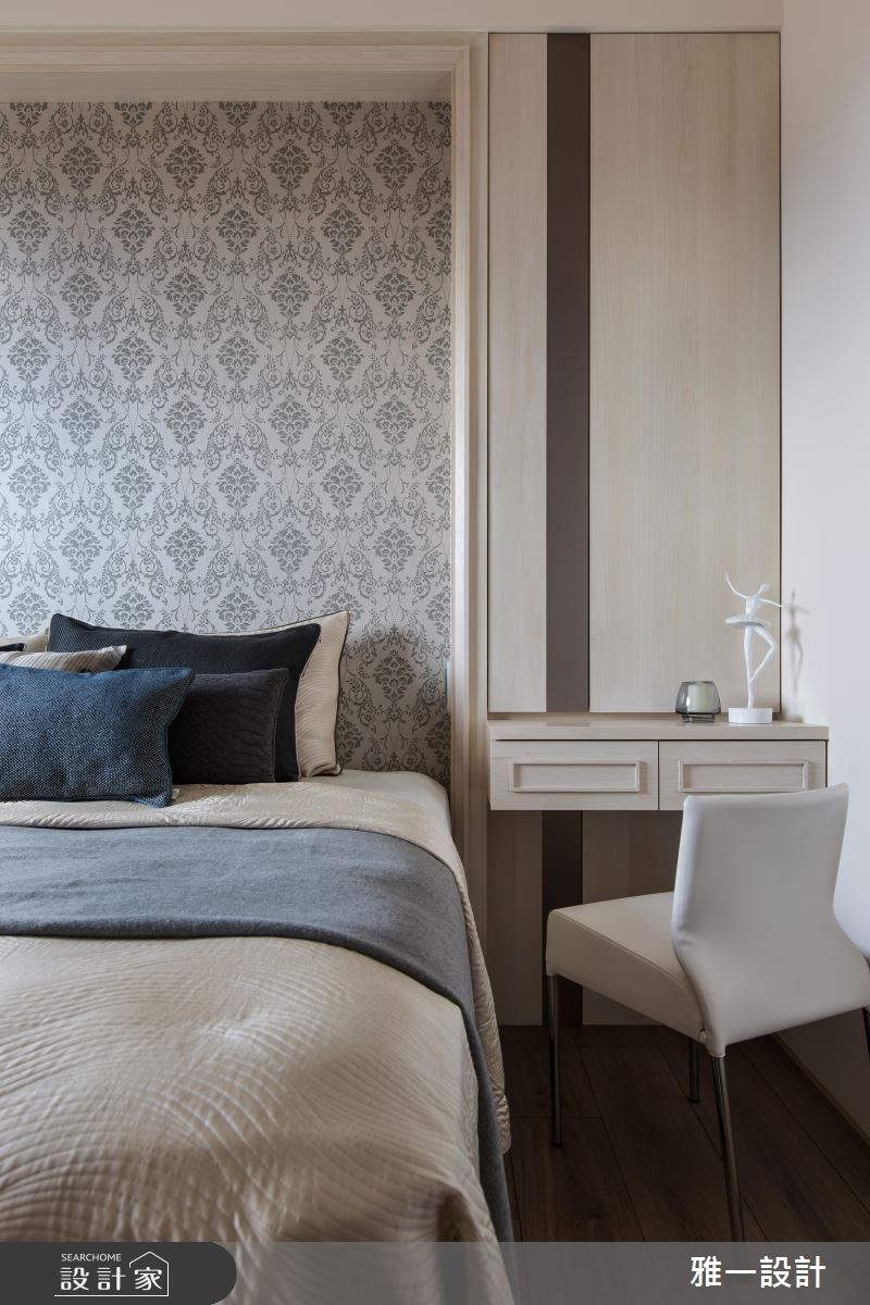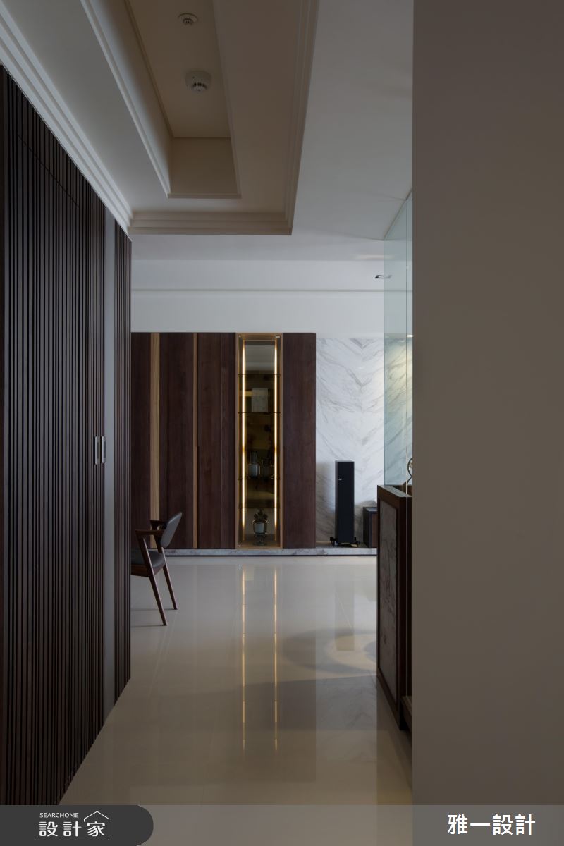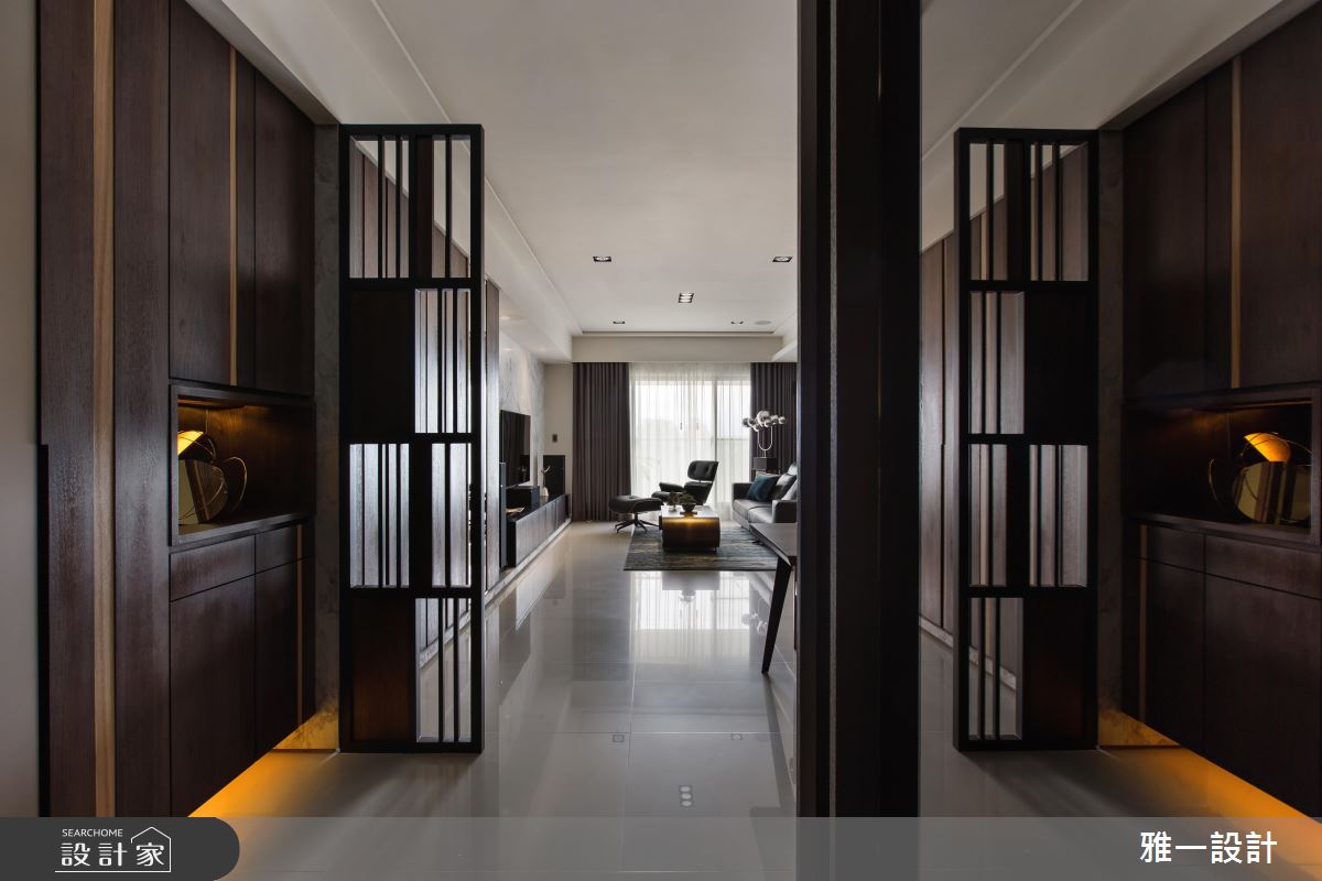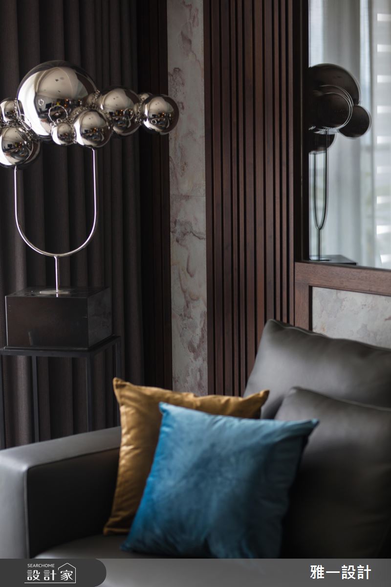居宅引用深色木皮銜接立面,營造沉靜安穩的感受,同時 導引空氣對流及明亮採光,讓整體雖充滿深色塊面,卻絲毫不顯沉悶,反倒坐擁開闊氣勢,而隨處可見的簡潔線條與格柵鋪陳,則道出了空間的穿透力與縝密序列,並在地毯抱枕上,適時選配較為鮮明的色彩,讓現代感跳脫出更為年輕的風采;沙發牆後方,配置了清玻隔間,不只塑造光線、視線的串聯,也讓書房展示牆成絕佳風景,以較淺的原木色澤對比廳區的沉穩木色,襯出景深之下的木質濃淡;寢臥內,採以細緻壁紙作為主牆焦點,藉著些微的深度讓床頭更具包覆感,一旁則結合梳妝檯面,兼具實用度與整體感,展現完善的起居機能運作!