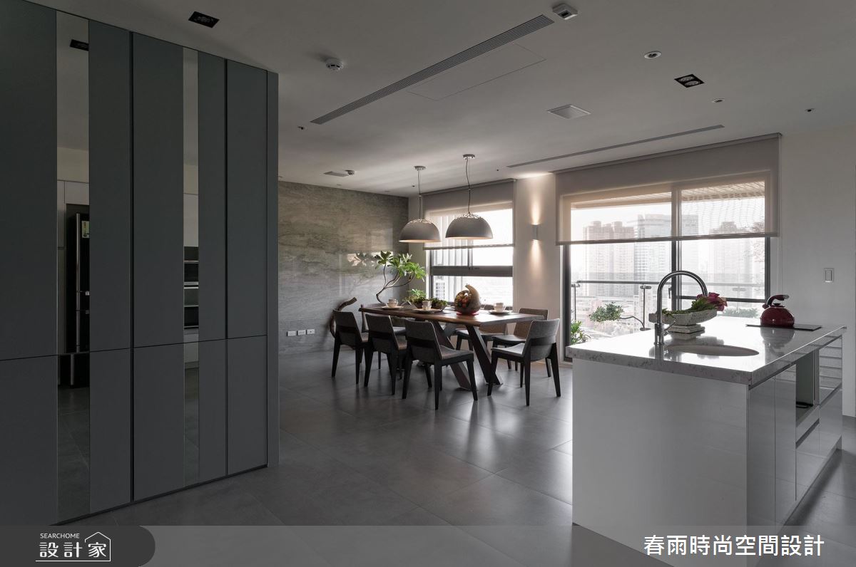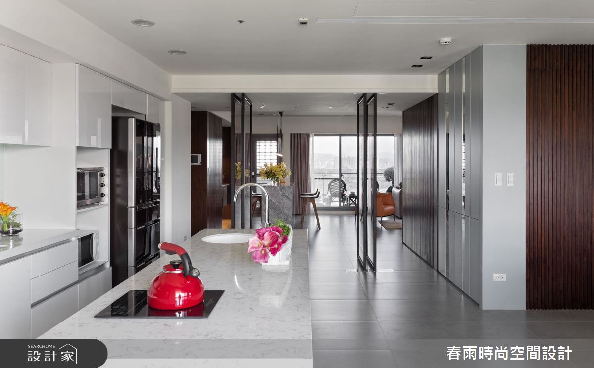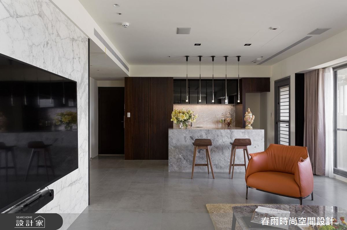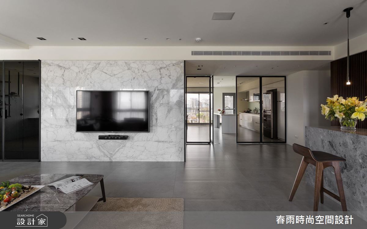 步入這處居所,由三戶合併的生活空間,顯得十分開闊和敞亮,經過重整後的空間格局,設計師將完整的採光面留給公共領域,搭配 4 片可收摺的玻璃門片,創造最大的使用動線和視野通透感。寬敞的廳區結合餐酒吧檯,便成為賓主盡歡的待客空間,搭配一整面的雕刻白大理石電視牆,營造大器的視覺感受,而視線向後延伸至後方的玻璃書屋,高低起伏的造型書架更豐富了端景的層次感。開放式的餐廚區隱身於玻璃摺門之後,同樣享有明亮、寬闊的空間優勢,更為喜愛下廚的屋主打造齊備的廚房機能,不但進行料理烹飪時更順手,也能和家人進行互動。為了打造舒適、自然的私領域空間,主臥室運用亞麻色系的壁紙和繃布,搭配溫潤的木質和燈光元素,形塑紓壓放鬆的生活氣息。