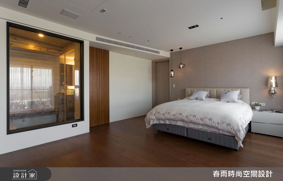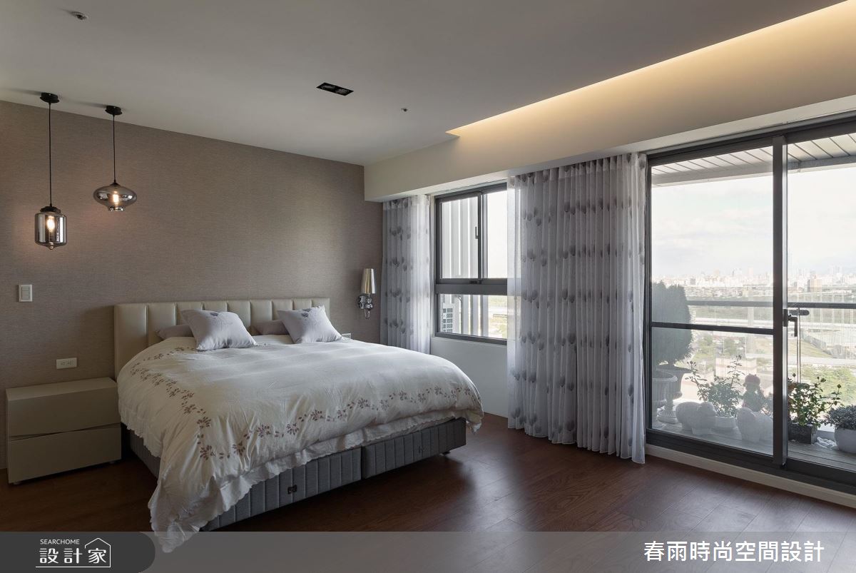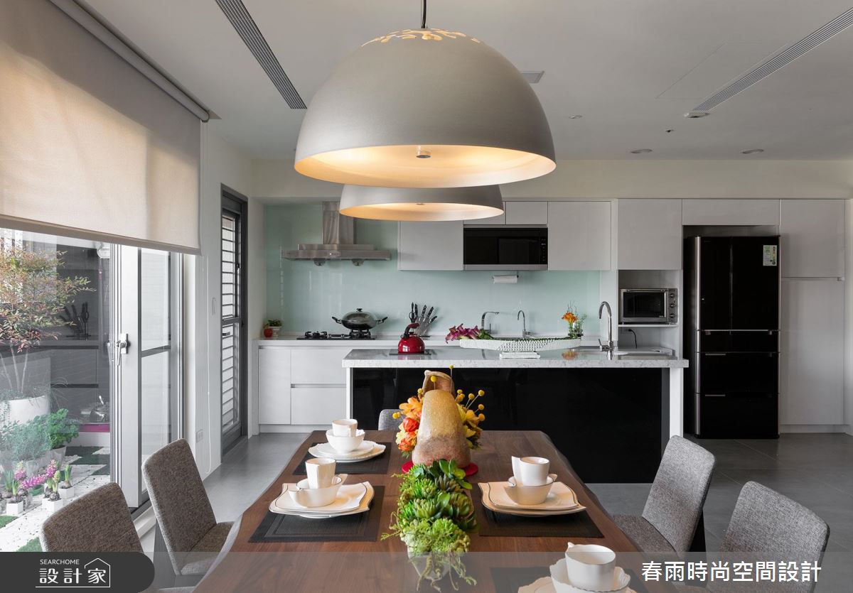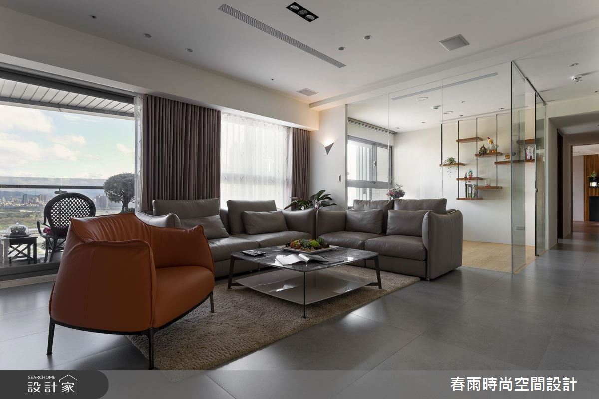 步入這處居所,由三戶合併的生活空間,顯得十分開闊和敞亮,經過重整後的空間格局,設計師將完整的採光面留給公共領域,搭配 4 片可收摺的玻璃門片,創造最大的使用動線和視野通透感。寬敞的廳區結合餐酒吧檯,便成為賓主盡歡的待客空間,搭配一整面的雕刻白大理石電視牆,營造大器的視覺感受,而視線向後延伸至後方的玻璃書屋,高低起伏的造型書架更豐富了端景的層次感。開放式的餐廚區隱身於玻璃摺門之後,同樣享有明亮、寬闊的空間優勢,更為喜愛下廚的屋主打造齊備的廚房機能,不但進行料理烹飪時更順手,也能和家人進行互動。為了打造舒適、自然的私領域空間,主臥室運用亞麻色系的壁紙和繃布,搭配溫潤的木質和燈光元素,形塑紓壓放鬆的生活氣息。