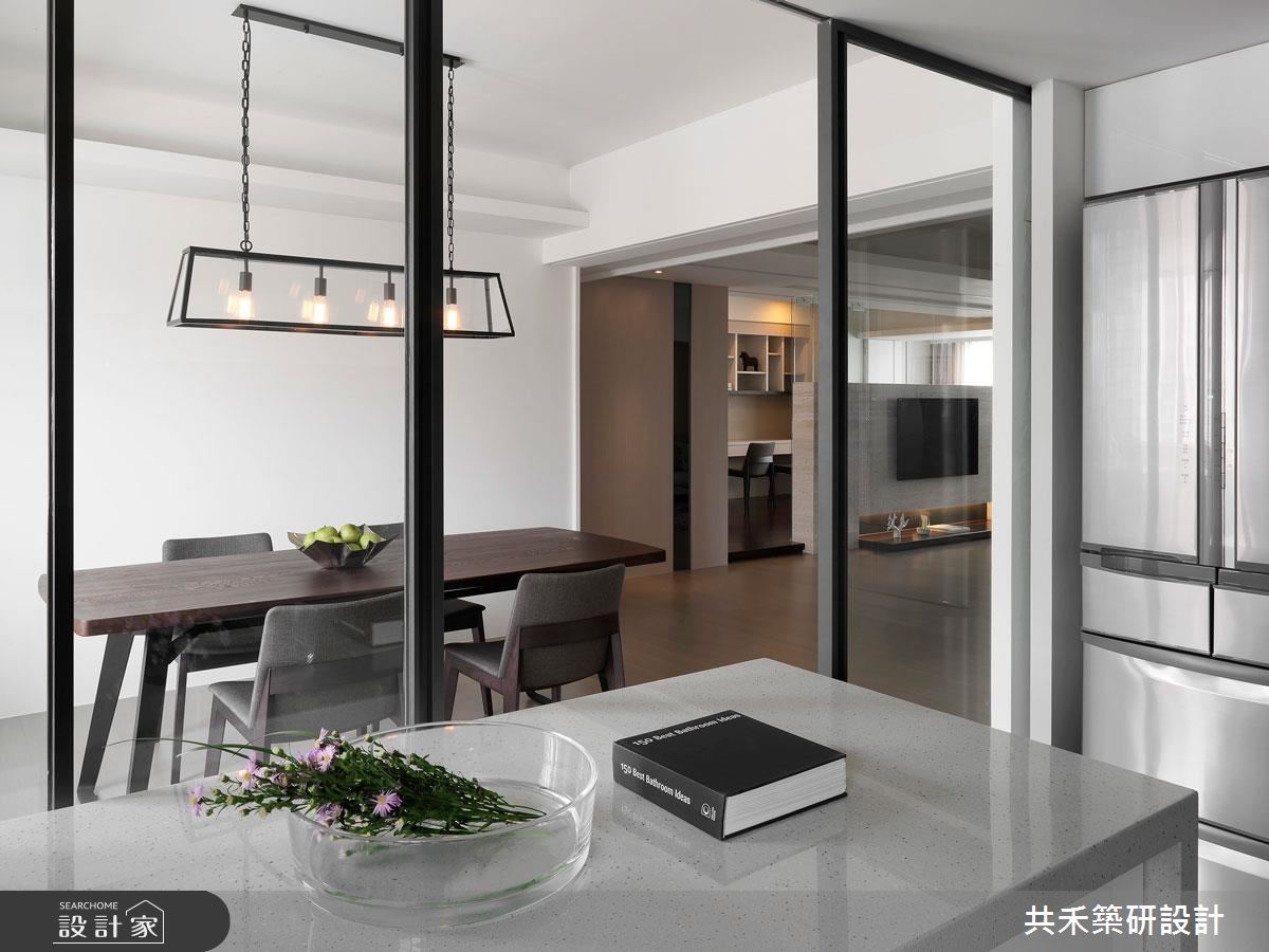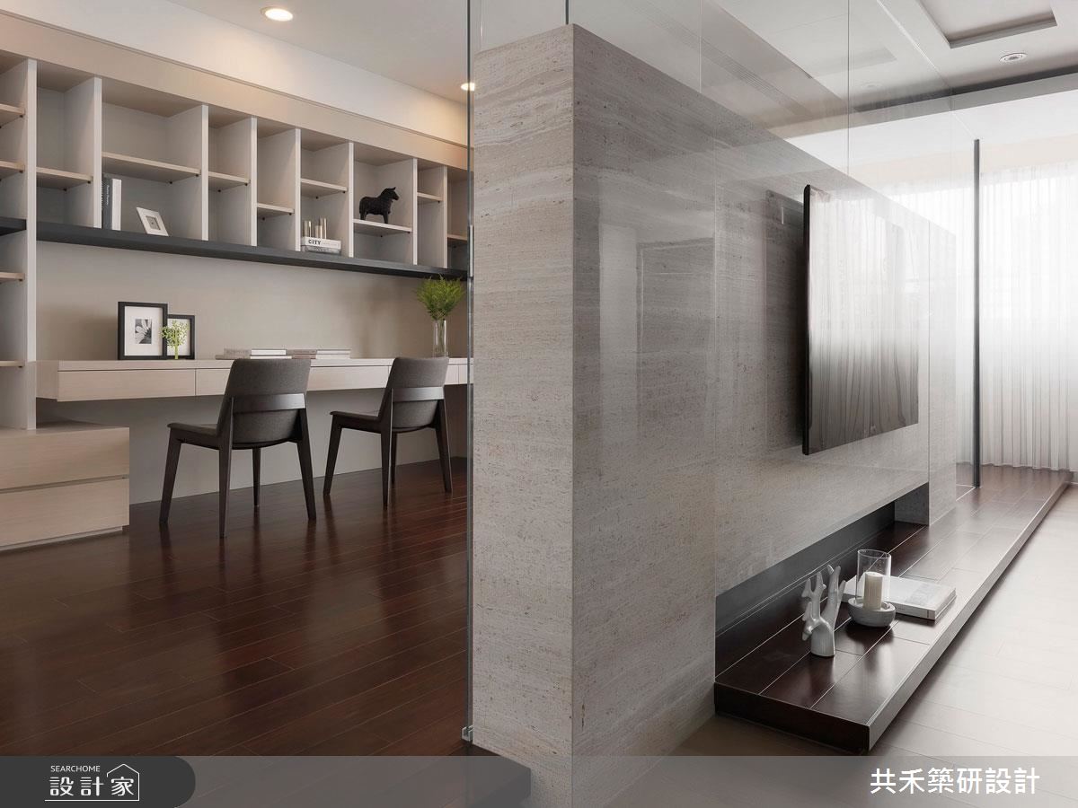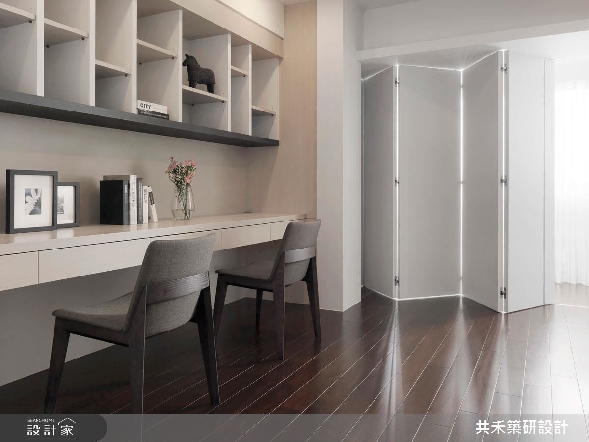 廳區選用木皮、石材作為主建材,酌量妝點鐵件強化立體視感,搭配著極簡的色彩計畫、深具層次的量體線條,型構溫暖優雅的場景,並以半高電視牆作為客廳、書房之間的分野,再適時架高地坪,型構回字型順暢動線;書房內則給予展示書櫃配置,挹注實用的生活機能,並於書房、廊道之間規劃活動摺門,替空間開啟更多彈性變化的可能;餐廚區,則陳列深色實木餐桌塑造沉穩質韻,讓用餐區與廚房之間保有開放型態,結合鐵件玻璃拉門設計,使空間可在杜絕油煙散逸的同時,也無礙光線、視線的交流!