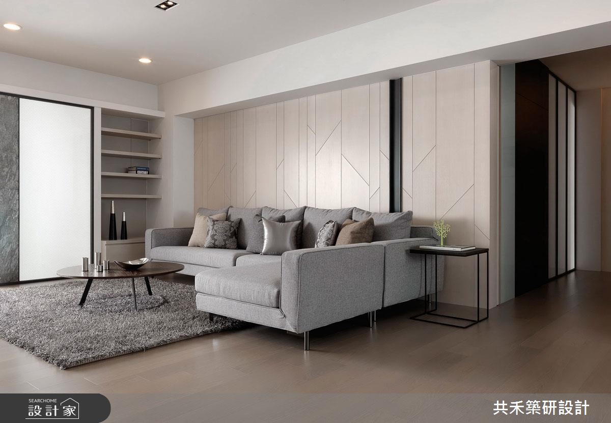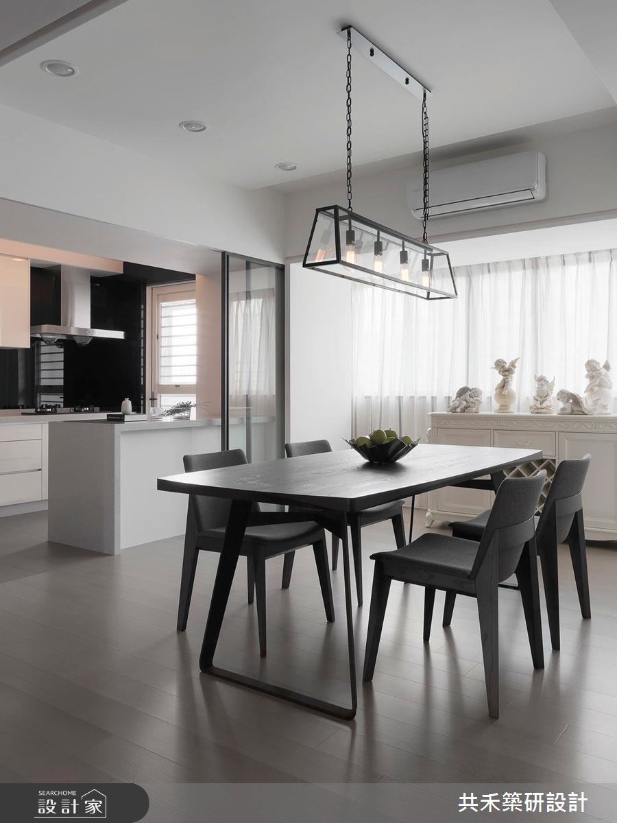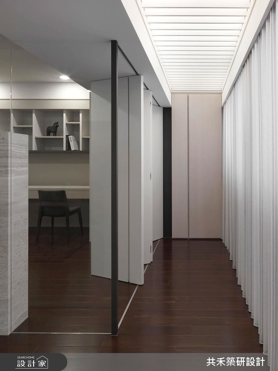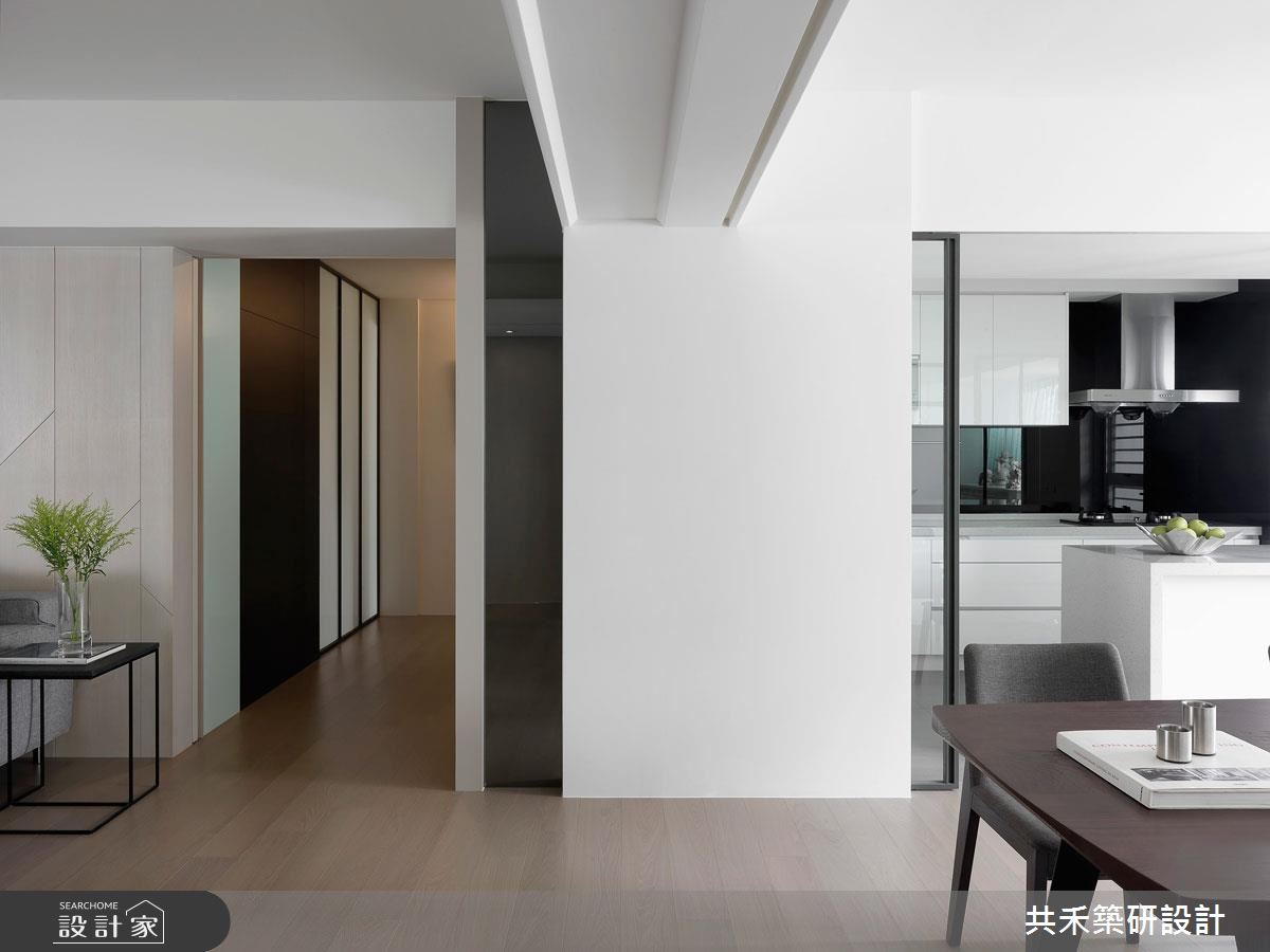 廳區選用木皮、石材作為主建材,酌量妝點鐵件強化立體視感,搭配著極簡的色彩計畫、深具層次的量體線條,型構溫暖優雅的場景,並以半高電視牆作為客廳、書房之間的分野,再適時架高地坪,型構回字型順暢動線;書房內則給予展示書櫃配置,挹注實用的生活機能,並於書房、廊道之間規劃活動摺門,替空間開啟更多彈性變化的可能;餐廚區,則陳列深色實木餐桌塑造沉穩質韻,讓用餐區與廚房之間保有開放型態,結合鐵件玻璃拉門設計,使空間可在杜絕油煙散逸的同時,也無礙光線、視線的交流!