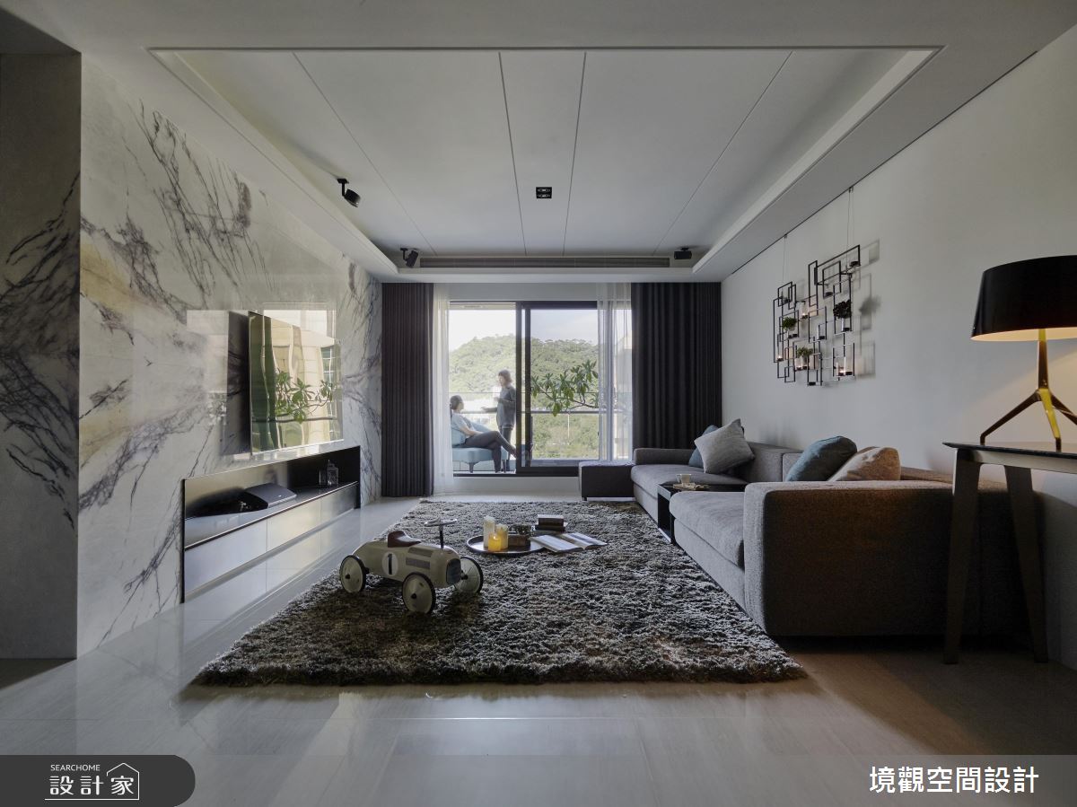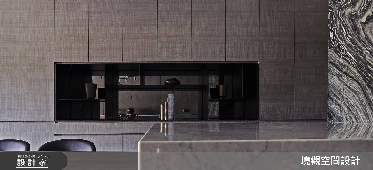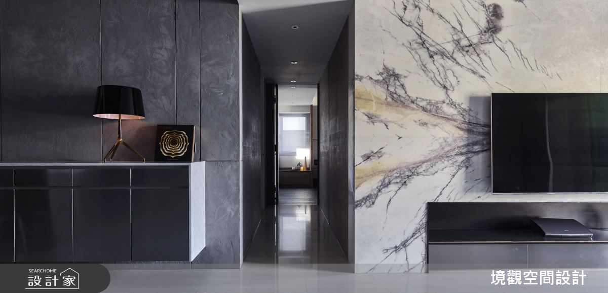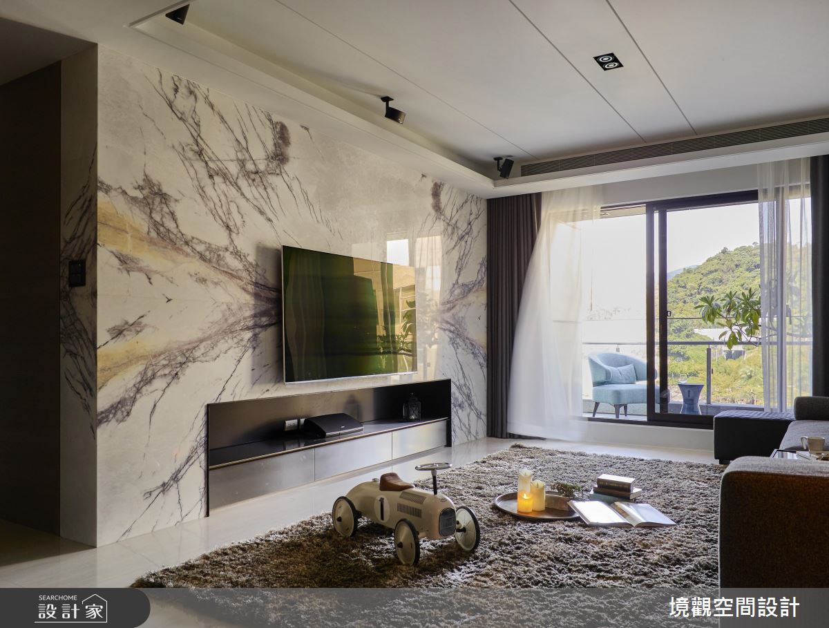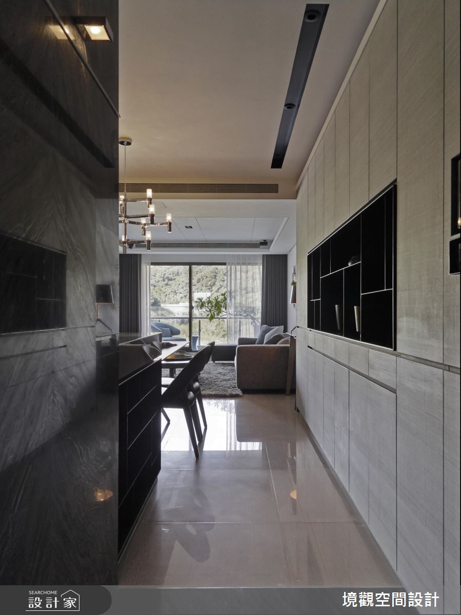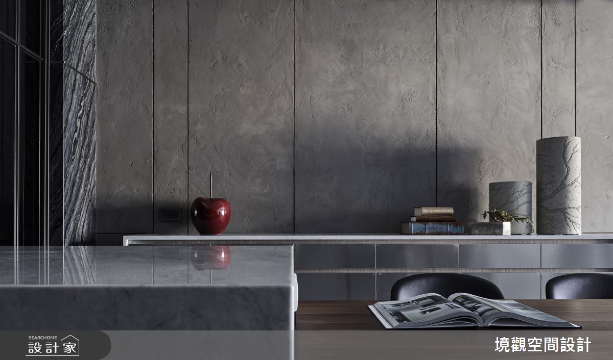 設計師選用了貼近天然建材,包含古木紋石材、珪藻土、花草板等應用在牆面設計,營造了屬於大地之母的馨香與特色。由於選用天然建材為主,色系上也依循著沉穩、優雅的大地色調,由單純的木、石原色延續窗外綠意。針對動線規劃,除了在玄關規劃延伸至餐廳尾端的大面積收納櫃體,公領域以全開放設計串連,而獨立廚房也利用玻璃拉門作為屏隔,大幅提升光透度。玄關櫃體的木紋,與餐桌後方的石紋與電視牆大理石的天然紋路相互呼應,以低彩度沙發、軟件與地氈襯托主角綠建材。