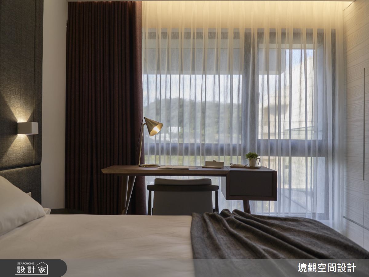 主臥延續公領域的設計主軸,以燈光、建材與色調營造自然氛圍,更在延窗處放置舒適的單椅書桌,除了自然氣息,更多了度假氛圍。