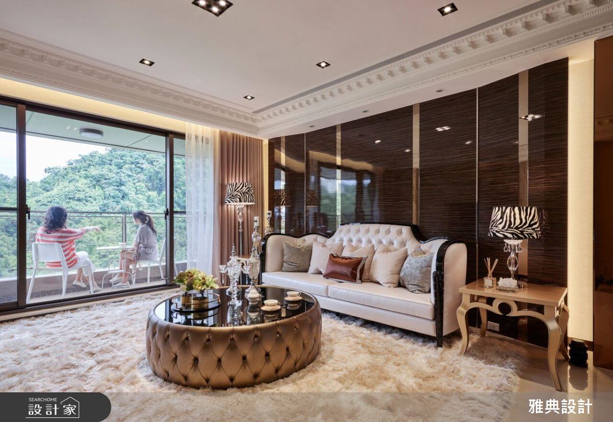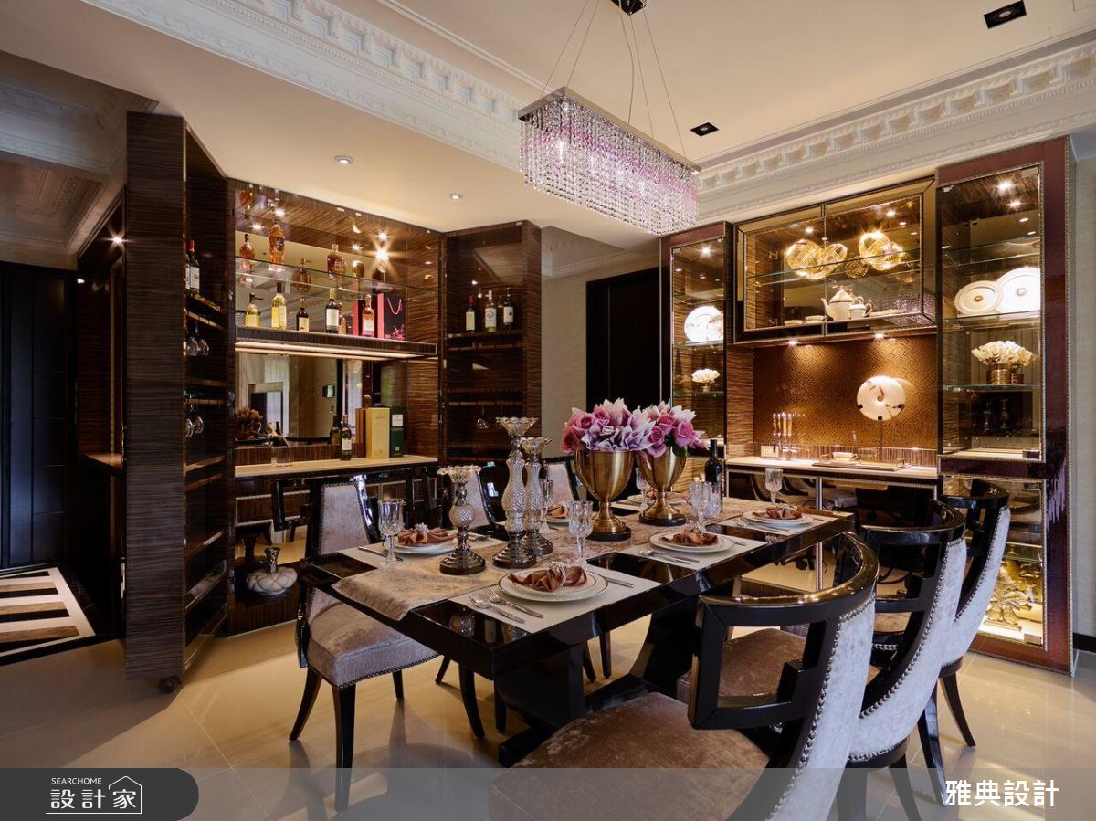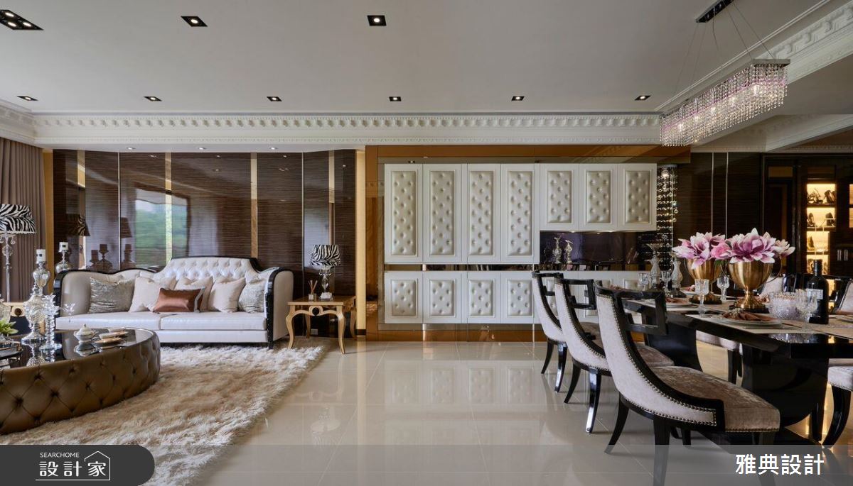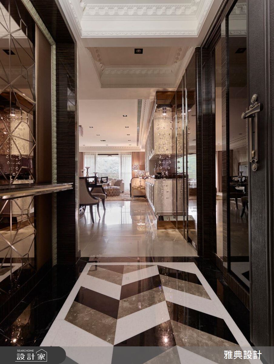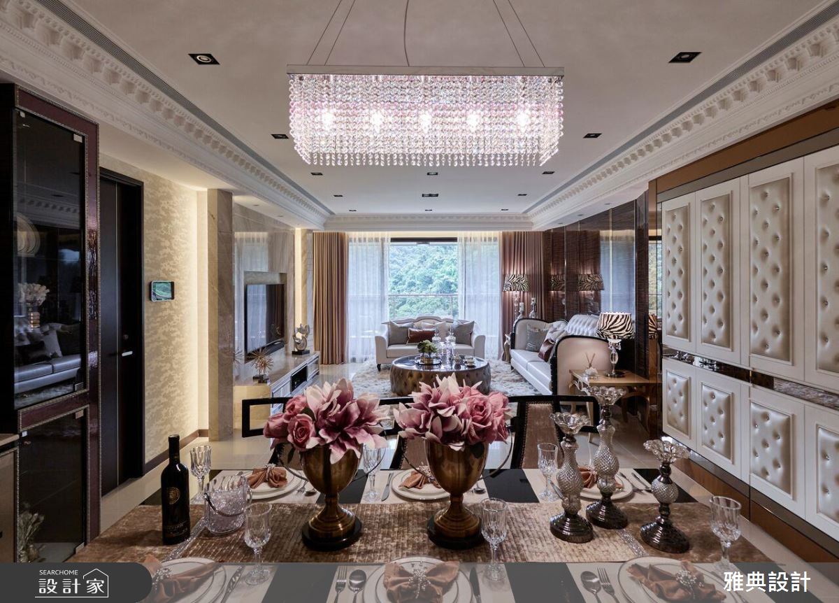 步入居家,可見玄關地坪的幾何立體圖騰,昭告令人深刻的開門印象,並給予黑檀木鋼烤結合玻璃鏡面,搭配猶如精品櫃的鞋櫃規劃,道出名媛般的高貴風尚;延伸入內,則在牆上繃出白色皮革,佐入金色框架收邊,與黑檀木鋼烤材質相串聯,拉闊整道立面尺度,並適時界定出不同場域的牆面主景;客廳區則賦予華麗的裝飾、細膩的色彩,陳設精美軟件定義雍容氣質,對外更連結整片美好山景,開啟遼闊的視覺美意;餐廳周邊配置了大容量展示櫃,藉由通透設計與鏡面媒材,援引光線的妝點烘托,凝聚極致的豪華質韻,同步網羅展示、備餐與收納等多重效益;三間臥房分別以白色、粉色為基調,於床頭加入光澤感繃皮,佐以細節修飾與精選建材,強調女性化的纖細優雅!