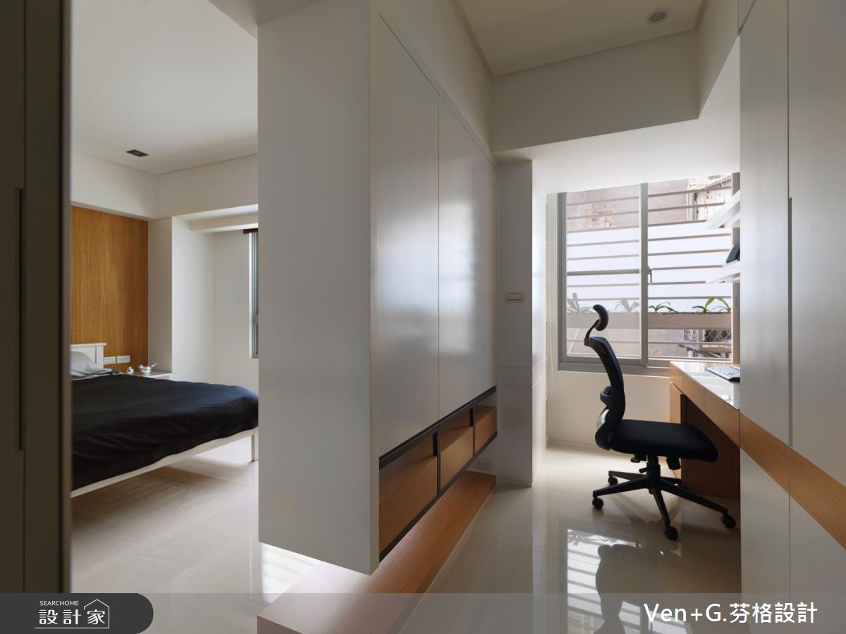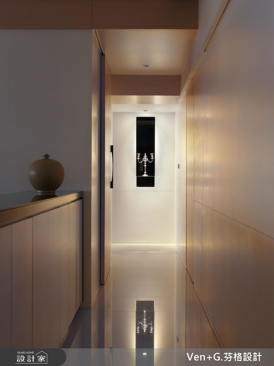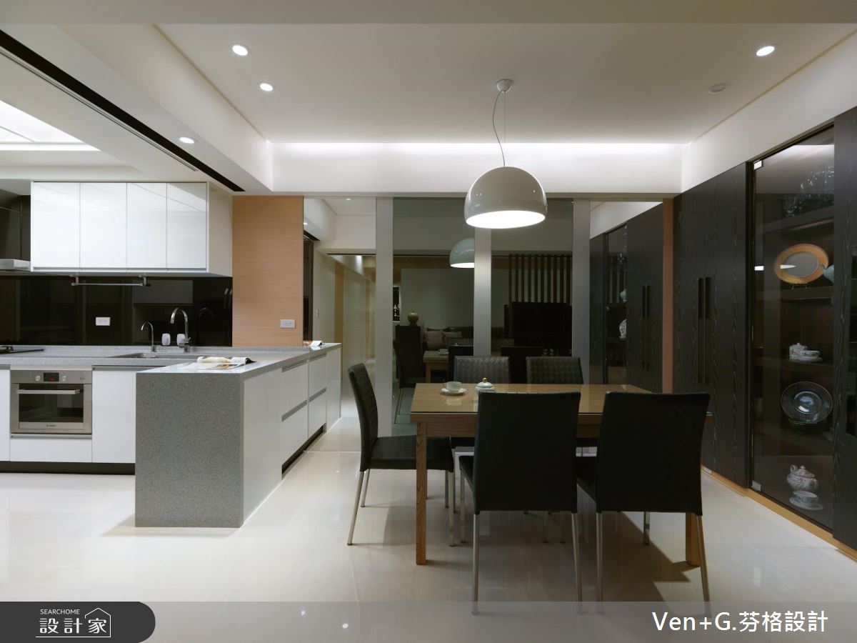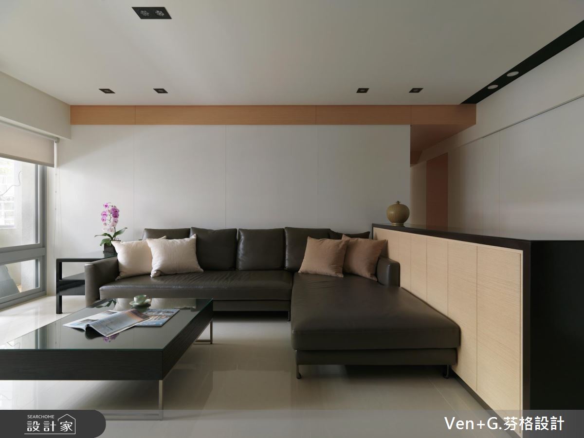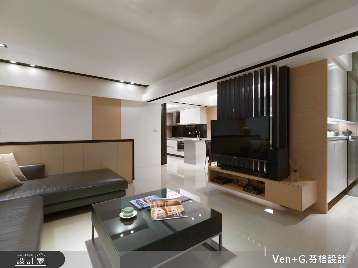 玄關的白牆上,嵌入黑色面板且擺設歐風燭台,形塑優雅的端景造型,引領人們前往空間裡;戶外暖陽從陽台引入室內,照亮簡約分明的黑白視覺, L型沙發圍塑出居家生活領域,讓出寬敞的動線;結合黑色格柵造型的電視牆,穿透的視覺效果讓視線可望向餐廚區,打造開放、流動的空間感受;弧形白色燈飾與原木質感家具的搭配下,創造出內斂、簡單的用餐氣息,黑色鏡面鋪陳餐廳壁面,投射出客廳領域,讓視覺更顯延伸、遼闊;明亮、乾淨的廚房空間裡,廚具以L型創造出走道與烹調區,呼應現代極簡的生活思維。