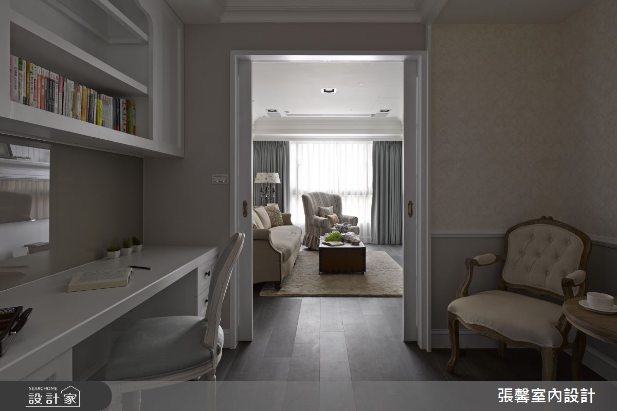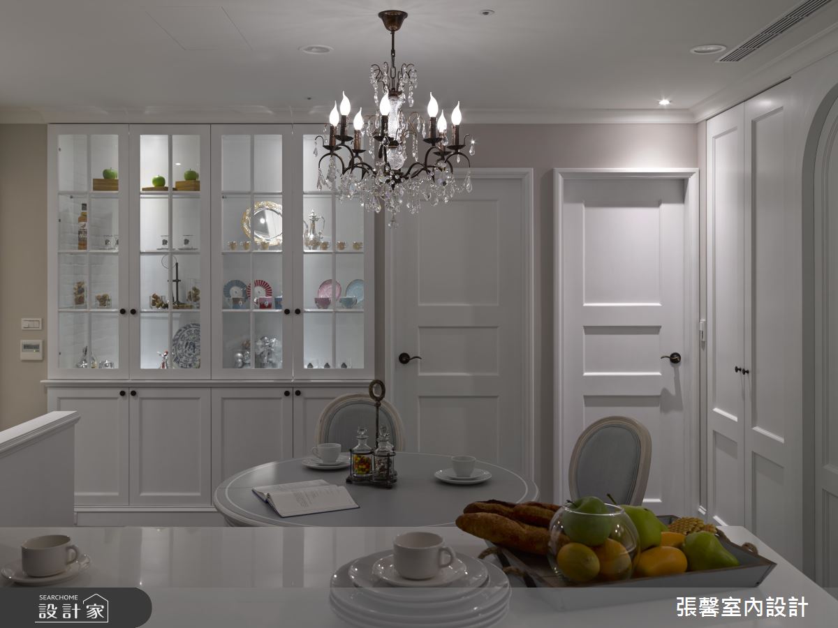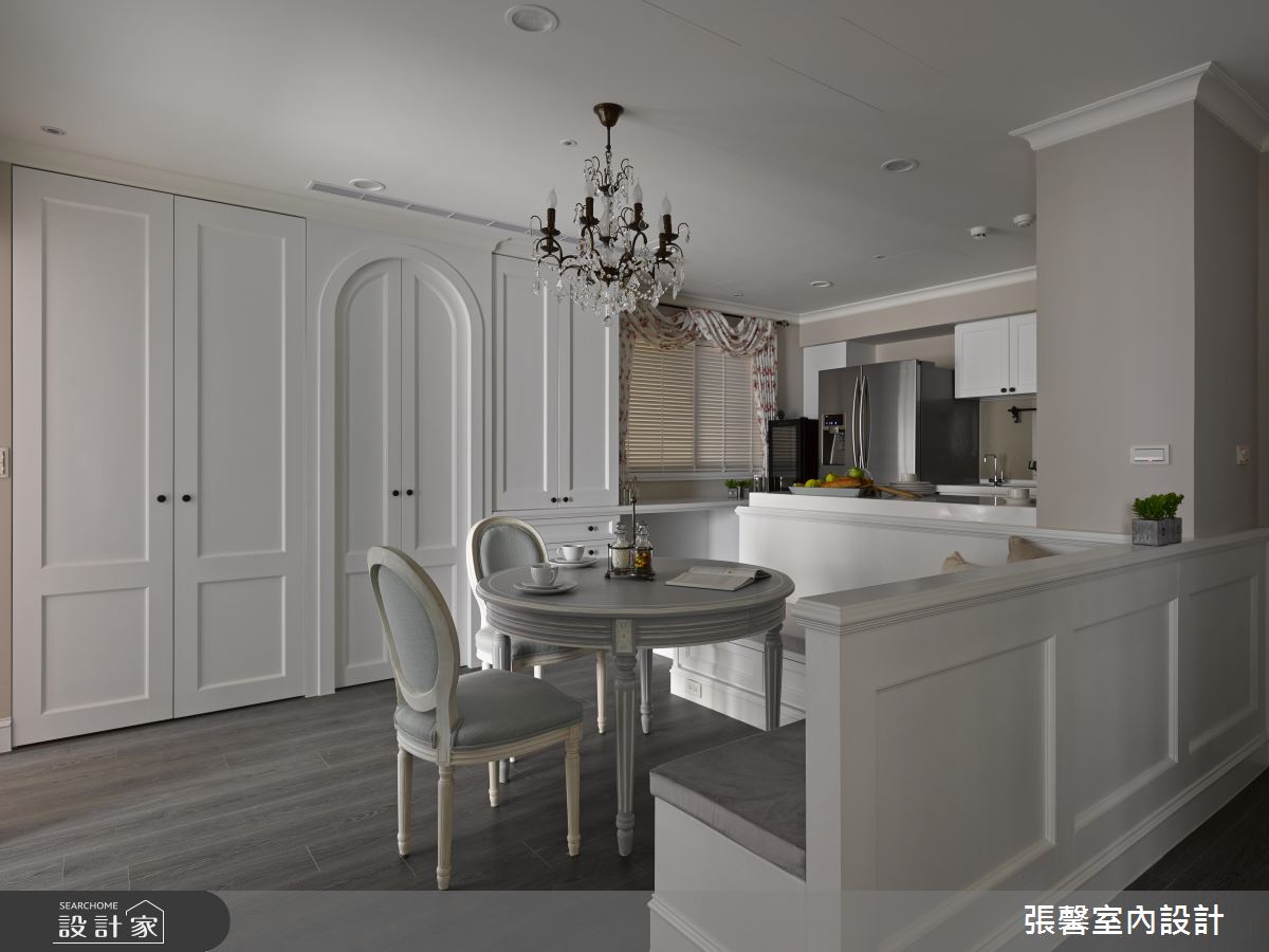 玄關利用壁紙及色塊表現,塑造精緻視感,溫馨中不乏精緻亮點;客廳則散發著濃濃的美式鄉村風情,以仿壁爐電視牆作為主角,搭配純淨基底及厚實家具,勾勒美國影集般的經典畫面,佐以拱型線條、實木線板等元素傳達美式精神,在腰線及天花板處,皆充分展現了細緻工藝;從客廳延伸到餐區,則將通往陽台的入口加以修飾,並加入充足儲物櫃,維持立面的俐落美觀,且考量家庭開伙機率不高,沒有過多的油煙問題,於是讓廚房呈開放格局,一旁規劃的美式玻璃櫃,亦讓屋主珍藏品能充分展示,型塑走道的美麗風景;書房突破以往設計概念,運用自由開闔的門片,提供有趣的層次動線,營造層疊交錯的格局,帶出閱讀場域中的安定感;主臥經由淡雅色彩與線條比例,抓住女主人嚮往的唯美風情,在滿足風格期待的同時,也透過美式門板的設計,將衣櫥、梳妝檯等實用機能隱於門片後方!