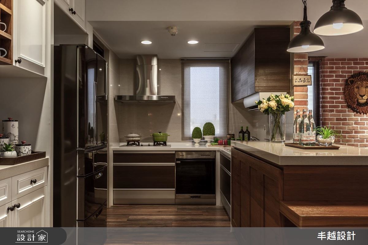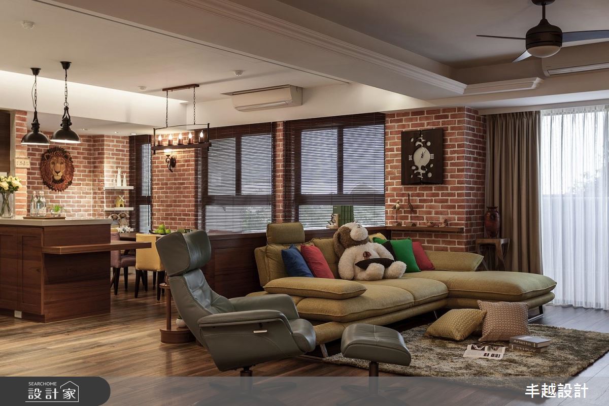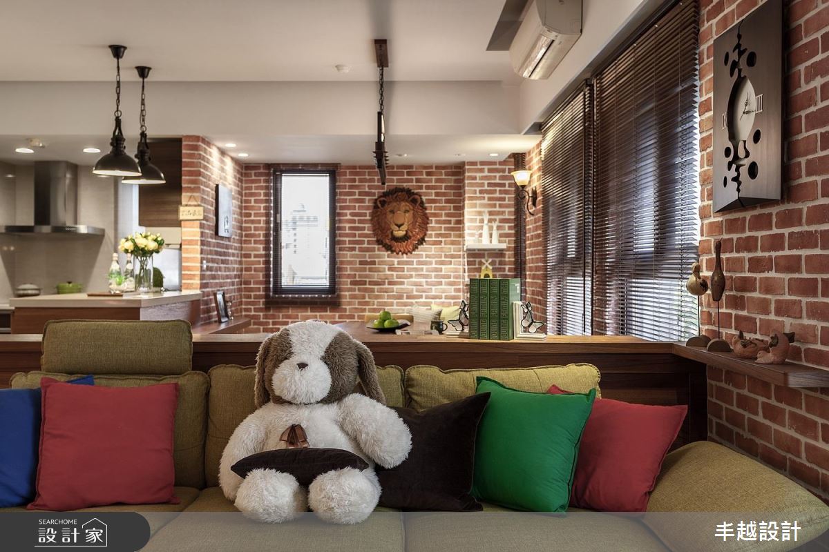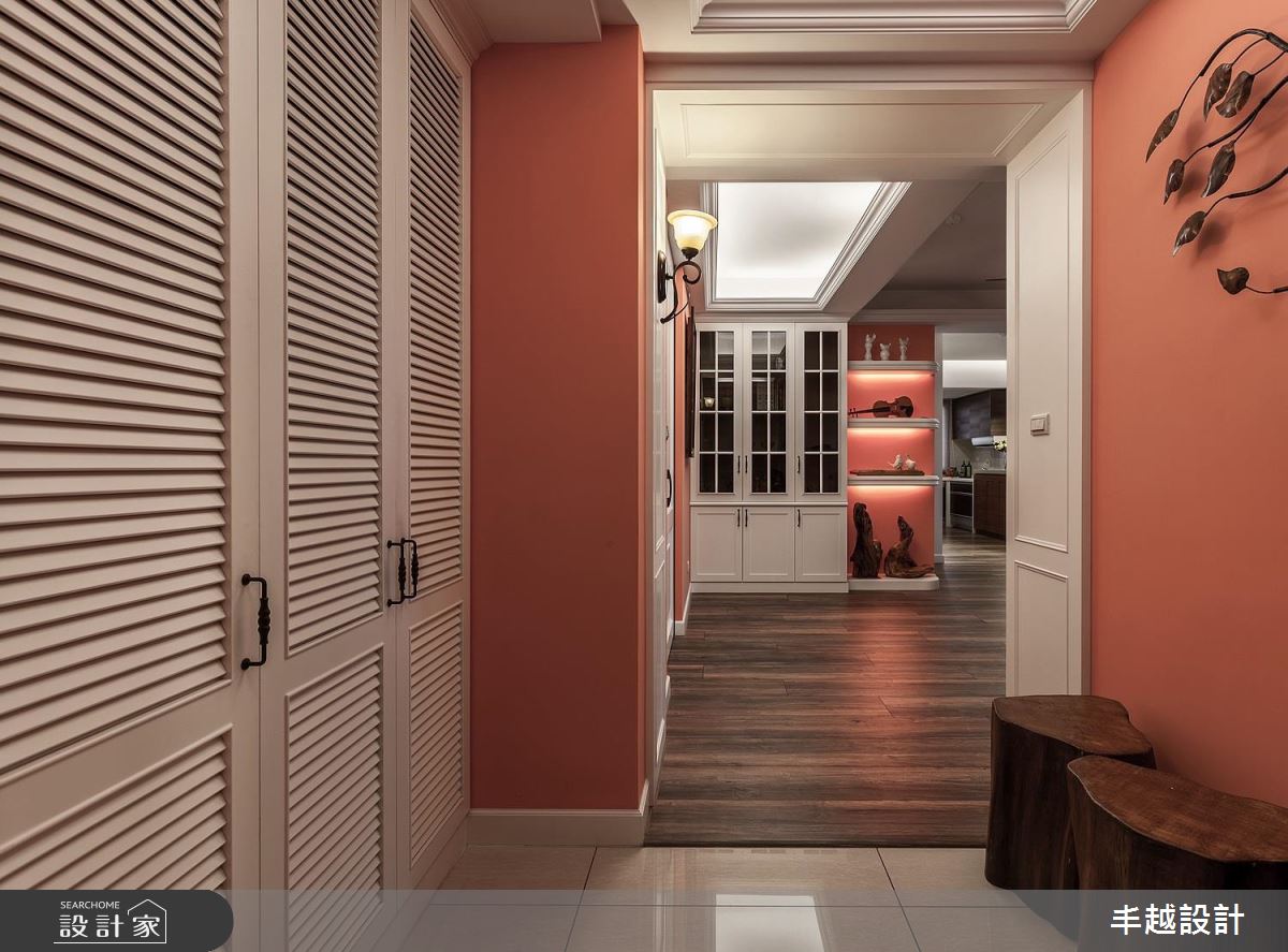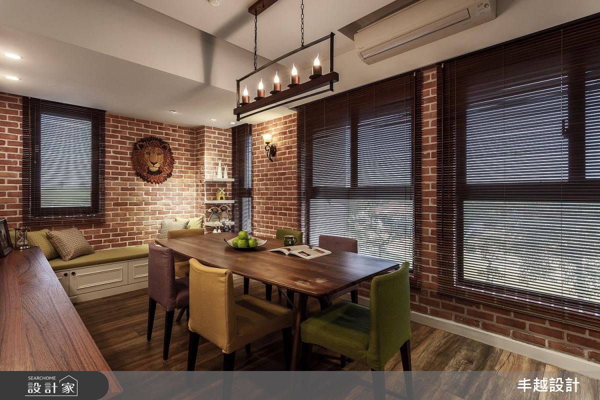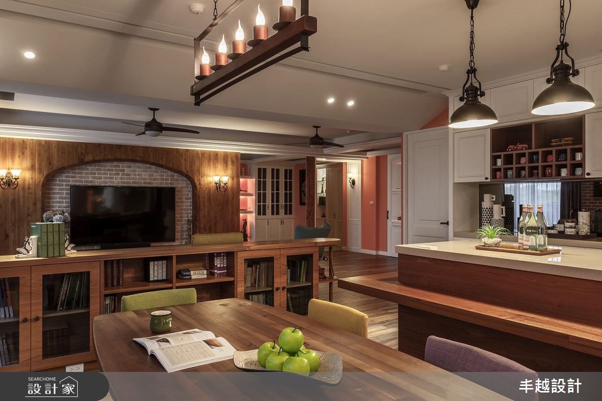 玄關處,加入儲物量充足的百葉收納櫃,以輕淺的白搭上珊瑚色牆面,營造典雅氣質的入門觀感,步入室內後,即可見明亮寬敞的公領域視野,不僅保有廊道開闊性,也刻意讓沙發牆呈半高型式,劃出開放相連的場域視線,電視牆立面更結合鏡面材質,創造雙倍放大的空間感,並給予紅磚牆的疊砌,選用原木質感家具、跳色軟件妝點等,打造清新耐看的鄉村韻致;餐廳、廚房藉由中島形成二者之間的串聯,且挹注唯美燈光,烘托舒適好感的用餐氛圍,並於一旁規劃休憩臥榻,開啟更多的場域使用主題;廚房內則充分運用空間,結合現代化的餐廚設備,注入自在舒適的烹飪體驗,各項儲物安排更滿足一切收納需求;寢臥內採以白色壁板搭佐淺綠色作為主題色調,並植入符合需求的更衣間與收納機能,呈現出有別於公領域的鄉村雅韻!