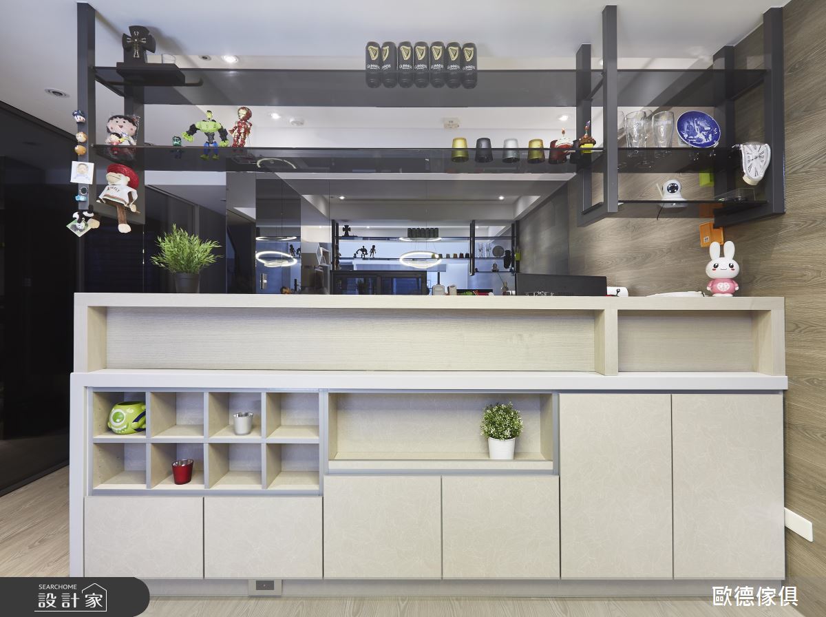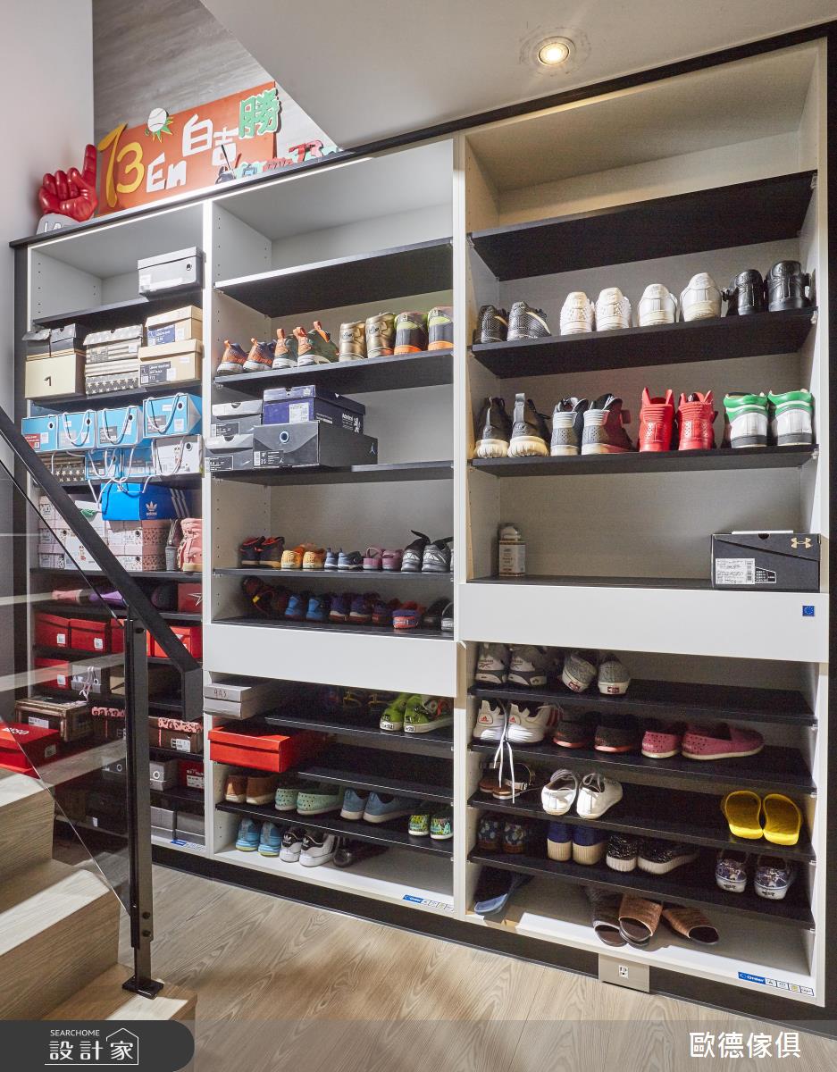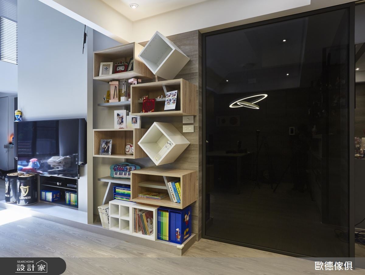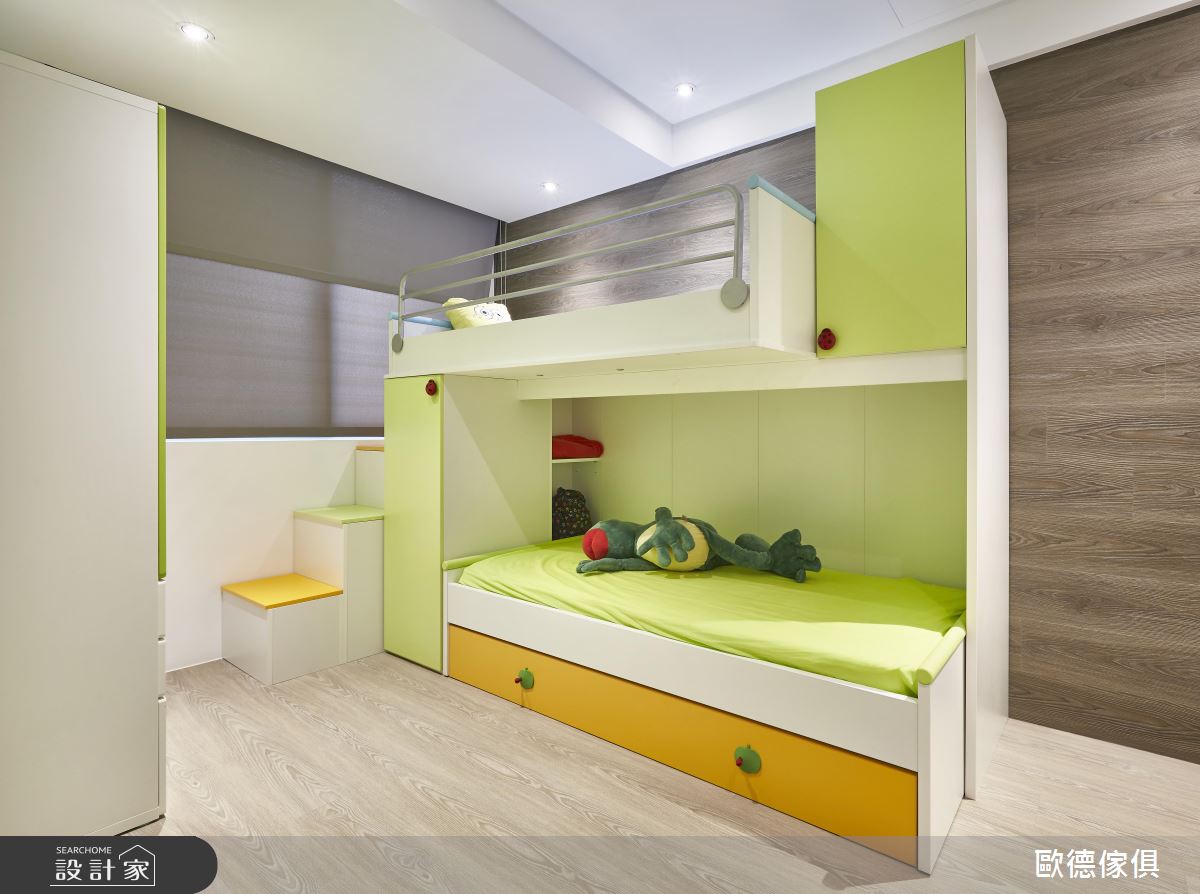 一樓公領域為一家人最重要的歡聚地點,由於夫妻倆喜歡簡單俐落的風格,設計團隊以原木色系書櫃結合客廳電視牆,平衡灰階色調帶來的冷調感受、打造開放式遊戲間,成為幼子們閱讀、嬉遊的小天地,也方便爸媽照看。一旁餐廚空間的櫃體結合吧台、收納與展示機能,讓夫妻倆隨時小酌怡情,更能因應親朋好友的歡聚需求、串連客廳餐廚空間。重視孩子們睡眠安全的夫妻檔,以孩子的意見為主,設計師選用明亮活潑的黃綠色調結合收納櫃與床組,在下層空間放上床墊,讓父母參與孩子的作息。另外,由於藝人有著大量造型搭配需求,因此設計師在入門處設置大片收納鞋櫃,讓百雙鞋得以有著充裕、一目瞭然的展示空間。