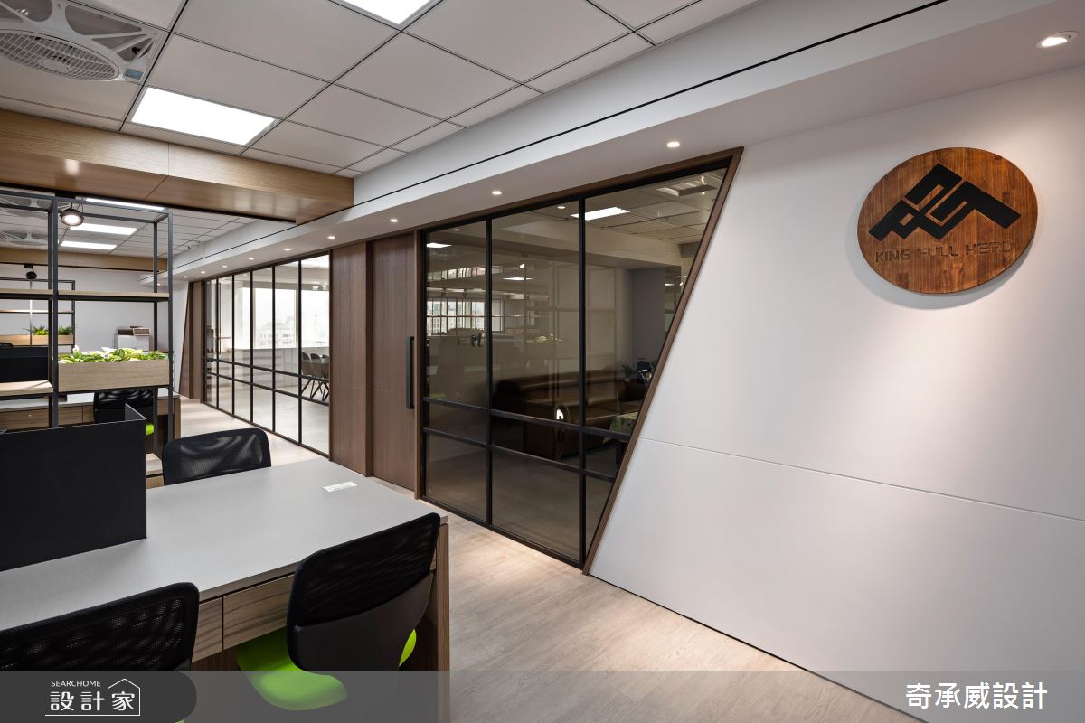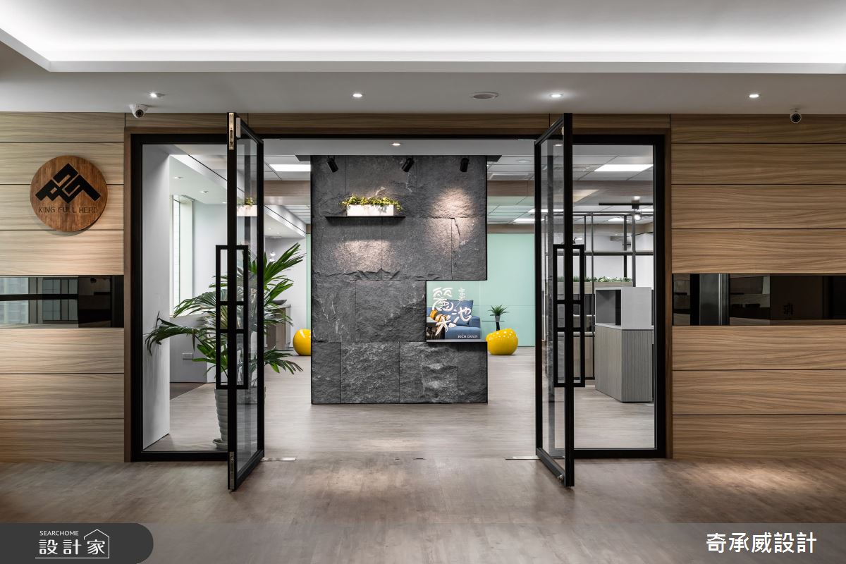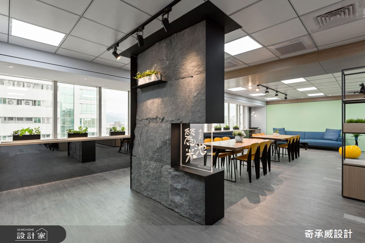 從入口處進入,富有鑿痕自然感的石質牆體,對外拉開了辦公區的隱私距離,其中也融入公司的品牌意象,成為令人印象深刻的第一道風景辦公區具有大器的視野和開放格局,天花板處運用大量的鏡面元素,顯得明亮開闊,也不失現代精緻感,秩序井然的員工座位區,桌面旁設有鏤空的檯面,可做為物品置放、收納的用途,並以黑色隔板劃分各自隱私,形塑專心一致的工作氛圍。會議室安排在內側,透過玻璃隔間延伸視覺,引進自然採光,也塑造出通透開放的空間感。