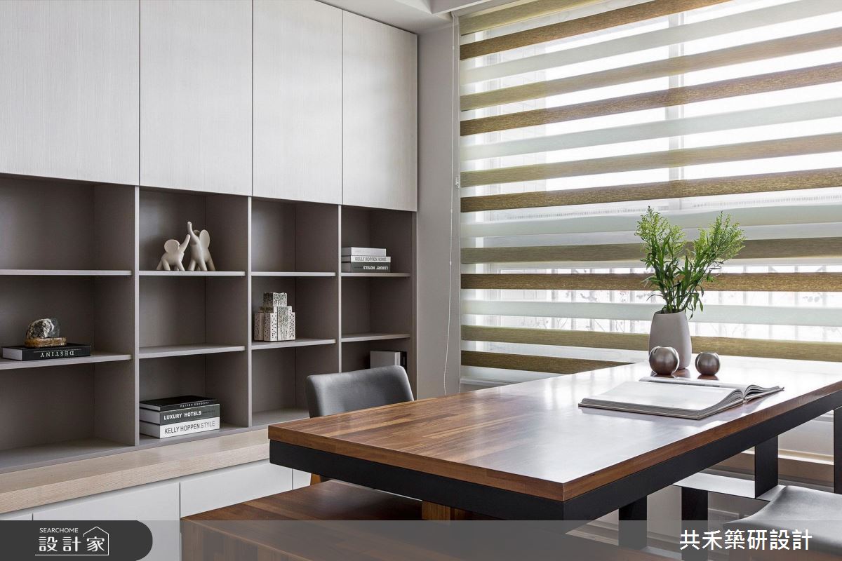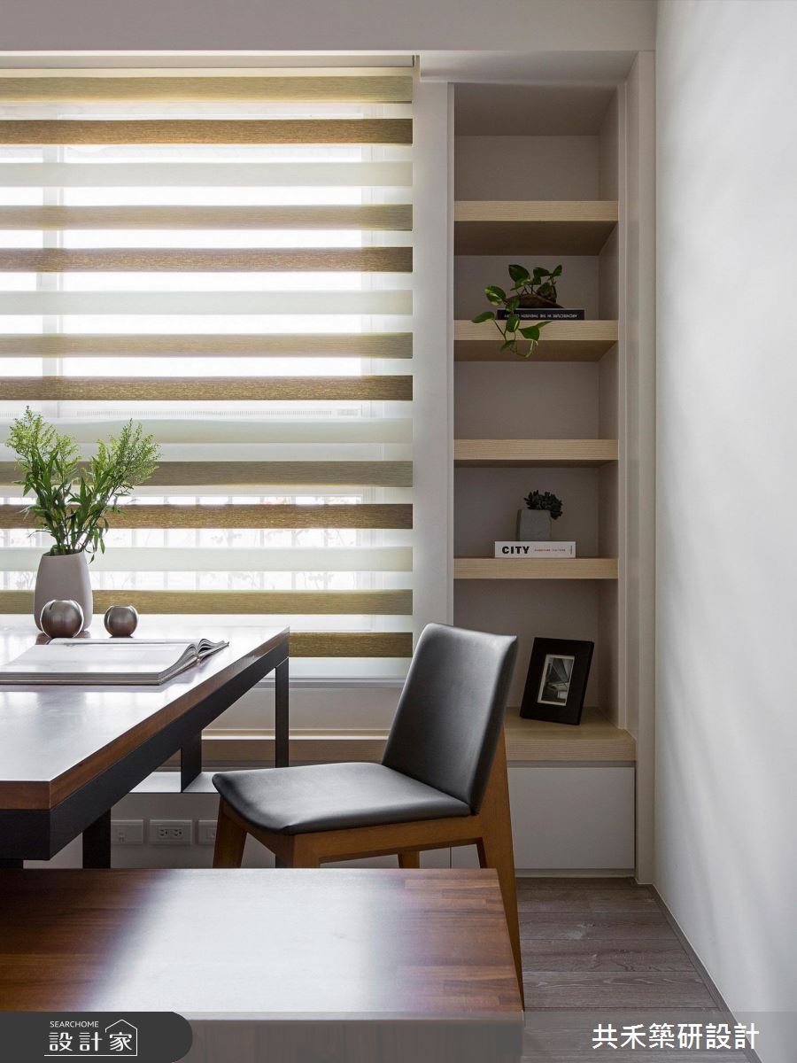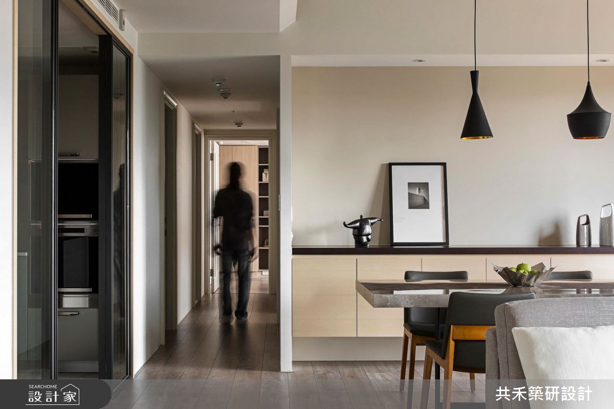 以石質和木皮等異材質拼接的玄關空間,將動線引渡至寬敞的客廳公領域,清新的日光透過陽台落地窗灑落室內,設計師運用溫潤沉靜的暖色系、簡潔的線條元素,承接明亮的自然光度,營造出舒適、放鬆的空間氛圍。富有石質結晶的電視牆和餐桌檯面相互呼應,在全然木質的居家中,挹注了屬於自然石質的沉穩、大器感受。廚房以玻璃鐵件拉門,隔絕油煙問題,同時也為烹飪區帶入充裕的採光,透過門片的開放彈性,更增進了家人間的生活互動。書房區和臥室依循溫潤的木質氛圍,賦予合宜的收納機能性,創造紓壓、實用的私領域空間。