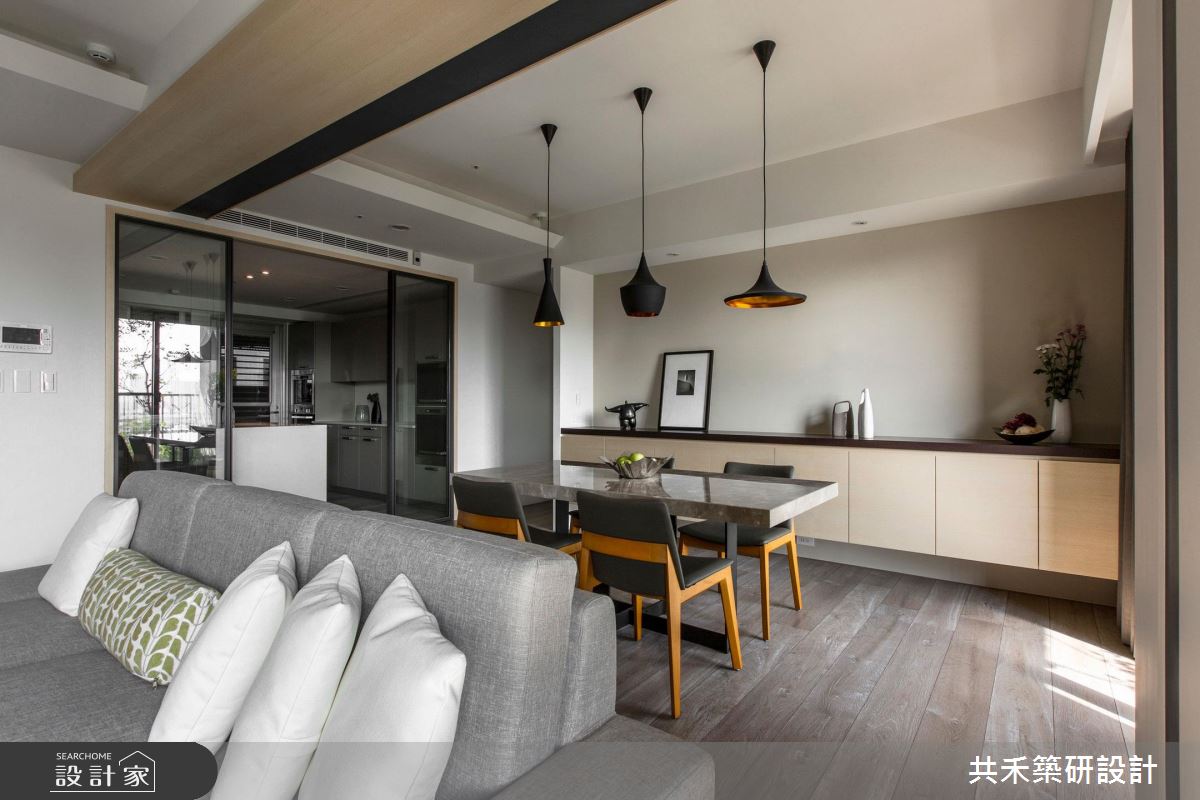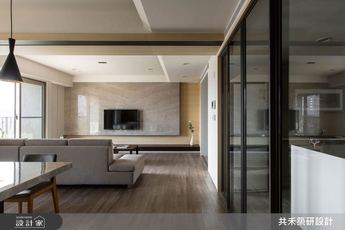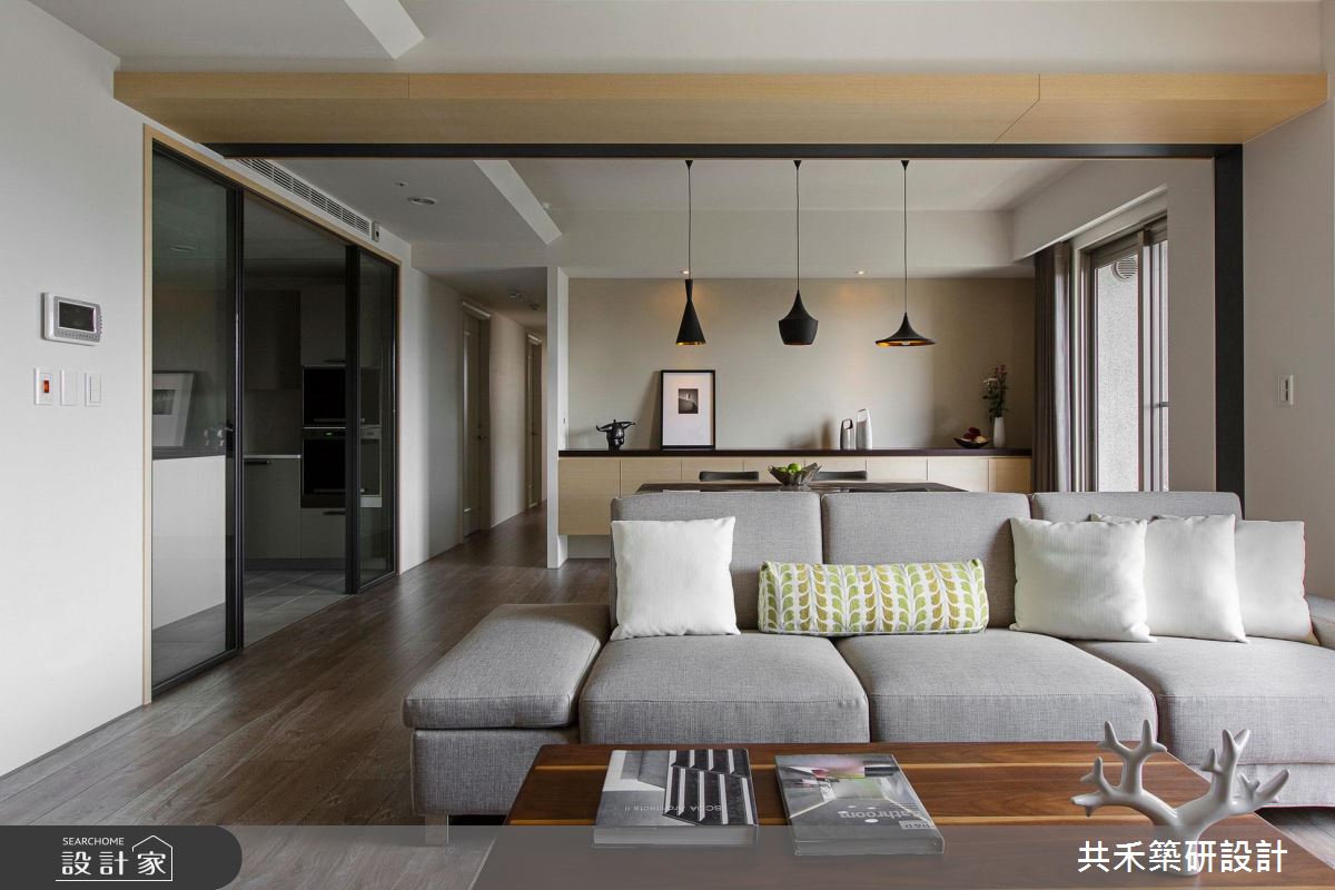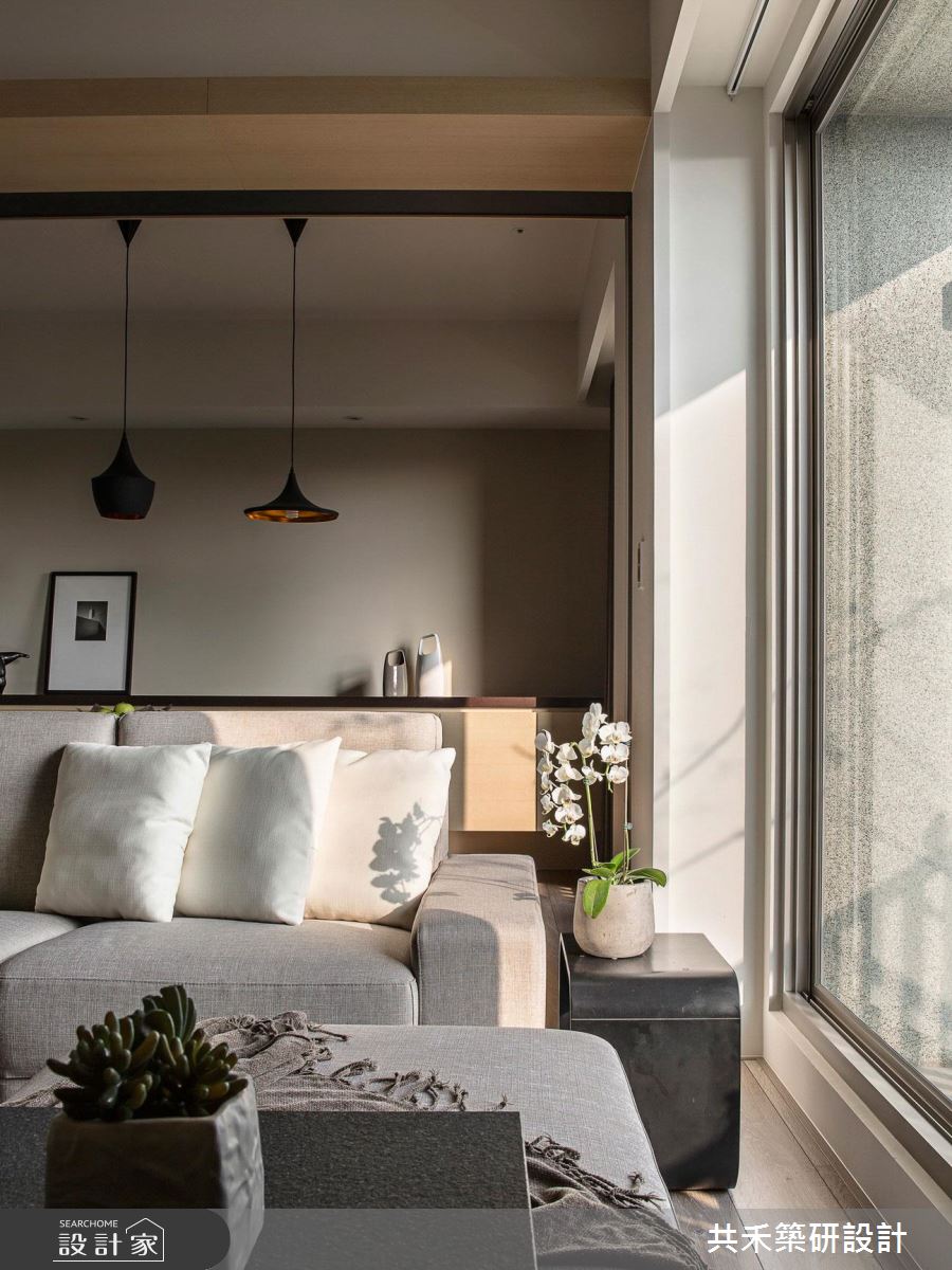 藉由大面的落地窗,將陽台景色、溫煦的日光引入室內,搭配低檯度的布織沙發,以及柔和溫暖的木色調,讓這處 42 坪的現代風住宅,隨時散發著幸福美好的生活溫度。