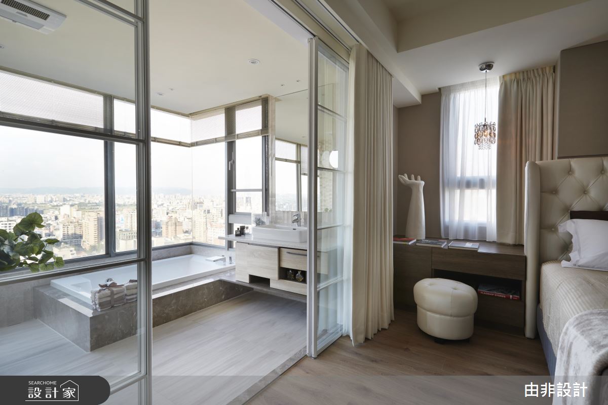 精緻、時尚的 54 坪休閒風居所,公共空間藉由開放式設計,以及書房處的玻璃隔間設計,流暢地連貫戶外陽台景色,使明亮採光得以流通、共享,並帶來了寬敞開闊的生活視野,居住者無論位於客廳、書房,或是餐廚區,都能同享高樓層住宅的絕美風景。收納的安排則由玄關處向客廳一路延伸,透過牆面跳色、大理石電視牆等,創造豐富的視覺變化和層次性,而軟件布置的部分,設計師運用純白、木色等溫質色調,搭配歐式的單椅沙發等家具,呈現出高級、精緻的舒適休閒感。主臥室融入星級飯店般的質感和機能,不但具有極佳的採光條件,設計師並將景觀最好的位置留給主臥衛浴,藉由大幅的窗景設計,廣闊的城景一覽無遺,讓屋主可以充分享受舒適、放鬆的洗浴時光。