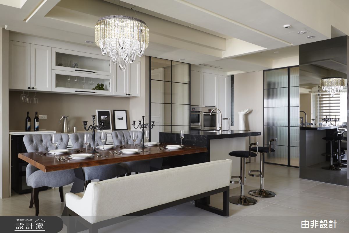 設計師利用玻璃拉門為廚房進行乾、濕分區,可以有效避免潮濕問題,並杜絕快炒料理時產生的油煙;而外部則安排電器櫃、收納櫃、中島吧檯等,作為日常的輕食準備區。