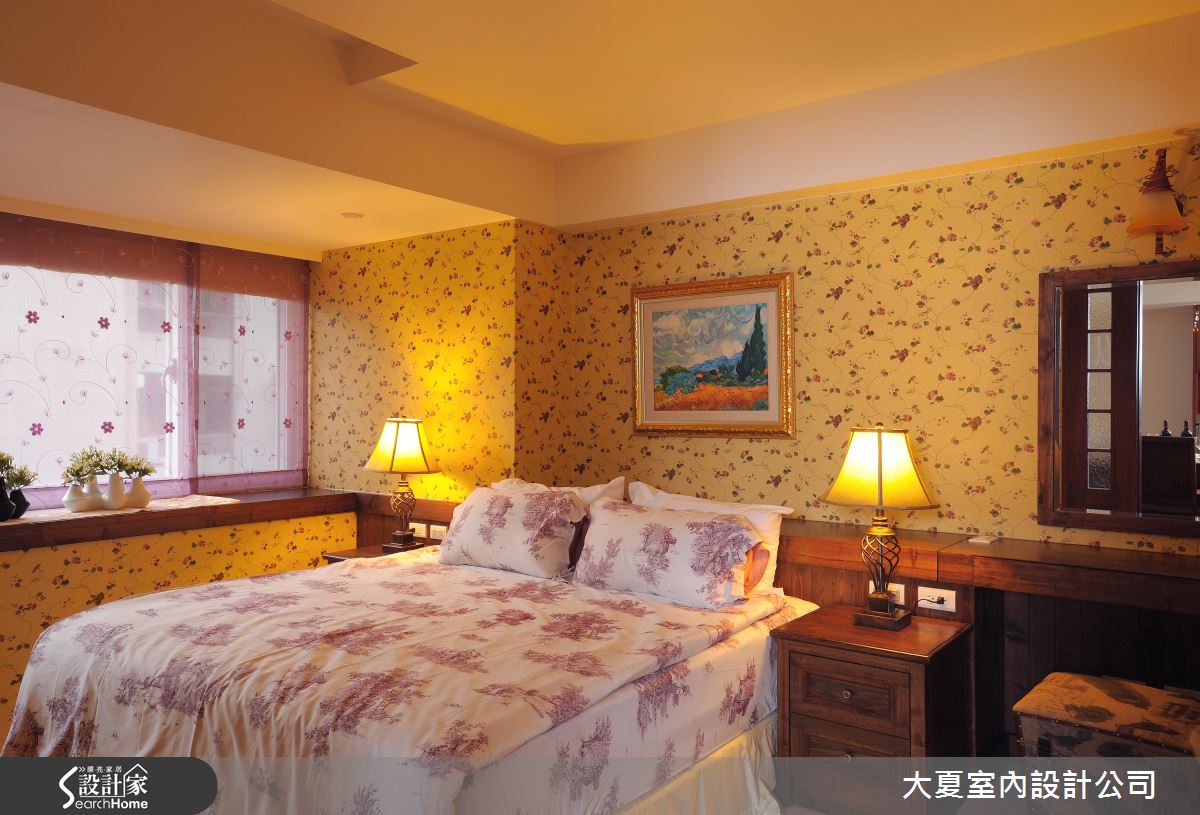 主臥室呼應鄉村風的浪漫特質,空間裡以黃底的碎花牆鋪陳,醞釀溫馨情誼;將梳妝檯、床頭腰櫃到窗檯以實木質材串連,優雅氛圍之中增添休閒與沉穩氣息。