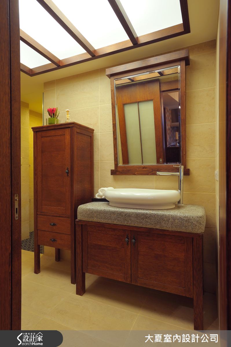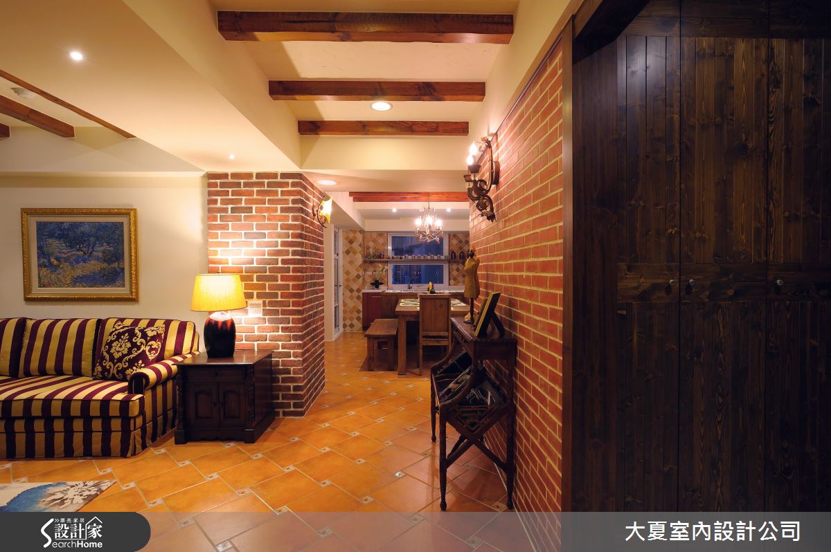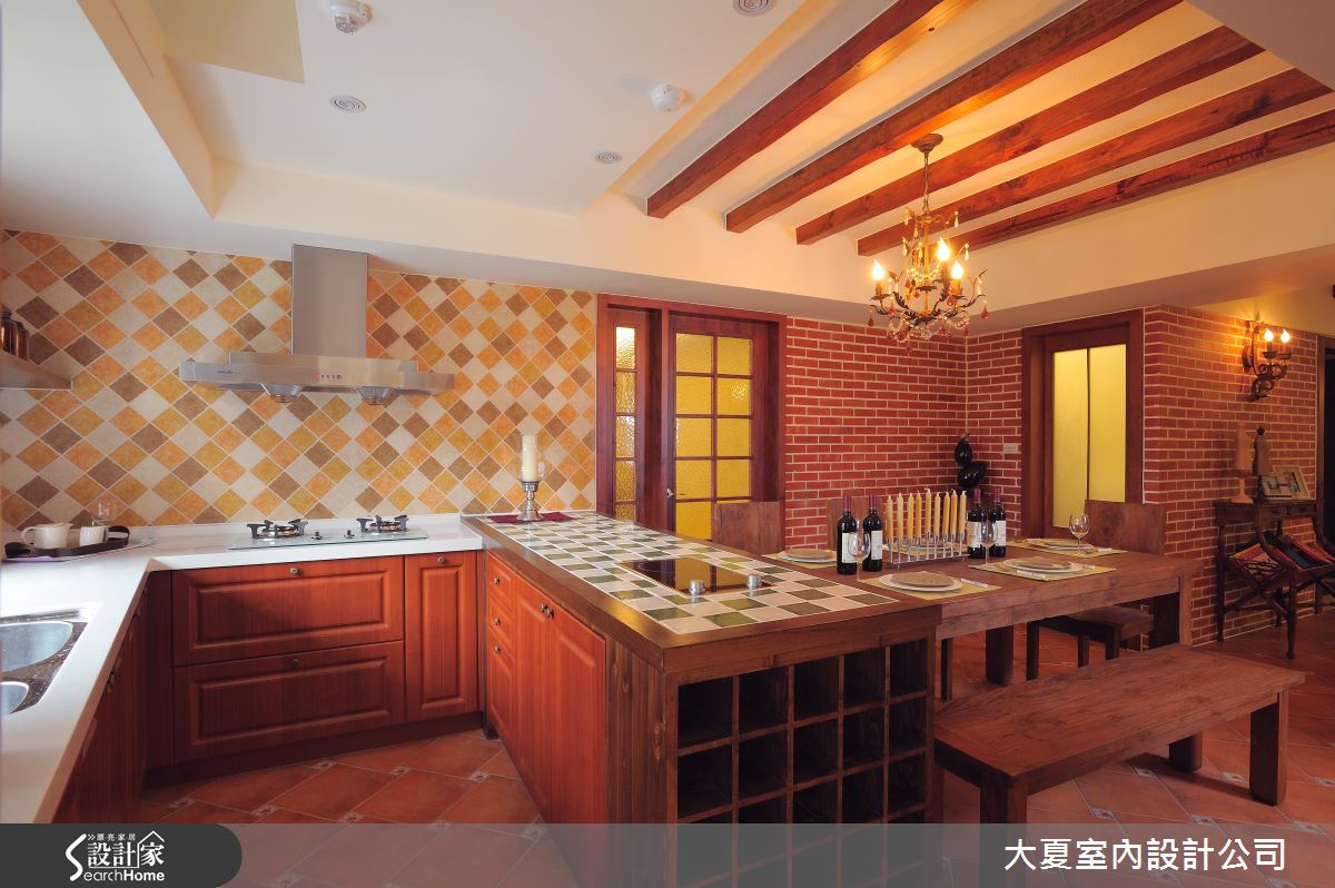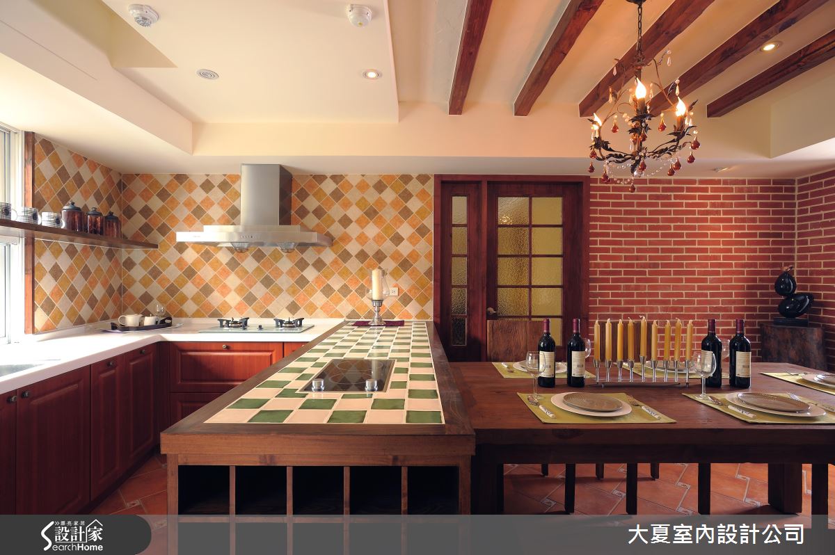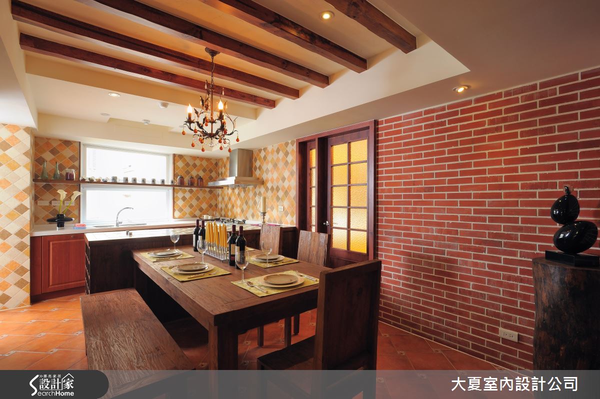 公領域的壁面與地坪以不同尺度與比例的磚面鋪陳,沿著天花板大樑與紅磚牆為界線,劃分出客廳的核心領域,電視牆以粗獷感的木板鋪敘,木樑串連天花板,再搭佐空間裡的條紋沙發、皮革單椅、大原木的長座椅兼展示平檯、原木茶几與花紋地毯,揉合原始與優雅的特質,調和出獨特的家居韻味;餐廚領域裡,藉由紅磚與花磚妝點壁面,餐桌與中島予以串連,創造出寬敞、自在的日常動線;樸實的木頭桌椅擺設,實木樑天花板搭配典雅燈飾,中島側邊還配置紅酒腰櫃,檯面鑲嵌綠、米色系的方格磁磚,呼應瓦斯爐的暖色壁面,創造出愜意且溫馨的用餐氛圍;流離台的壁面利用木作搭建展示區,開放且自然的陳列方式,讓生活物件能夠自在擺放,增添家的溫暖氣息與人文溫度。