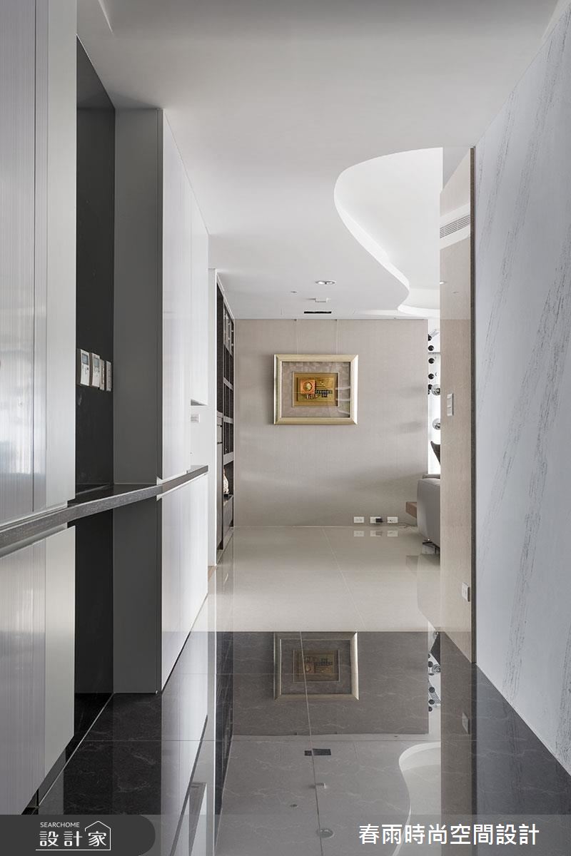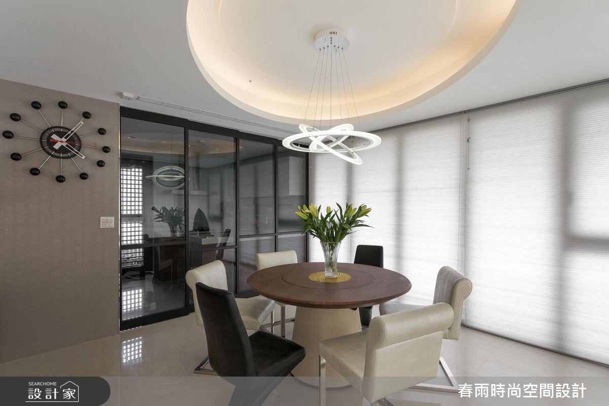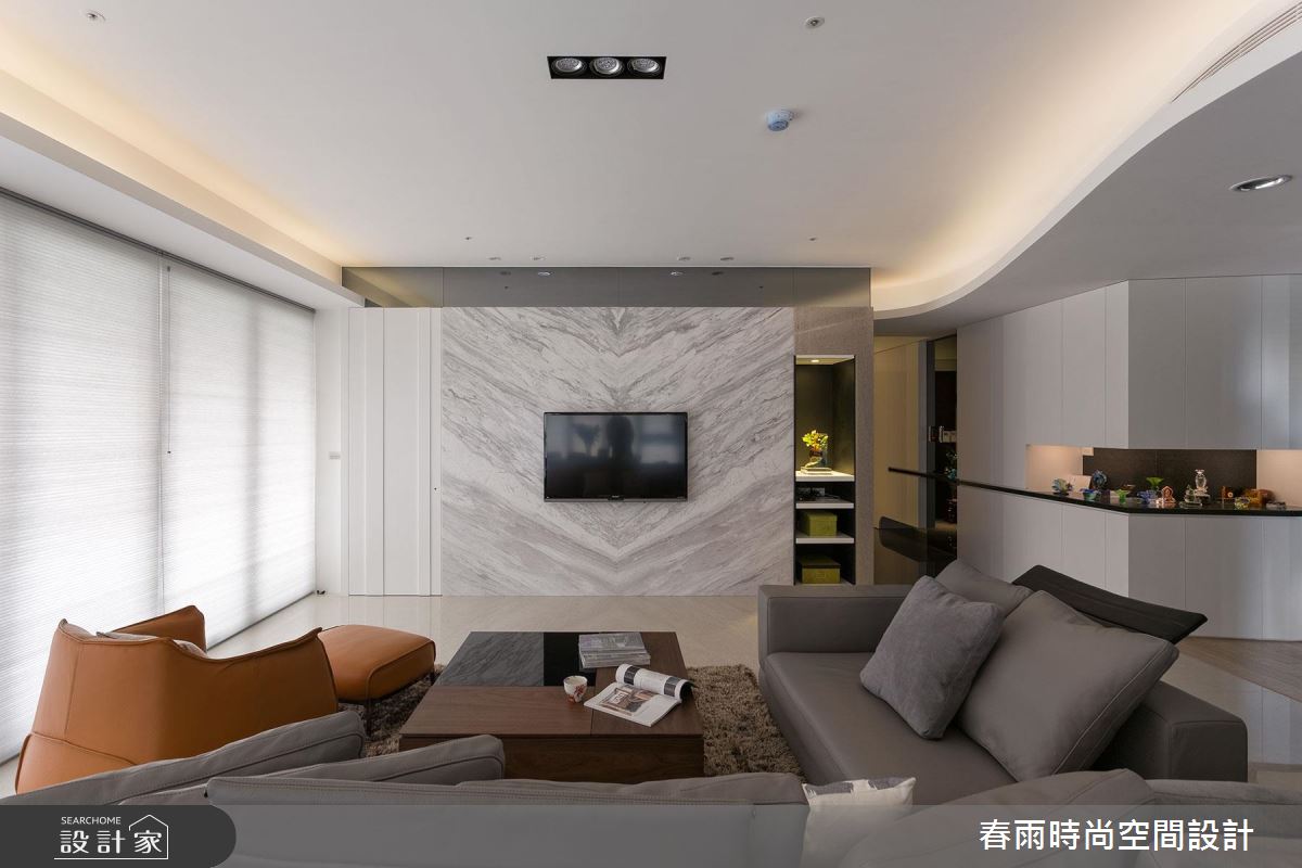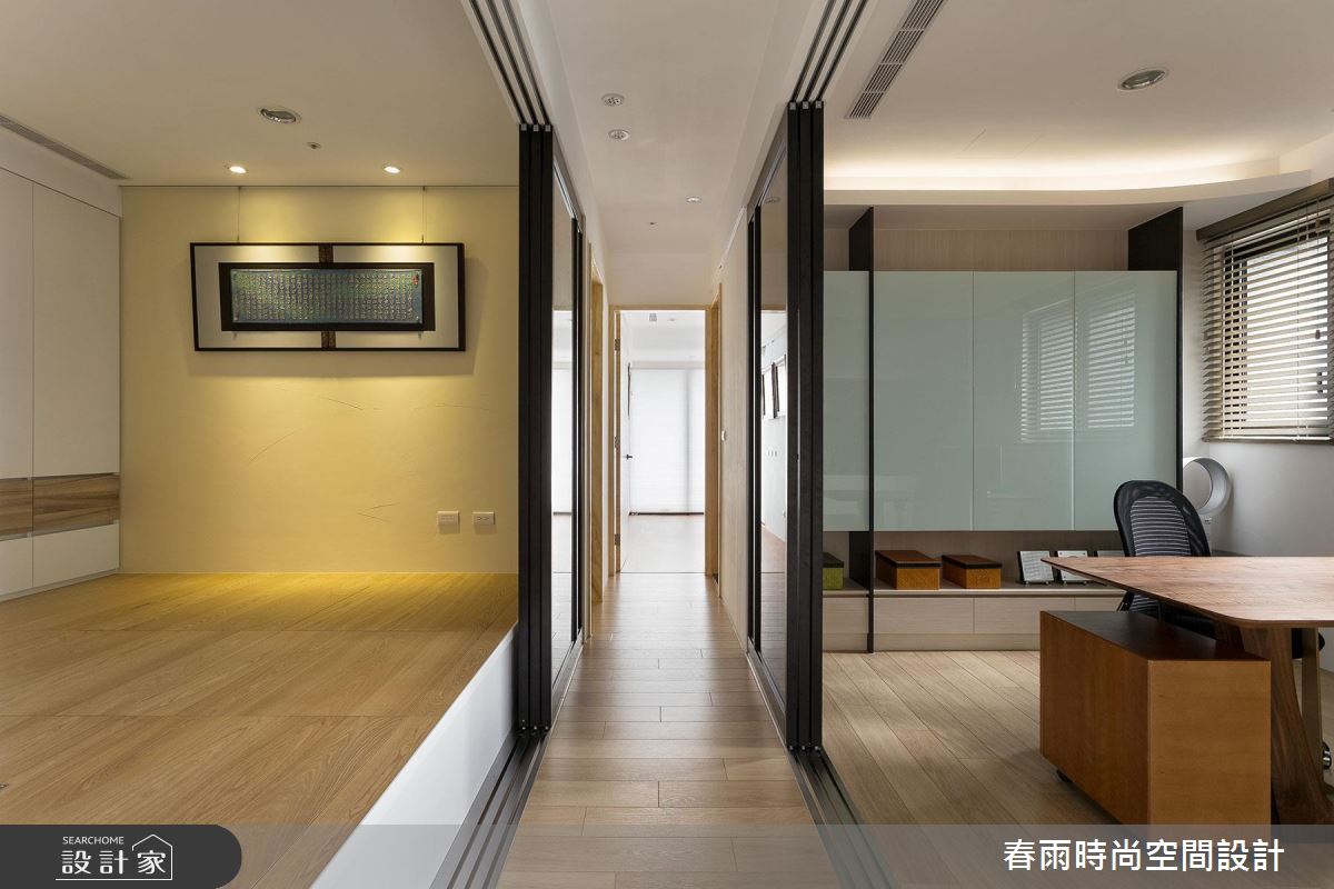 入口玄關區 ,以深色石材地坪勾勒大器場景,並在牆面加入藻土壁面,創造豐富的手感建材質地,牆腰處亦加入深色層板,形成動線指引及強調展示意味;步入廳區,則可見環繞式的優美景觀,運用大片窗面引進明媚採光,豐富整體敞亮度,搭配黑、灰、白等家具色調進駐,再適時妝點原木肌理,交織素雅但極具質感的住宅視野;同時藉著天花板的柔美曲線,串起客餐廳的關係,廚房、餐廳之間,則配置一道可彈性收放的玻璃拉門,不只達到阻絕油煙效果,開敞時亦串聯餐廚的互動性;書房、和室分別位處廊道兩側,以穿透拉門形成界定,保有廊道行有餘裕的空間感,也互相分享採光,提點整個過道的明亮度;而沿著客廳電視牆旁的隱藏門片進入,可來至主臥領域,室內採用無毒系統板材打造衣櫃,並巧妙以移動式門片,創造電視牆立面的不同表情,且規劃專屬更衣間,備齊一切衣物的收放空間,實際貼近使用者需求!