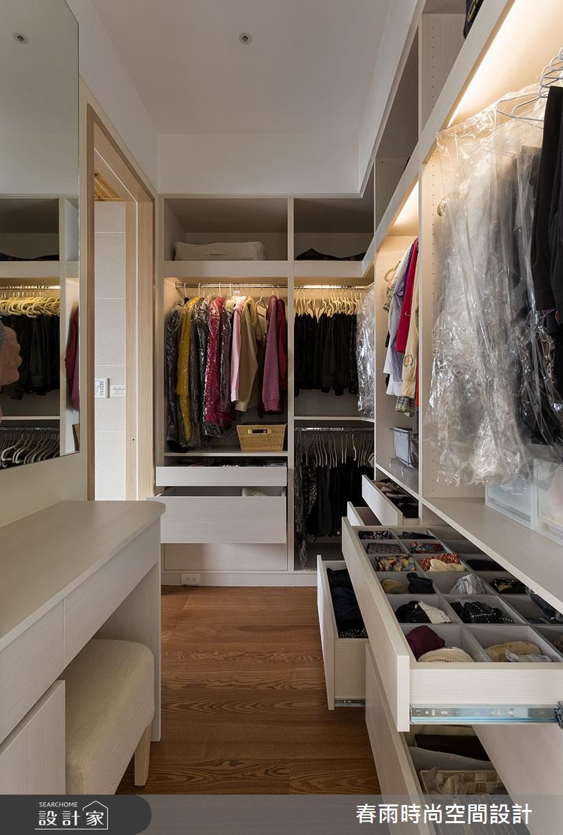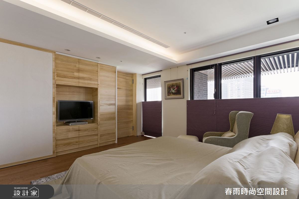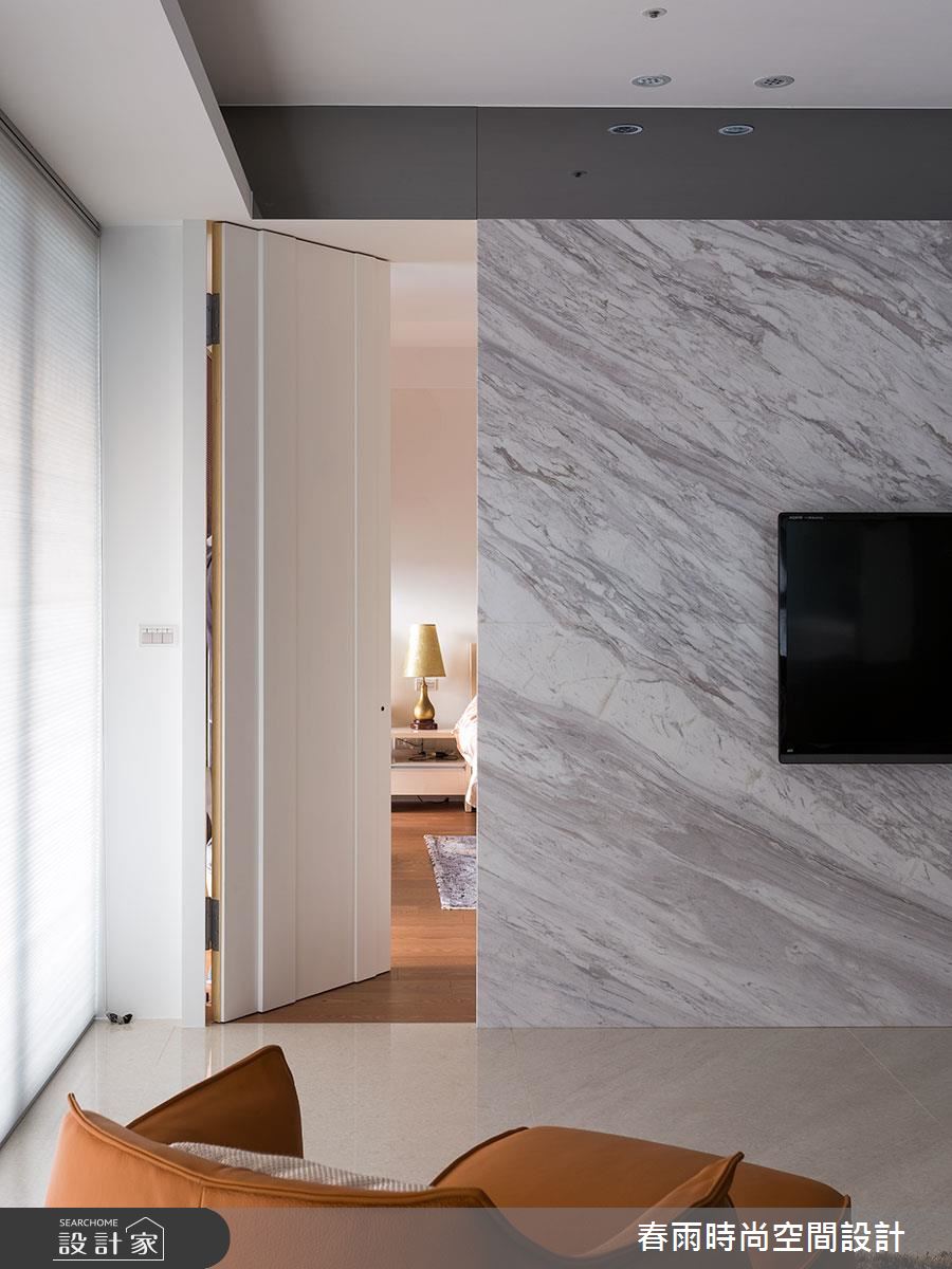 入口玄關區 ,以深色石材地坪勾勒大器場景,並在牆面加入藻土壁面,創造豐富的手感建材質地,牆腰處亦加入深色層板,形成動線指引及強調展示意味;步入廳區,則可見環繞式的優美景觀,運用大片窗面引進明媚採光,豐富整體敞亮度,搭配黑、灰、白等家具色調進駐,再適時妝點原木肌理,交織素雅但極具質感的住宅視野;同時藉著天花板的柔美曲線,串起客餐廳的關係,廚房、餐廳之間,則配置一道可彈性收放的玻璃拉門,不只達到阻絕油煙效果,開敞時亦串聯餐廚的互動性;書房、和室分別位處廊道兩側,以穿透拉門形成界定,保有廊道行有餘裕的空間感,也互相分享採光,提點整個過道的明亮度;而沿著客廳電視牆旁的隱藏門片進入,可來至主臥領域,室內採用無毒系統板材打造衣櫃,並巧妙以移動式門片,創造電視牆立面的不同表情,且規劃專屬更衣間,備齊一切衣物的收放空間,實際貼近使用者需求!