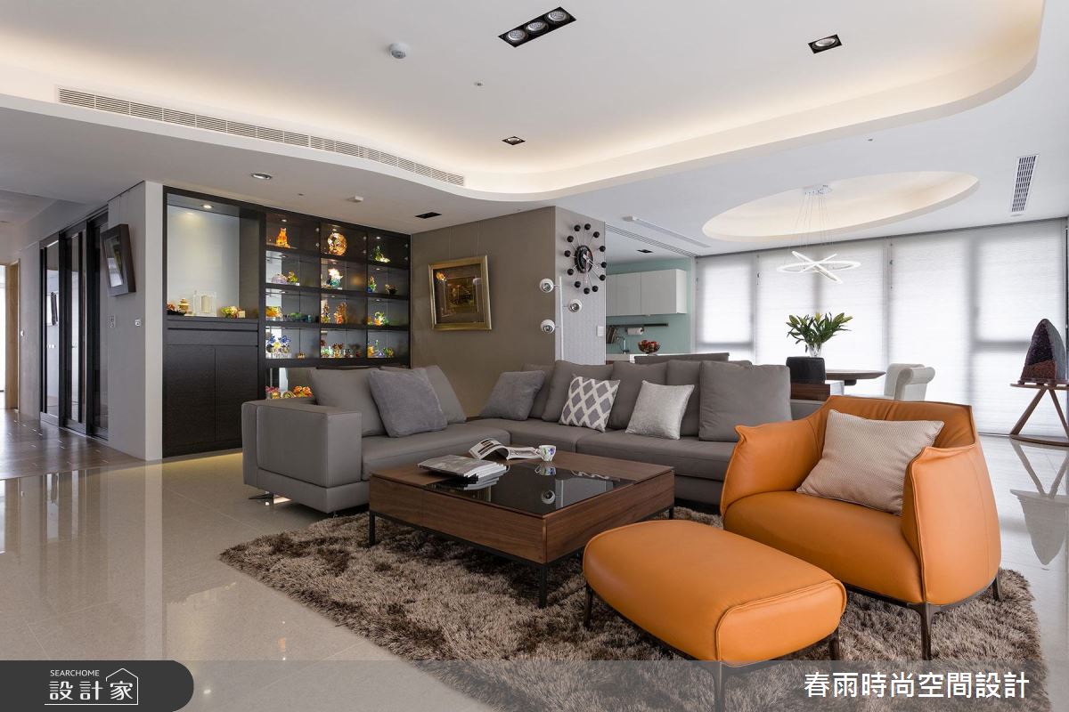 設計師讓屋主收藏的琉璃逸品融入空間設計中,成為客廳的一大亮點,搭配燈光、櫃體烘托藝品的細緻色澤,點出居家主人的雅致品味!