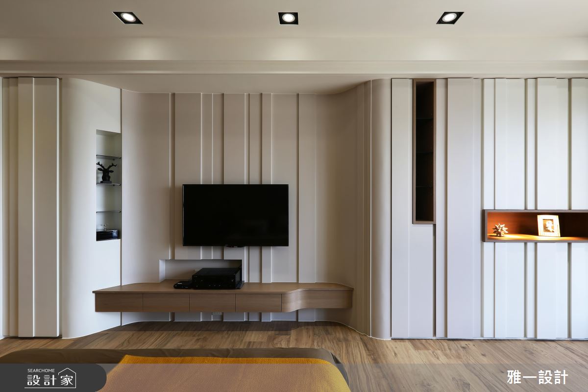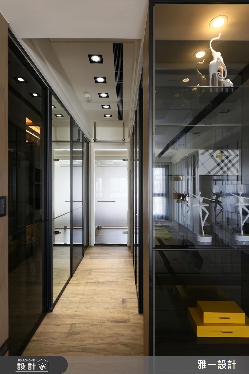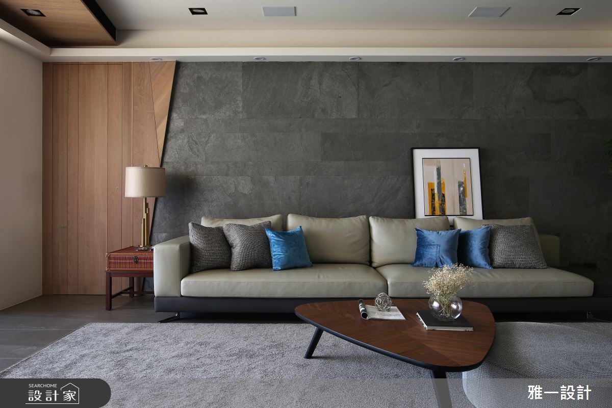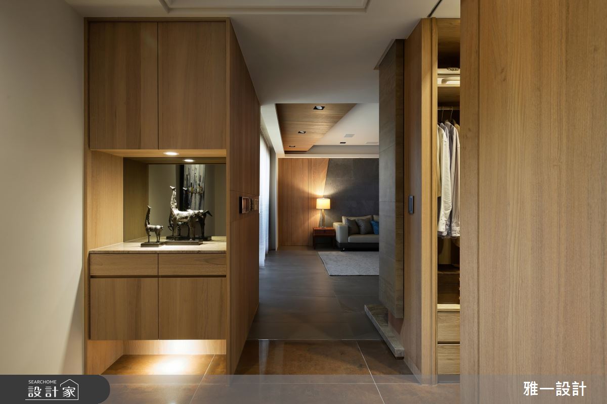 設計師於玄關處加入不落地櫃體規劃,搭配輕盈的光影烘托,達到瓦解量體厚重的作用,同時依循居者需求增設衣帽間,運用門片隱藏空間,在大面積木質紋理的鋪陳下,帶出自然溫潤的材質張力;客廳內,則可見沙發牆的特色設計,藉由材質銜接強調立面的趣味性,並映襯出不同建材的特色,型塑對比效果,搭佐深藍與綠色的家具選配,描繪雅致的現代風情;主臥內,則賦予立面豐富層次,透過線條、壁材及弧度的完美交織,使每一道畫面都值得品味,構築猶如藝廊般的空間特色,且加入精品櫃式的收納配置,兼具實用度和裝飾性!