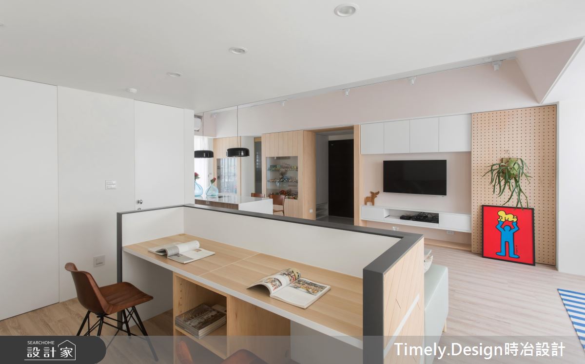 走進屬於姊妹兩人的居家間,迎面而來的輕淺木質色彩,帶來清爽的自然氣息,搭配繽紛療癒的軟件家飾,挹注了甜美童趣的視覺感受。公共領域以開放式設計規劃,結合了客廳、餐廚,以及工作書房等機能性,並融入複合式空間思維,例如:以兼具烹煮料理功能的中島吧檯取代餐桌,既滿足姊姊的烹飪需求,也為妹妹打造了和朋友們聚會的大空間;客廳後方則是半開放式的書房區,可作為姊姊平時的工作區,妹妹也可以在此完成手工藝的創作,透過多功能的空間規劃,為姊妹倆的生活創造最大的坪數效益!