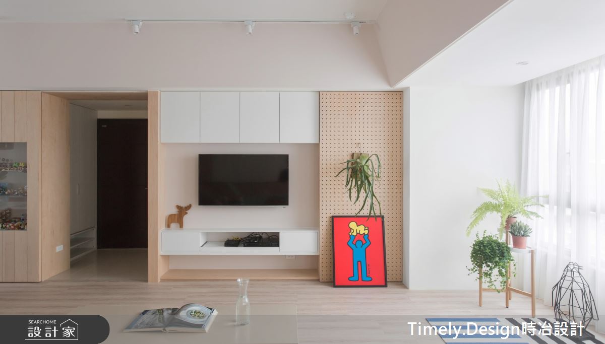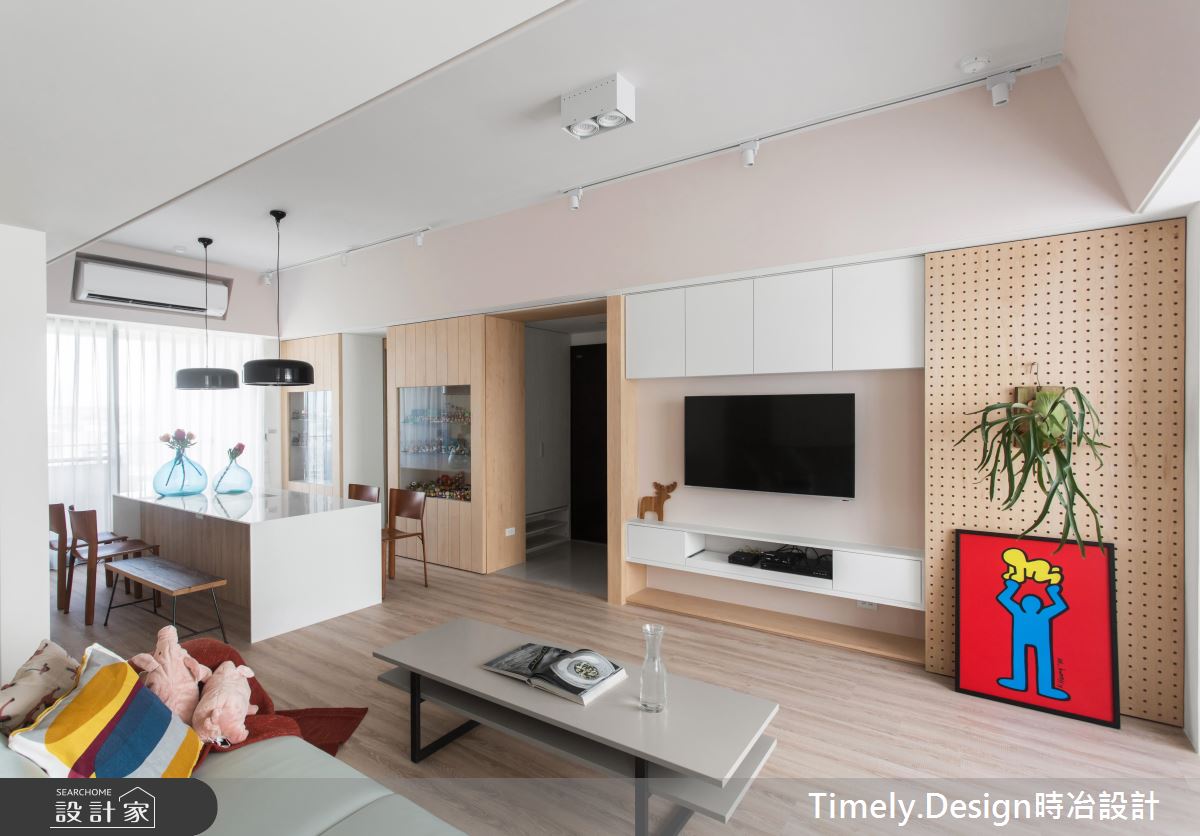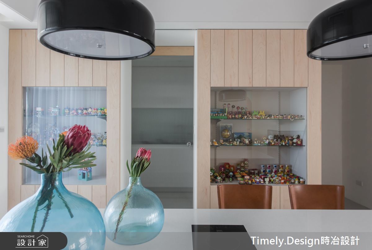 在收納的安排上也非常充裕,除了玄關櫃、電視櫃外,中島吧檯下方也是可收納的空間,一旁牆面則作為展示用途,讓屋主平時所蒐集的公仔,成為生活中的美好風景。