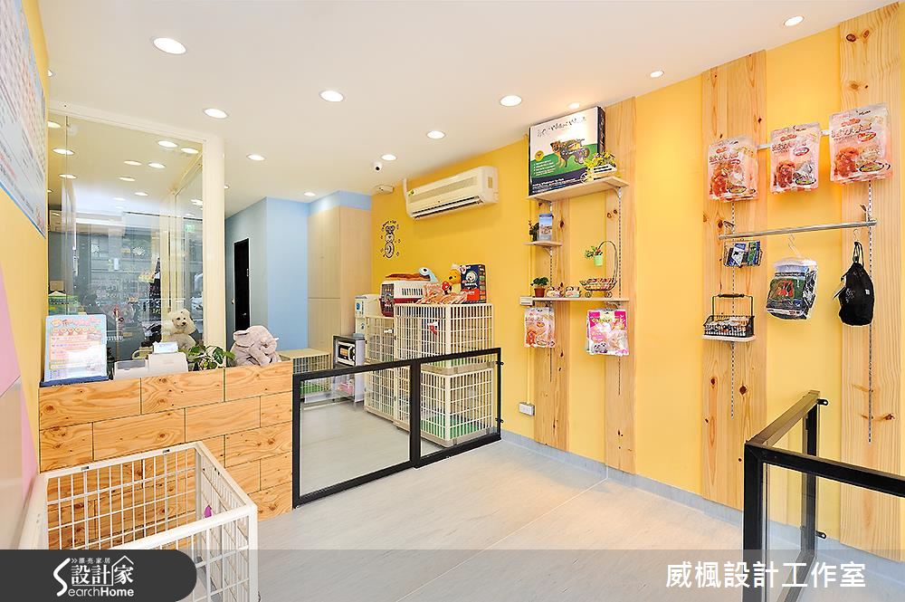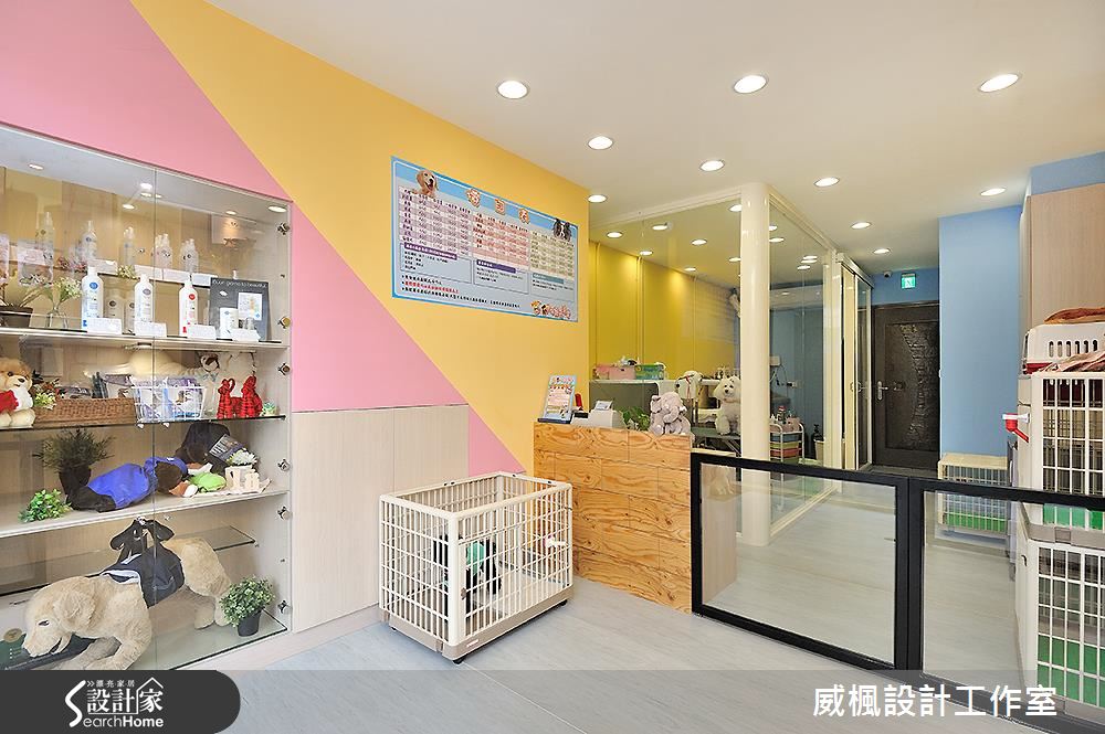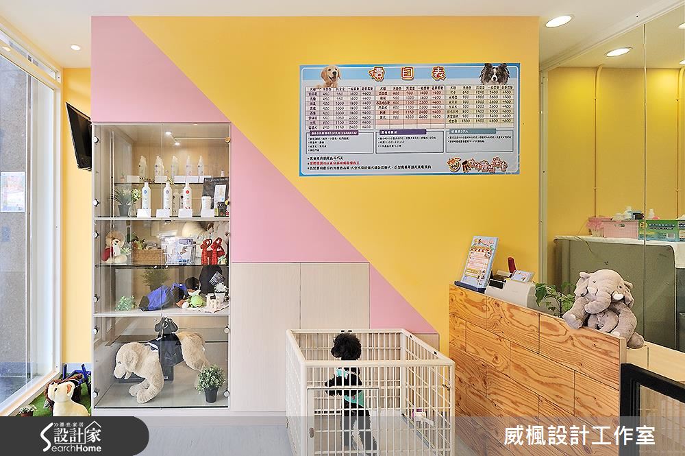 電動大門以玻璃質材打造,戶外的採光自然接引入室,溫暖且活潑的色調也一覽無遺,吸引路過的人們好奇與觀望,讓毛孩的父母能前往諮詢。入口處特別規劃一處舒適的遊戲區,讓毛孩可以盡情的奔跑、玩樂;室內的右側壁面以木紋舖陳壁面,層板上擺放毛孩需求的用品,或是風格物件作為展示;左側先以玻璃展示櫃陳列毛孩的生活備品,接著以黃、粉、灰的色塊堆疊幾何造型引領入室;室內領域以玻璃隔間為設計,展現開放的流動氛圍,且能夠隨時觀看美容中毛孩的一舉一動。