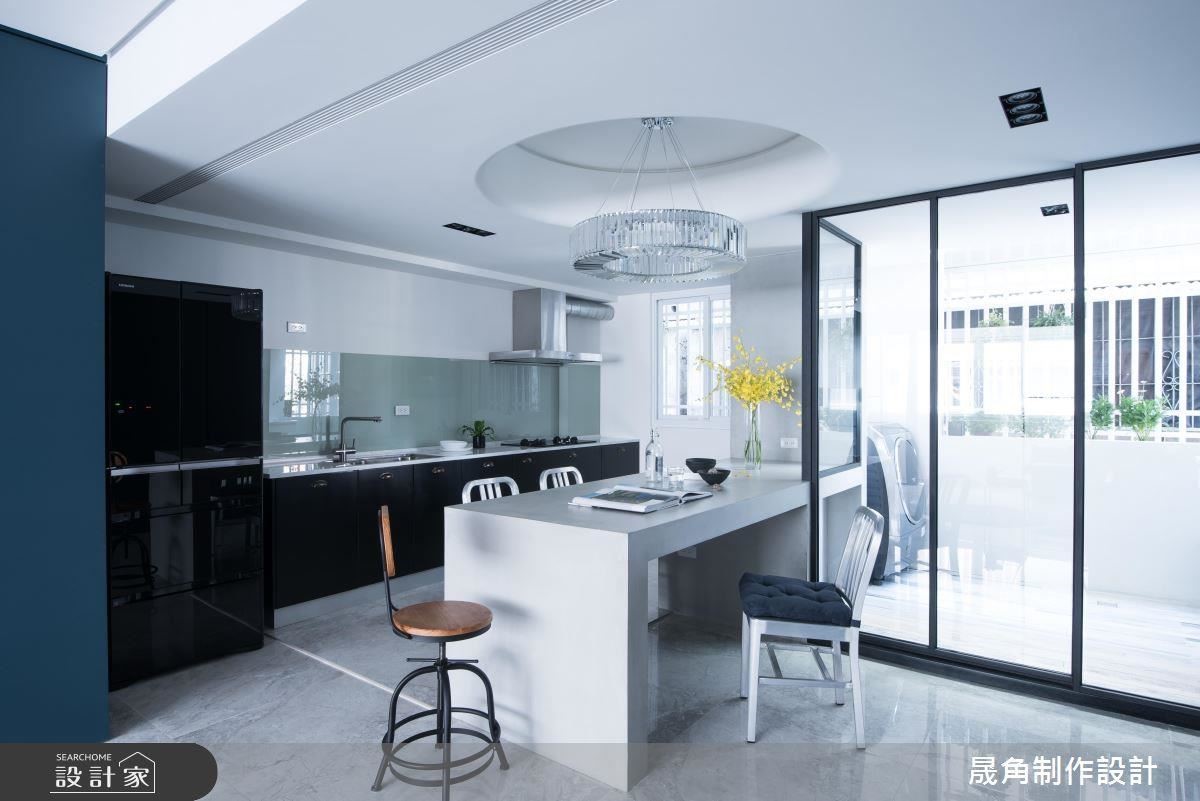 改建後的開放式一字型廚房使用便利,收納機能充足,烤漆玻璃的防濺板相當好整理,而刻意留白的上櫃位置,等待新婚夫妻未來有需要時再自行增添。