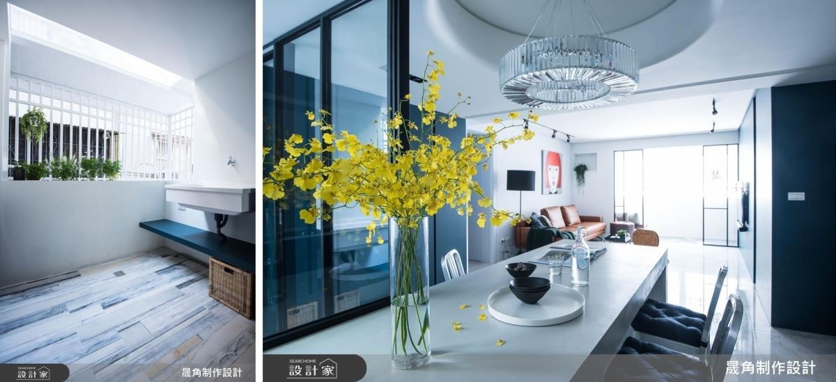 大部人寧可犧牲陽台空間,來增加室內空間,但這一次晟角制作設計師反其道而行,將餐廳內縮 45 公分,把空間留給後陽台,再鋪設木紋磚,一來增加後陽台的曬衣空間,二來也讓後陽台有地方供業主拈花惹草,上方的天窗納入更多的陽光(左圖)。
