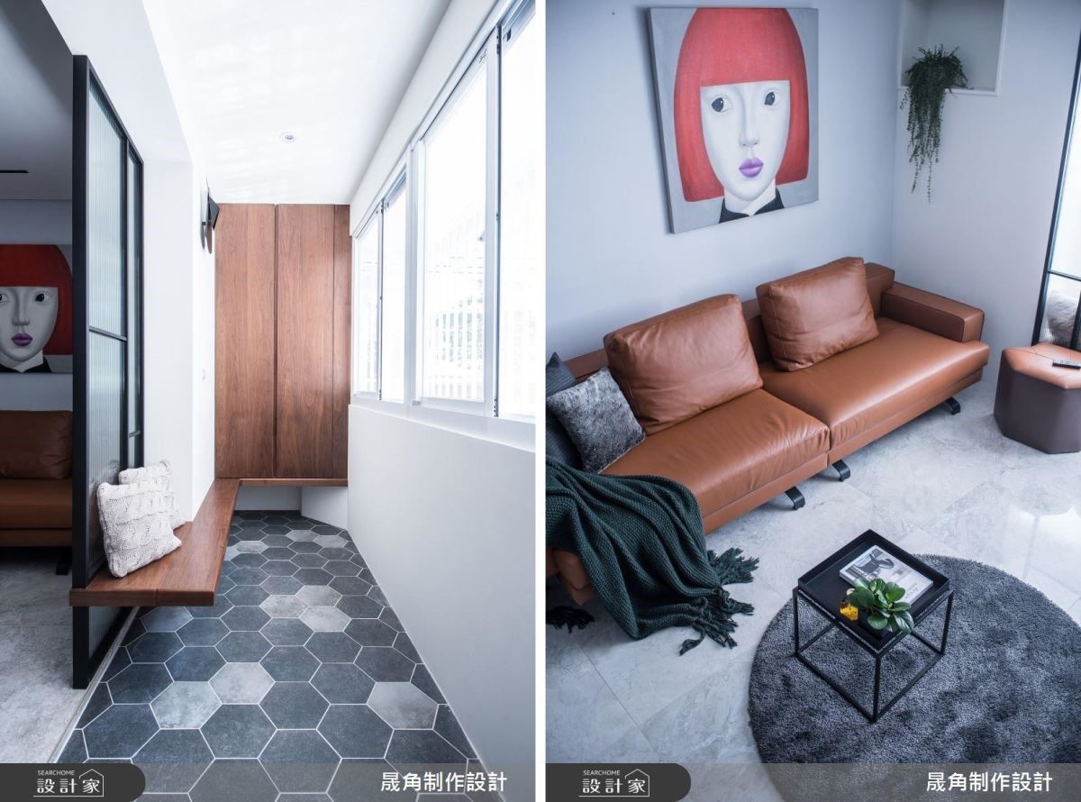 這間 25 年的老屋沒有更動太大格局,翻修過的前陽台變身貼心的玄關,靠近落地窗處做出穿鞋椅的設計,直紋玻璃窗再配上防滑的深淺灰復古六角磚,簡樸中自有個性(左圖)。