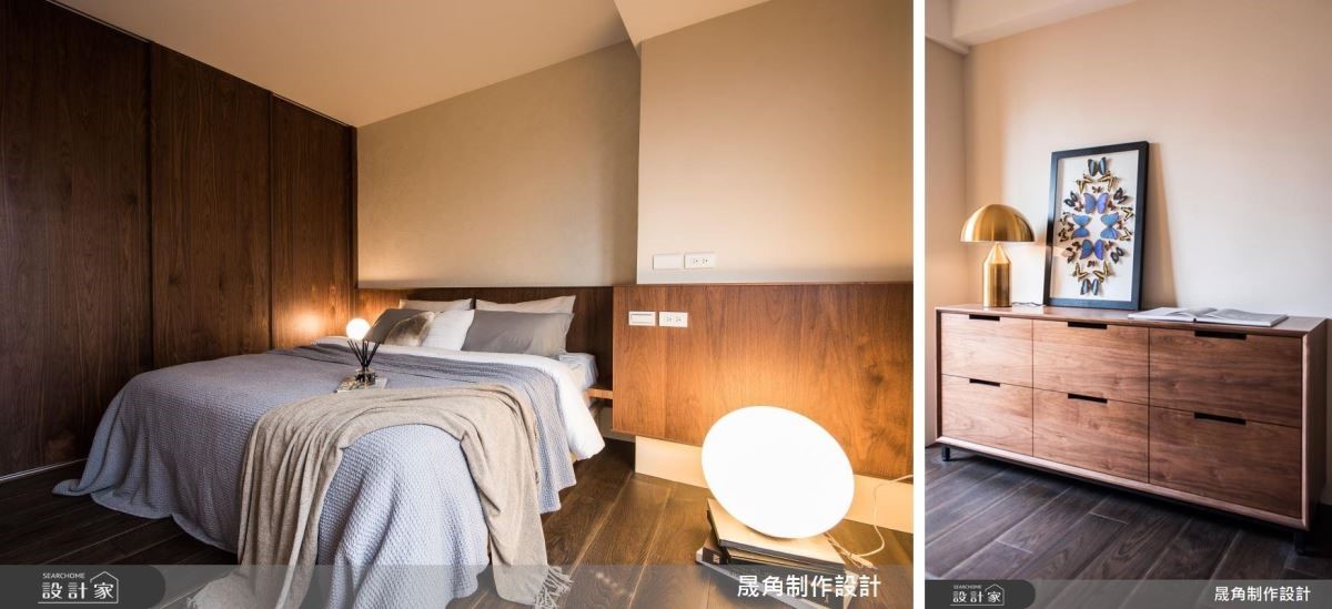 主臥室考慮健康需要,特別塗上珪藻土,以吸附空氣中的雜質,也呈現特有的溫潤質感。特別的是,頂天立地的大衣櫃深度比一般的衣櫃深約 1/3,足足有將近 80 公分深,一來可以收納行李箱之類的大型物品,二來因為主臥鄰近衛浴,衣櫃內靠牆處也塗上可以吸濕的珪藻土,防止濕氣作怪(左圖)。