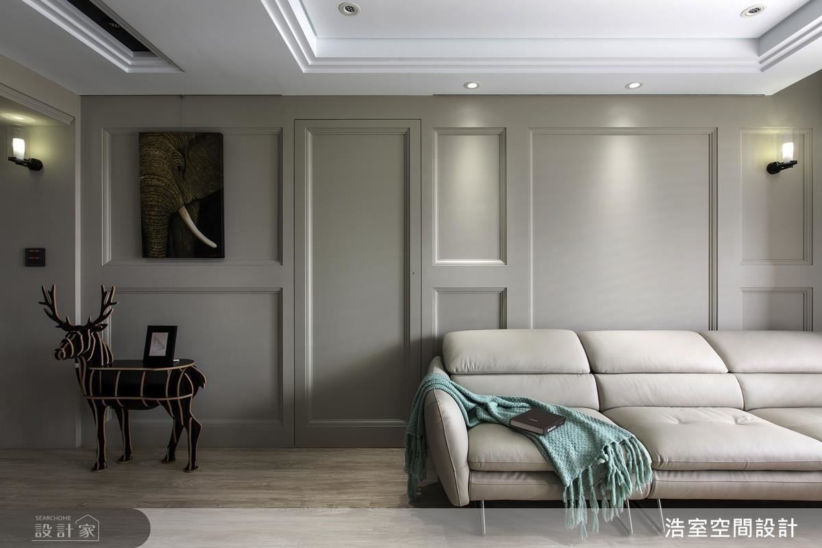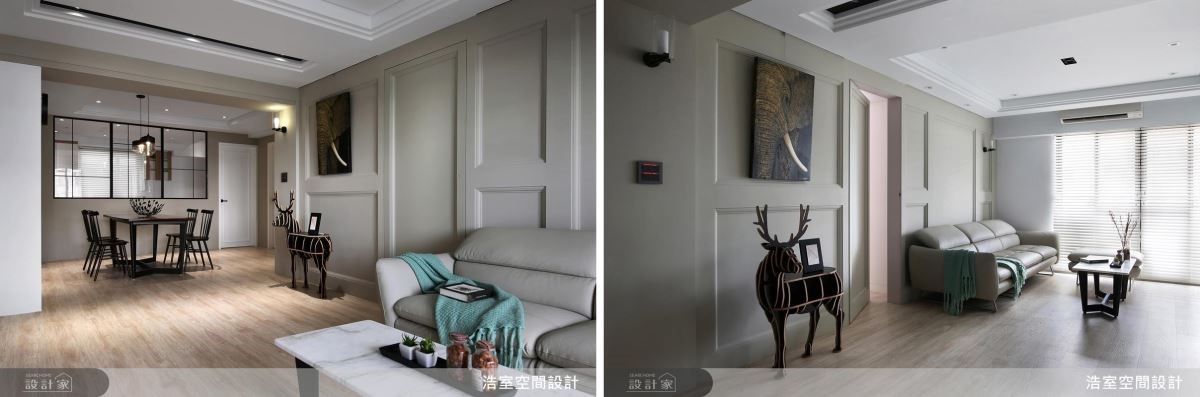 淺可可色一路佔滿客廳牆面,為了隱藏主臥室的入口,做出四方形的線板裝飾讓牆面產生變化,化解單調危機,一舉兩得(右圖)。