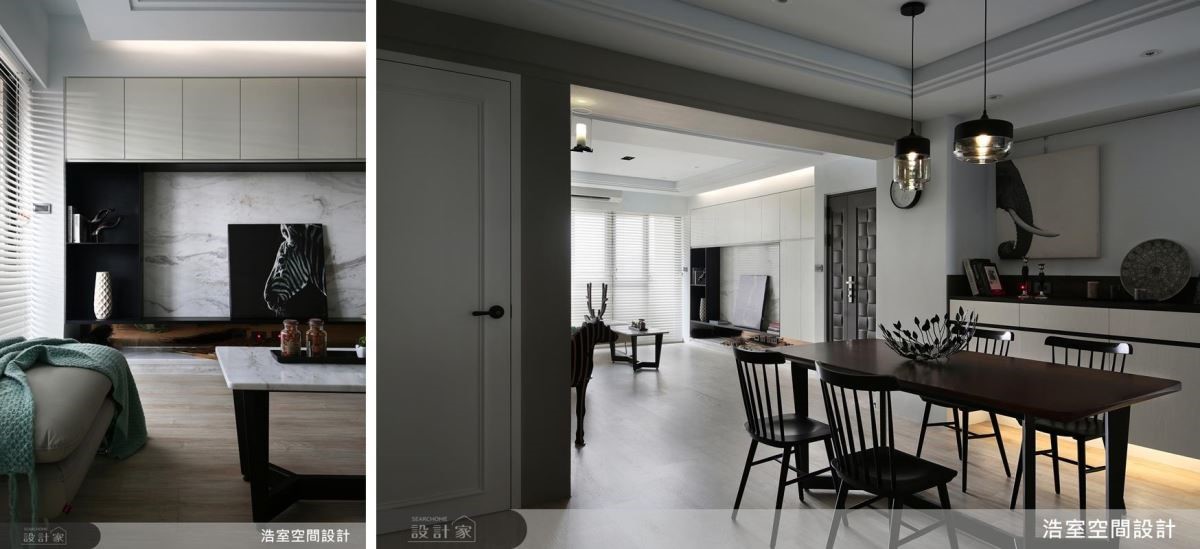 浩室團隊以淺可可色在黑色與白色元素之間做為跳色突顯,連上方樑柱也部分刷上淺可可色,在空間以顏色增添趣味。立體編織紋路的黑色子母大門,也成為壁面的「裝飾」之一,懸吊的餐櫃呼應電視上櫃設計,一個上一個下的間接照明,化解櫃體壓力(右圖)。