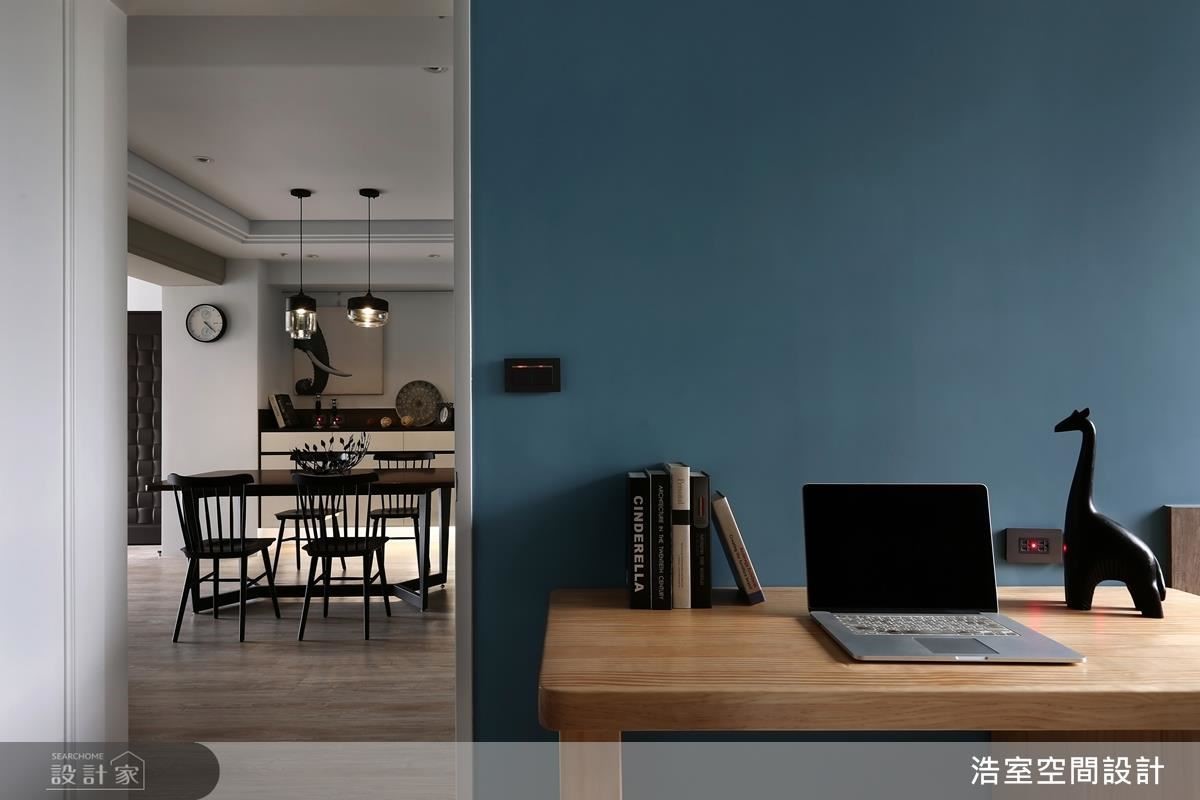 比較少見的淺可可色成為公共空間的主色,搭配白色的天花板及樑柱,增加空間顏色的層次,卻又不至於太過搶眼。略呈長方的屋形在中間處採光較為不足,書房於是打掉半面牆,改以玻璃+鐵件做成假窗隔間,讓光線與視覺穿透,延伸空間感,而在窗口下用餐,有不輸在外面餐廳的氣氛(左圖)。