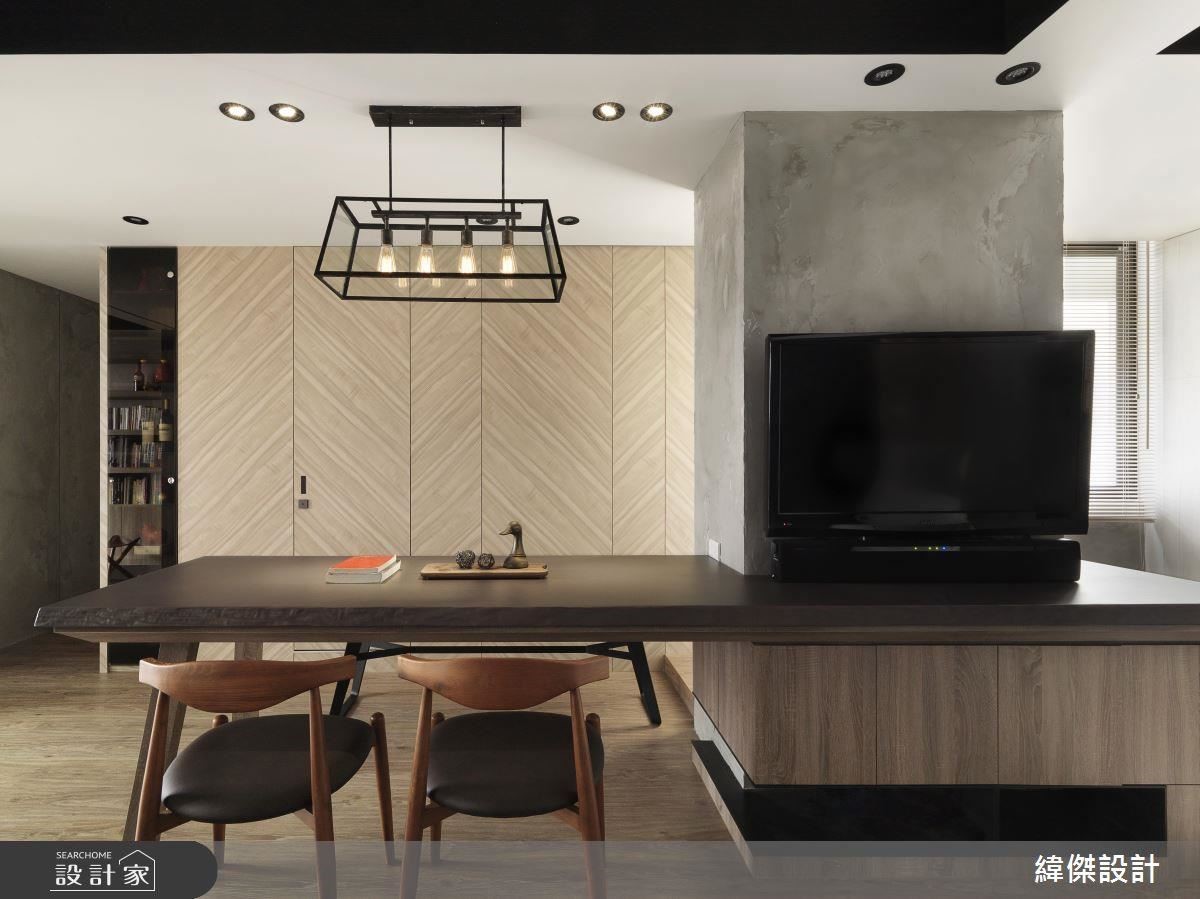 空間原本具有採光不足的問題,過多的暗面形成死角,無法舒展出空間應有的活力,加上明顯矗立的樑柱,帶來壓迫感。設計師針對樑柱所在賦予功能,在視覺與用途上給予轉換。環繞著公共區域樑柱位置所延伸而出中島長桌,成為回字型空間的中心點,工作桌與餐桌雙重用途,增加一家人共同相處的甜蜜時光。利用其中對外的立面作為電視牆,樑柱瞬間轉化為提供視聽功能的一環。靠窗端景區域規劃為閱讀區,拿本書任意坐臥釋放身心觸角,成為最佳充電所在。