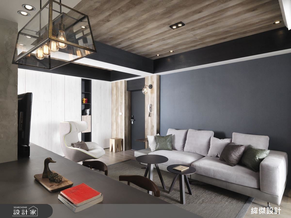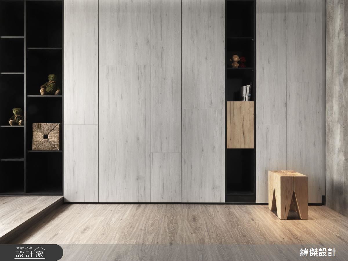 天花板與地面平行的部分塗以明亮白作為主色調,產生提升高度的錯覺,垂直面選搭黑色,具有弱化樑柱壓迫感的作用。收納櫃體隱身於周邊牆面,經由木皮貼合的造型紋路,搭配適度的開放式櫃體,增加壁面律動感與變化性,部分使用水泥粉光增添自然揮灑、不羈的調性,呈現設計師一貫強調的自然質樸、紋理分明,與自然密不可分的居家氛圍。