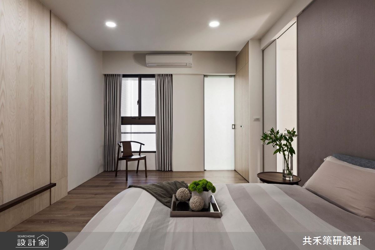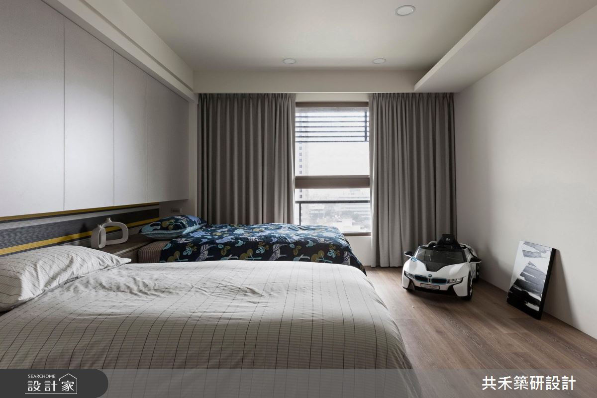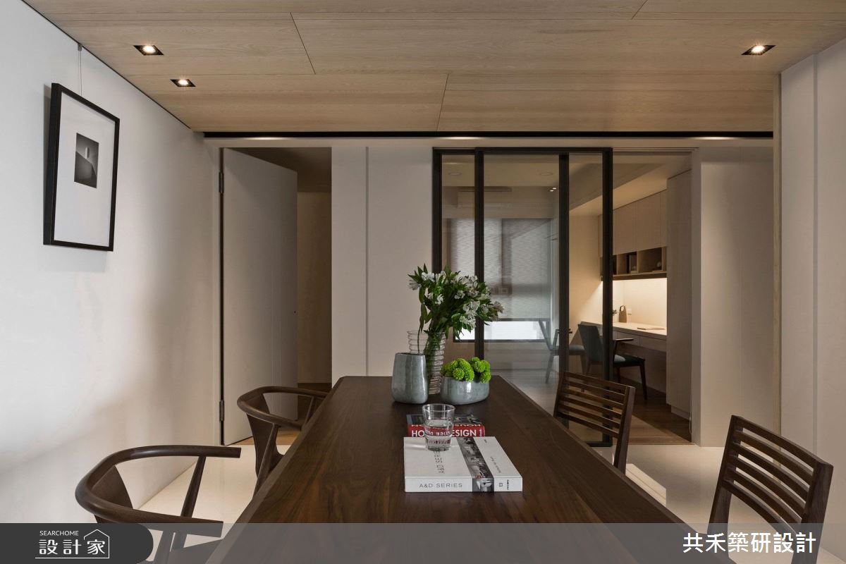 玄關處,規劃明鏡作為全身鏡,搭配通透的灰玻相互輝映,構成唯美的光影表情,創造入門後的輕盈視感;公領域內,則呈現清爽簡約的基調,並考量到大樑的交錯存在,於餐廳天花鋪貼溫潤木皮,除了降低視覺壓迫感之外,也形成場域的氛圍轉換;書房則移除既有的實體隔間,改為配置通透的玻璃門片,形成與餐廳之間的光線、視線交流;同時因順應風水方位,將原先的次臥變為主臥,運用壁紙、木皮交織沉靜色彩,烘托一室的紓壓質地;小孩房則考量到床頭位於橫樑下方,於是銜接收納機能,不僅弱化風水疑慮,更安置了實用輕巧的收納機能!